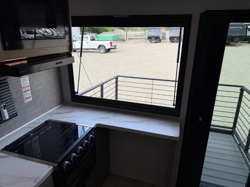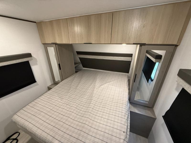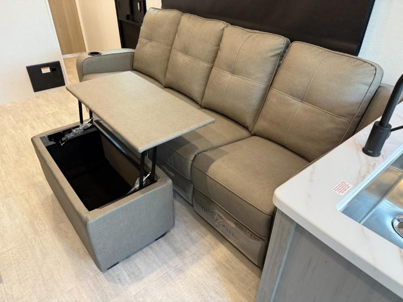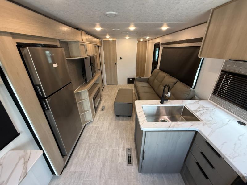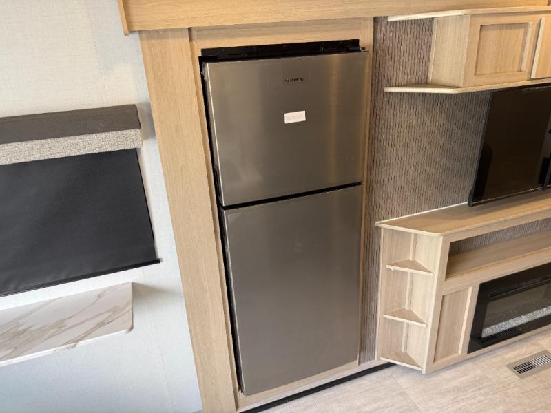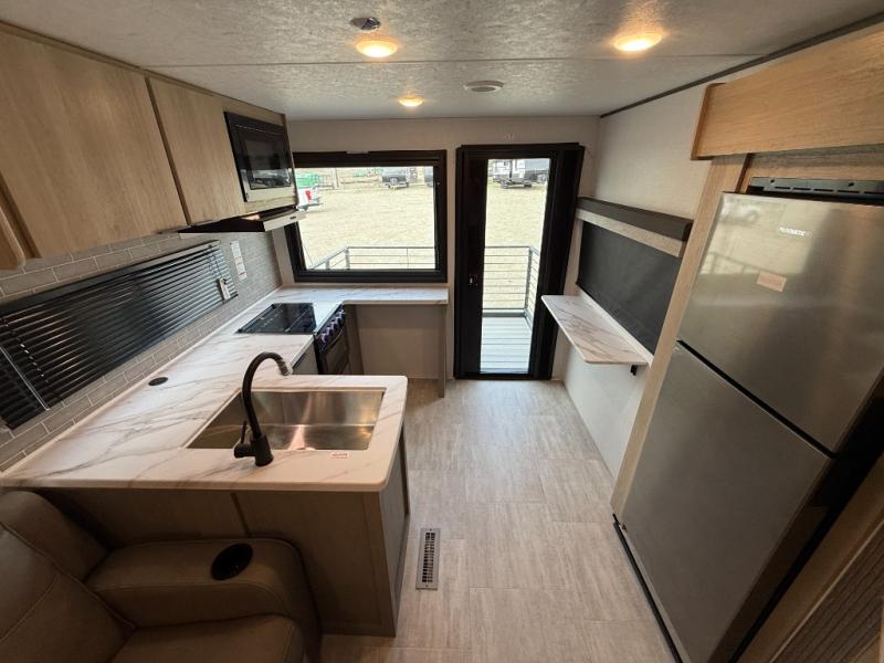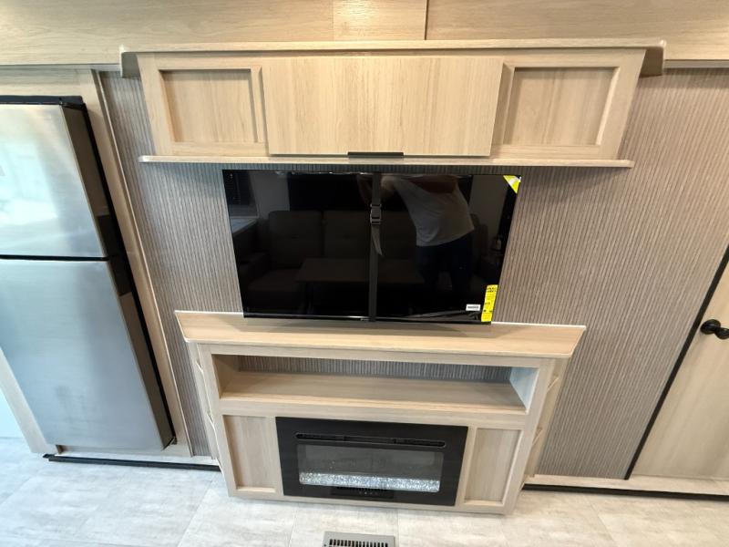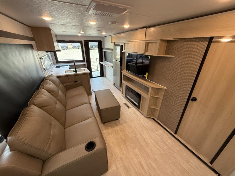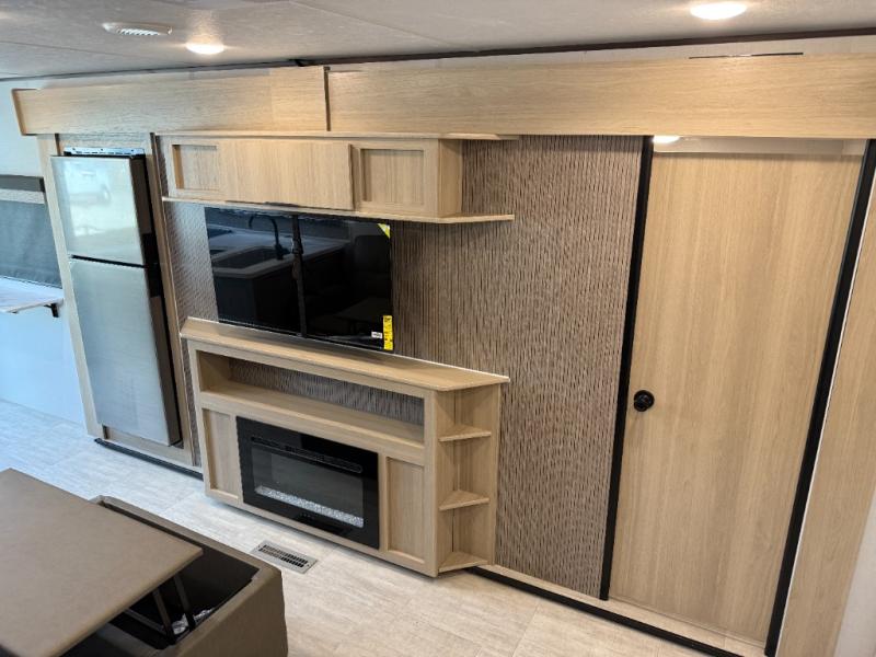 You'll love every minute spent in this spacious travel trailer. There is a front private bedroom with a king bed and dual bedside closets to keep your things organized. The jack knife sofa sits across from the fireplace so you can enjoy your evenings indoors, and the hidden convertible bunk is behind the entertainment center for a smart usage of space! The full kitchen features ample counter space, along with a concession style window, so while the chef is cooking, they can visit with those on the rear fold-down porch.