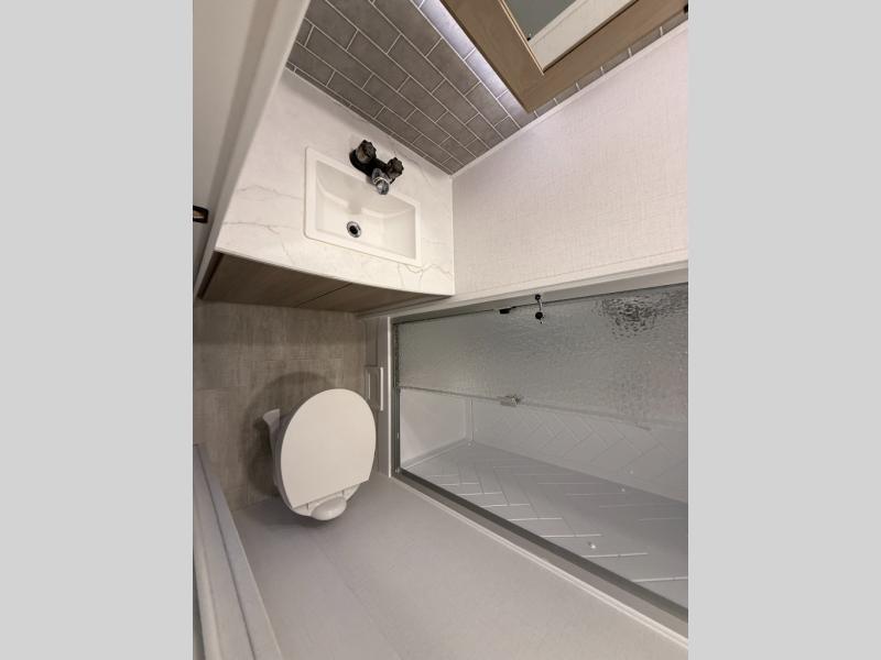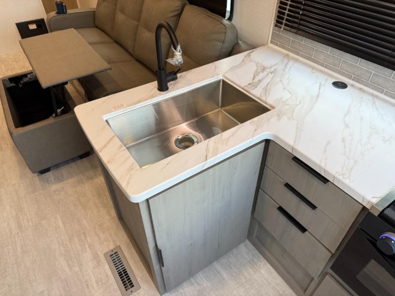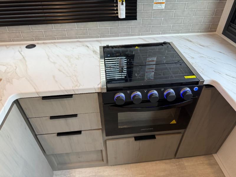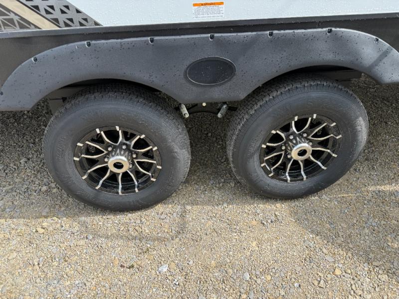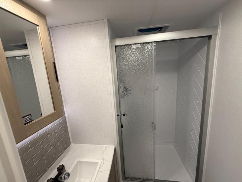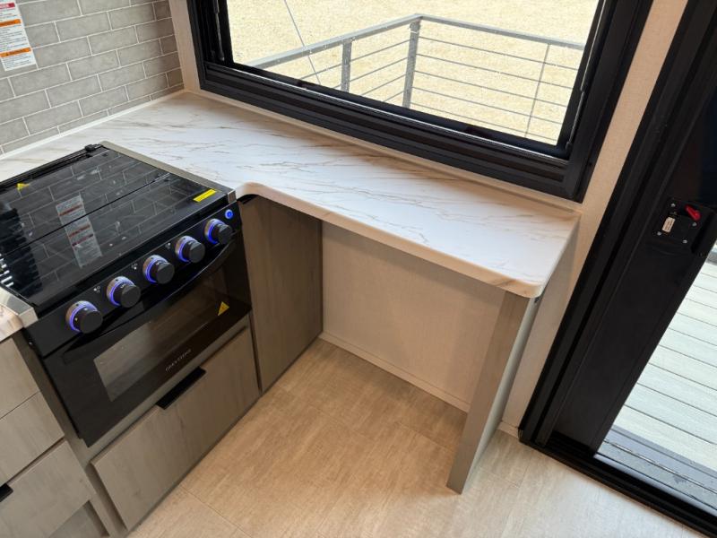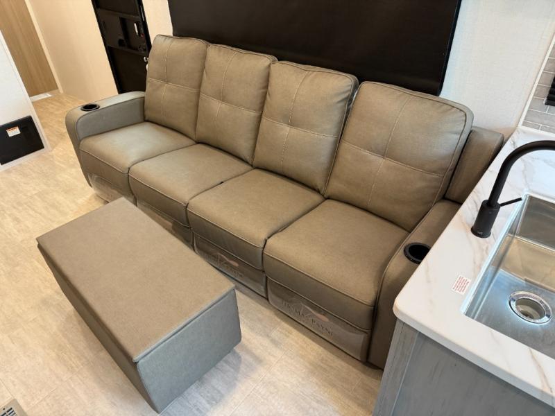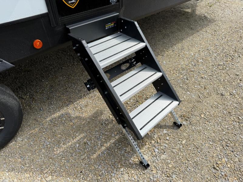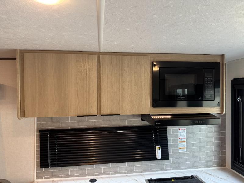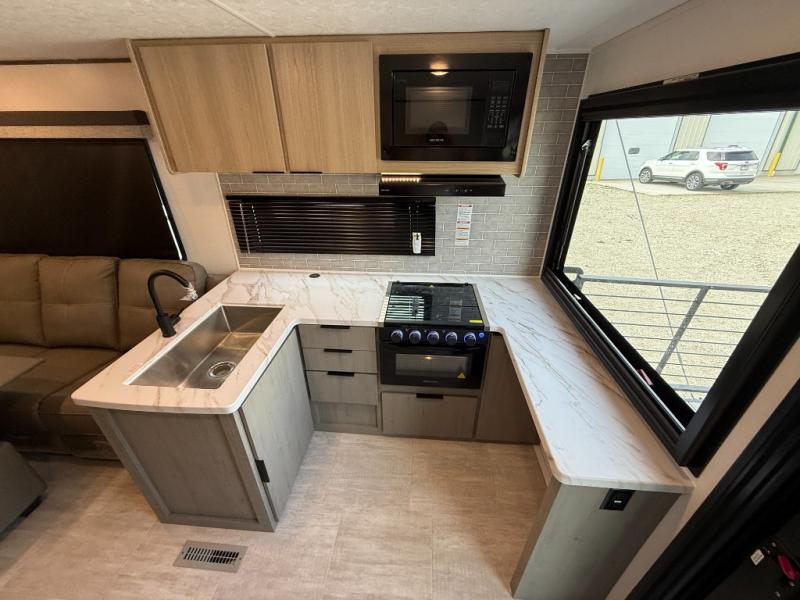 You'll love every minute spent in this spacious travel trailer. There is a front private bedroom with a king bed and dual bedside closets to keep your things organized. The jack knife sofa sits across from the fireplace so you can enjoy your evenings indoors, and the hidden convertible bunk is behind the entertainment center for a smart usage of space! The full kitchen features ample counter space, along with a concession style window, so while the chef is cooking, they can visit with those on the rear fold-down porch.