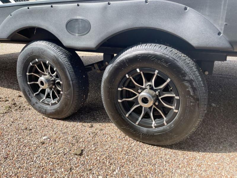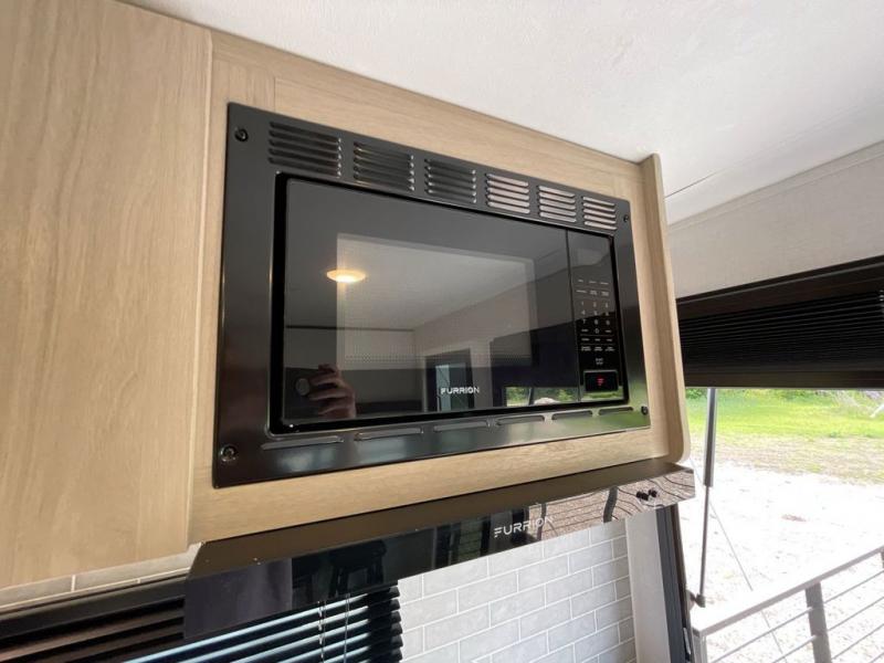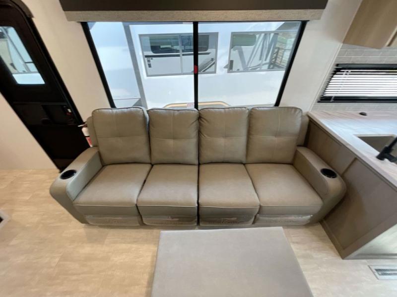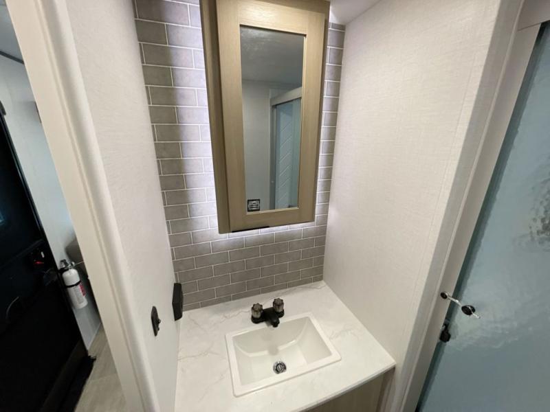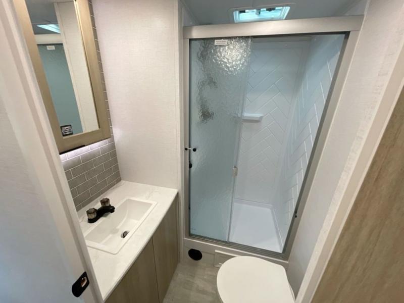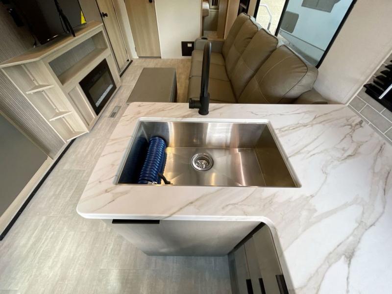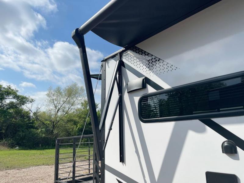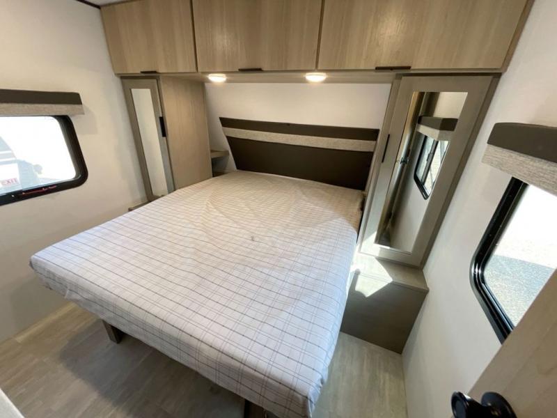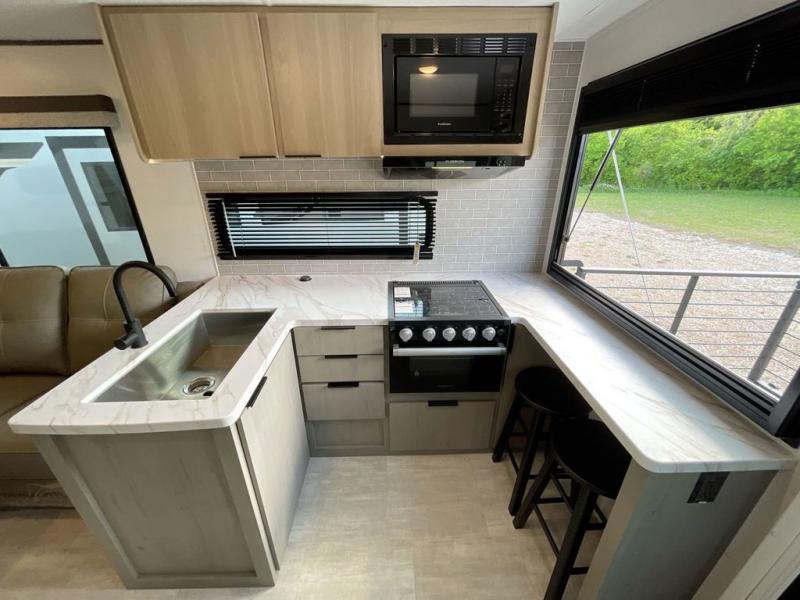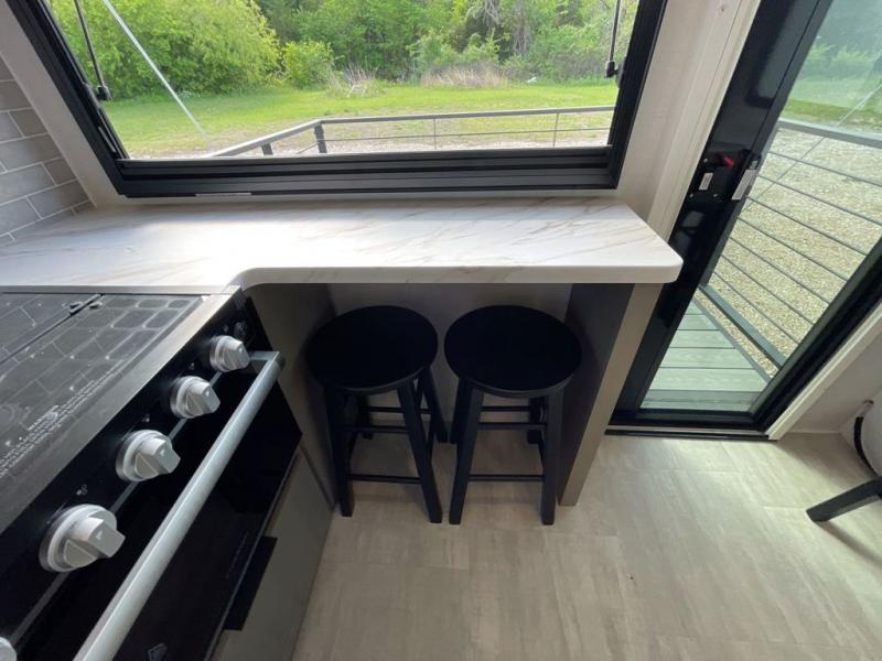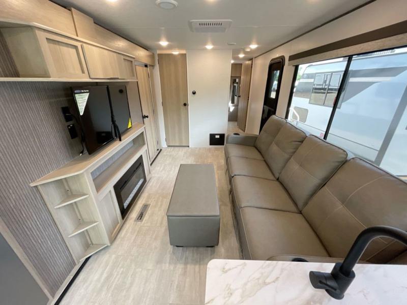You'll love every minute spent in this spacious travel trailer. There is a front private bedroom with a king bed and dual bedside closets to keep your things organized. The jack knife sofa sits across from the fireplace so you can enjoy your evenings indoors, and the hidden convertible bunk is behind the entertainment center for a smart usage of space! The full kitchen features ample counter space, along with a concession style window, so while the chef is cooking, they can visit with those on the rear fold-down porch.