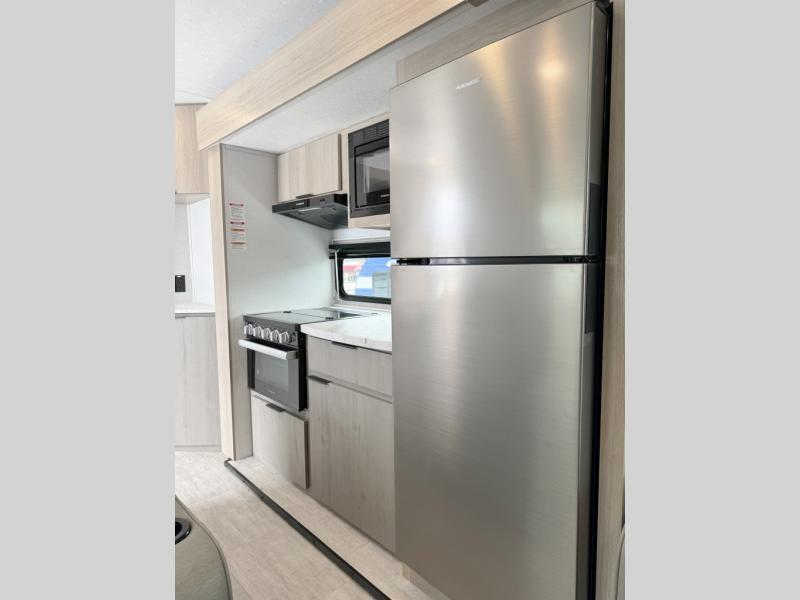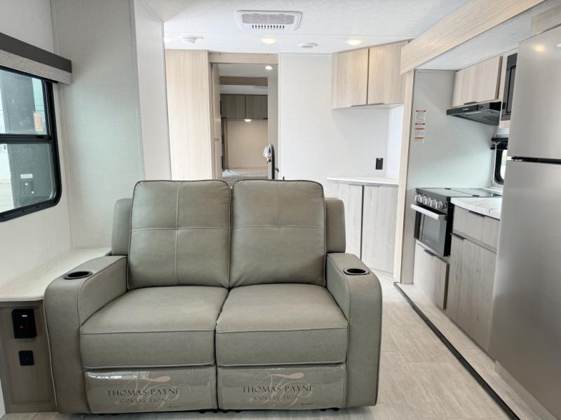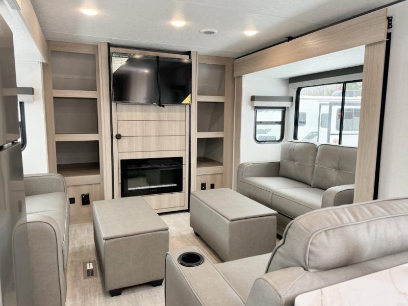 If you're looking for a unique travel trailer, this is the one! The front living area features dual opposing sofa slides, theater seating, and hidden storage behind the entertainment center and fireplace. Your guests can make this their bedroom at night, while you take the queen bed in the rear master bedroom. There is also a walk-thru bath that leads to the bedroom for added convenience. A full kitchen is complete with an oven, microwave, and 10 cu. ft. 12V refrigerator, plus there are two pantries to keep snacks stocked.
