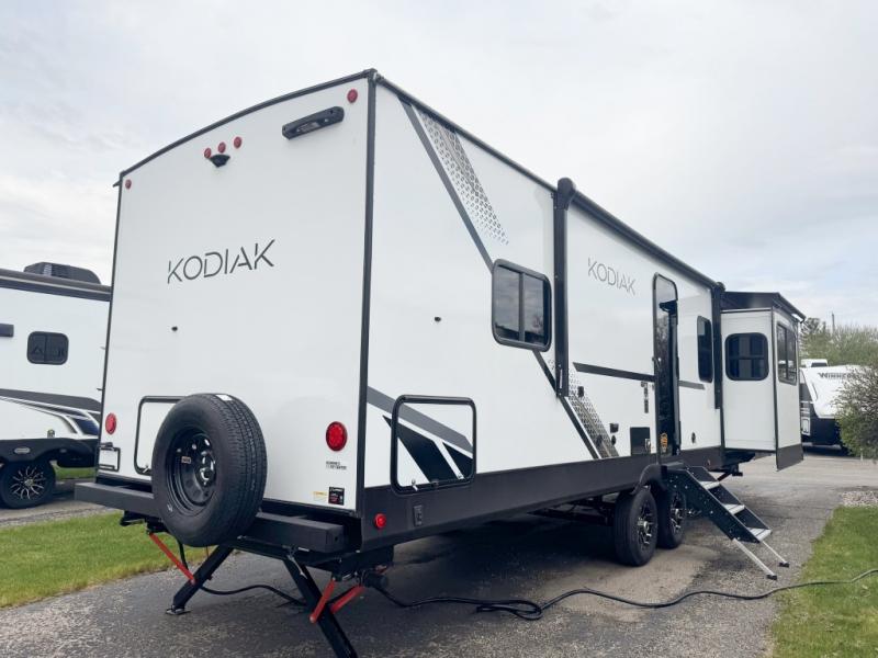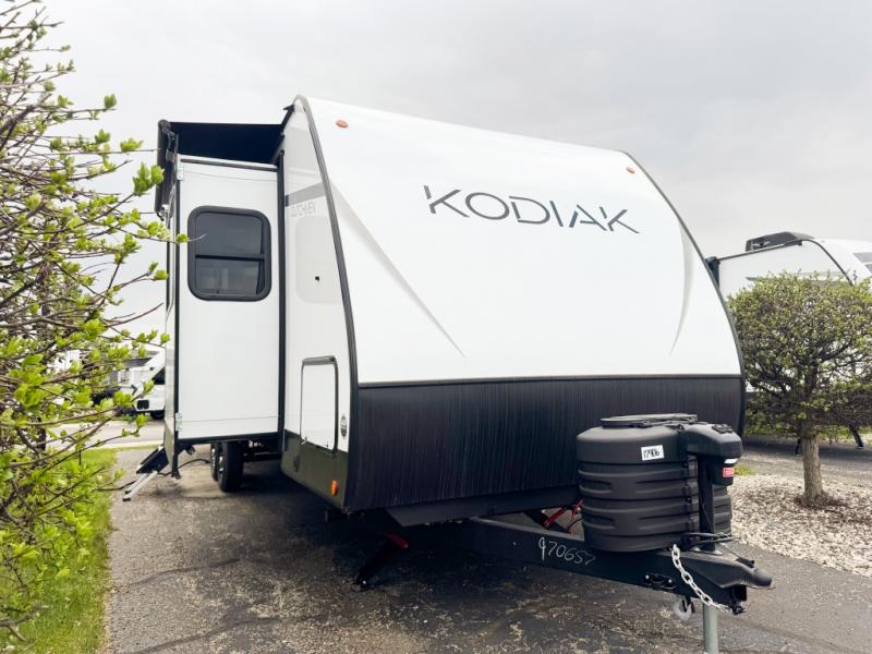 Each Kodiak travel trailer by Dutchmen includes a diamond front plate, easy lube axles, and a power tongue jack for hassle-free towing. The bear cave storage will allow you to bring along all the camp gear, and the power awning with an LED light will create an inviting outdoor space. Head inside to enjoy the designer valances, blackout roller shades, and seamless countertops. There is also HyperDeck flooring that will withstand your many adventures plus a 6' 8" interior height for more head room. A high output furnace and 13.5k BTU A/C will keep you comfortable, and the on-demand tankless water heater will provide instant hot water when you need it!