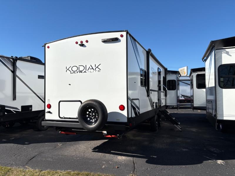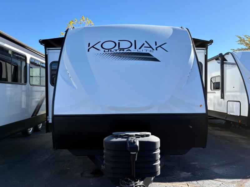 Each Kodiak travel trailer by Dutchmen includes a diamond front plate, easy lube axles, and a power tongue jack for hassle-free towing. The bear cave storage will allow you to bring along all the camp gear, and the power awning with an LED light will create an inviting outdoor space. Head inside to enjoy the designer valances, blackout roller shades, and seamless countertops. There is also HyperDeck flooring that will withstand your many adventures plus a 6' 8" interior height for more head room. A high output furnace and 13.5k BTU A/C will keep you comfortable, and the on-demand tankless water heater will provide instant hot water when you need it!