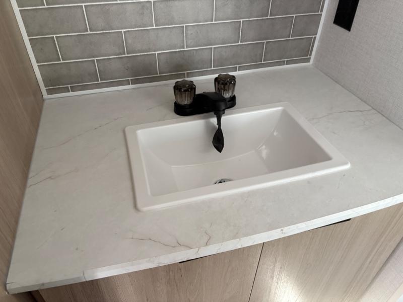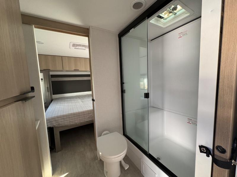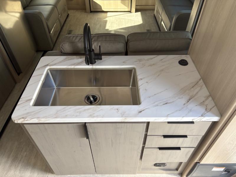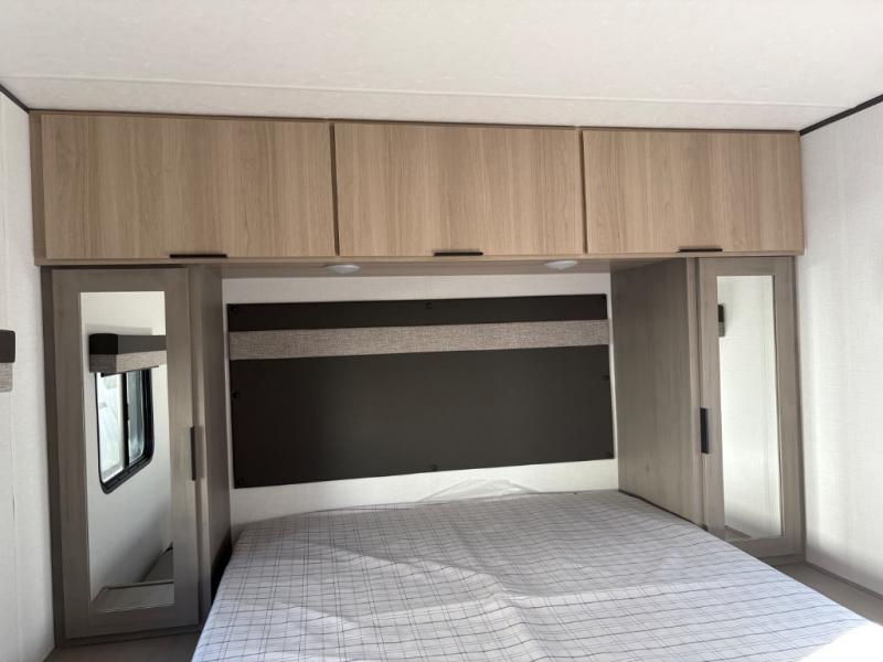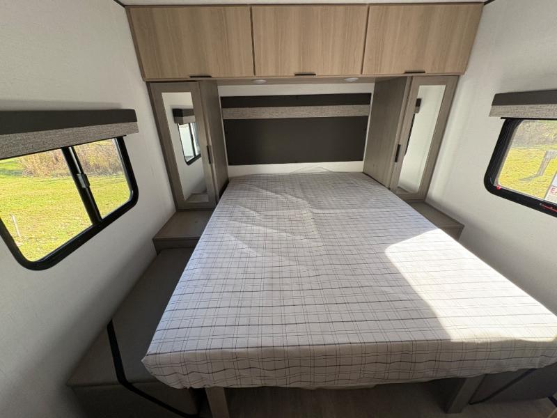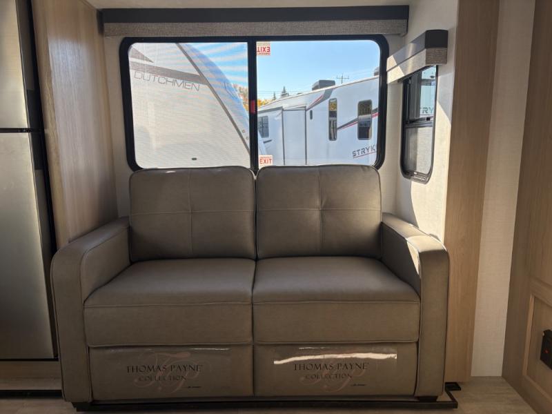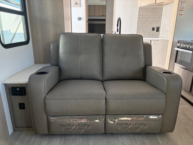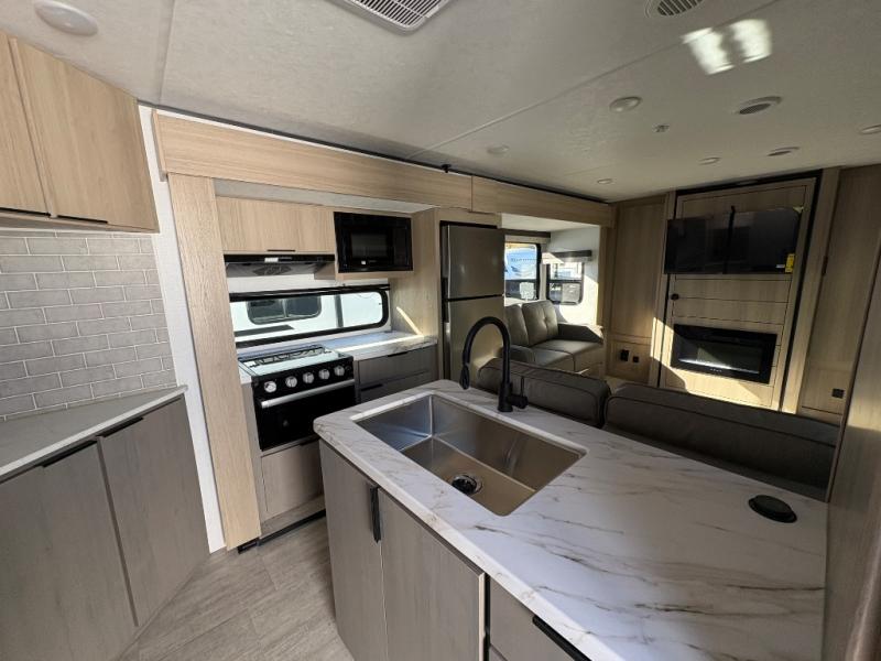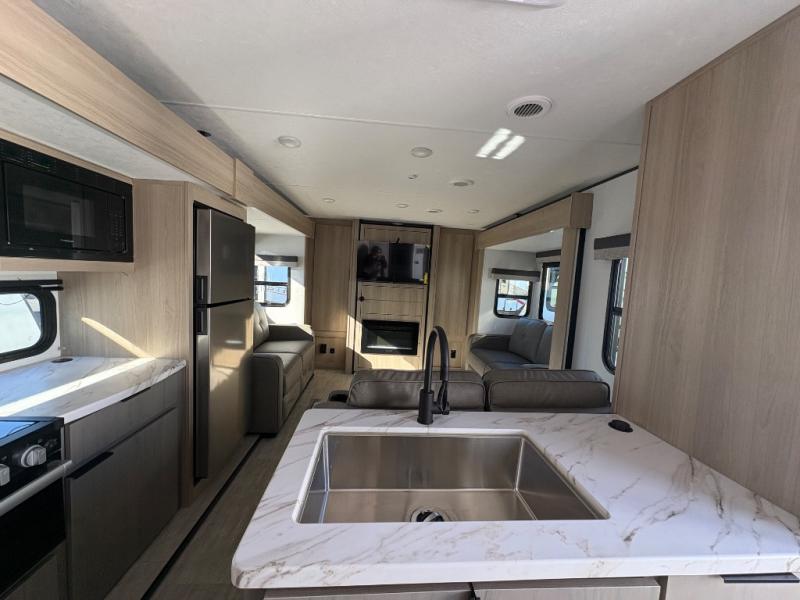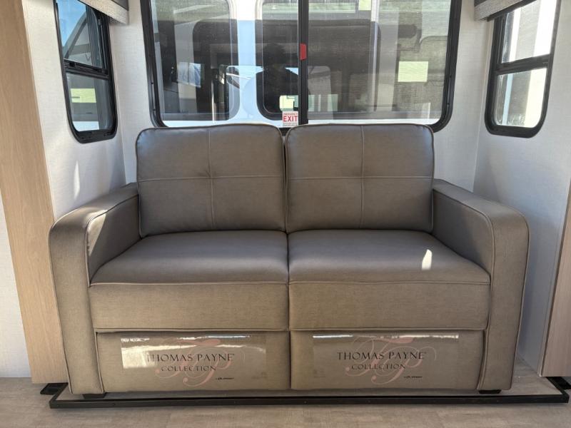 If you're looking for a unique travel trailer, this is the one! The front living area features dual opposing sofa slides, theater seating, and hidden storage behind the entertainment center and fireplace. Your guests can make this their bedroom at night, while you take the queen bed in the rear master bedroom. There is also a walk-thru bath that leads to the bedroom for added convenience. A full kitchen is complete with an oven, microwave, and 10 cu. ft. 12V refrigerator, plus there are two pantries to keep snacks stocked.