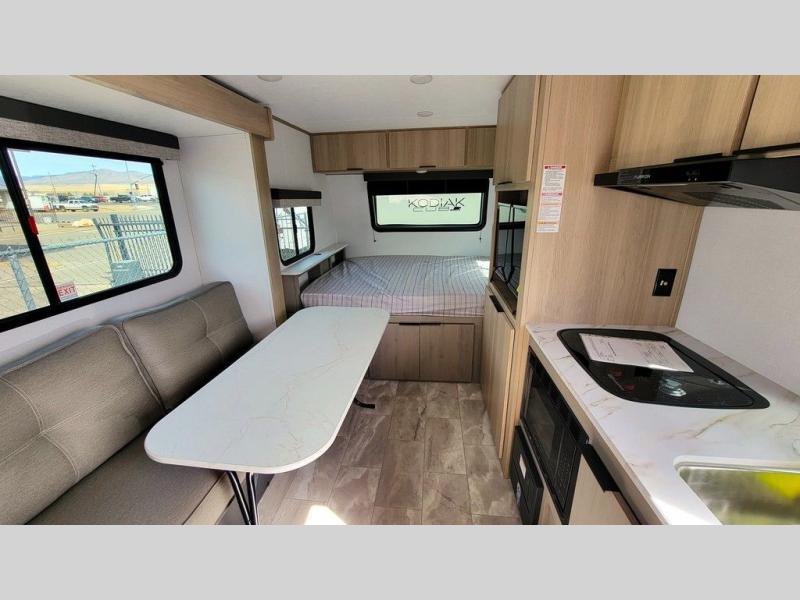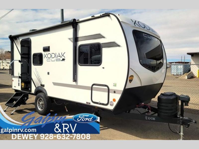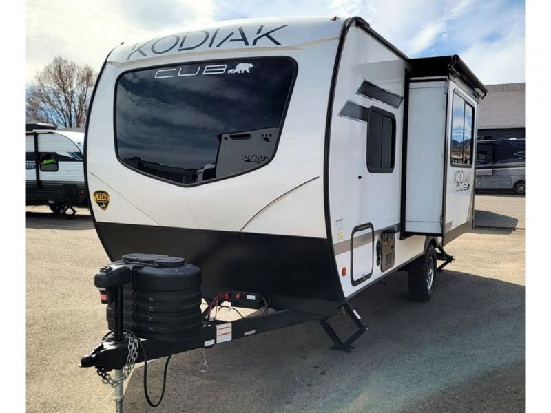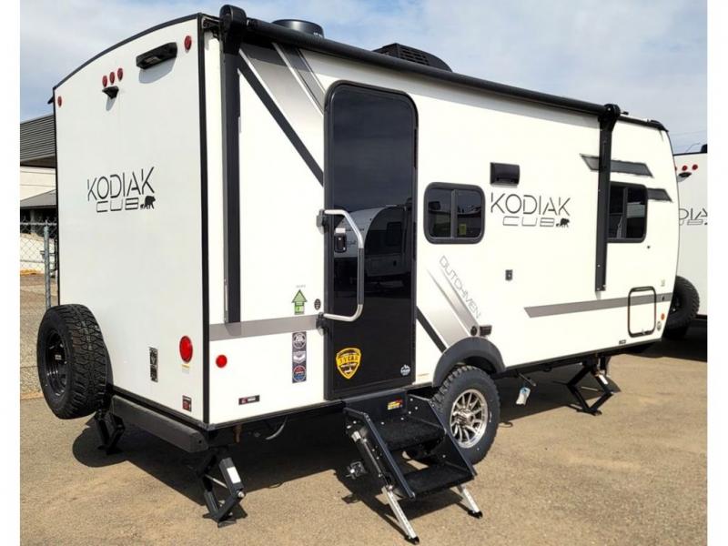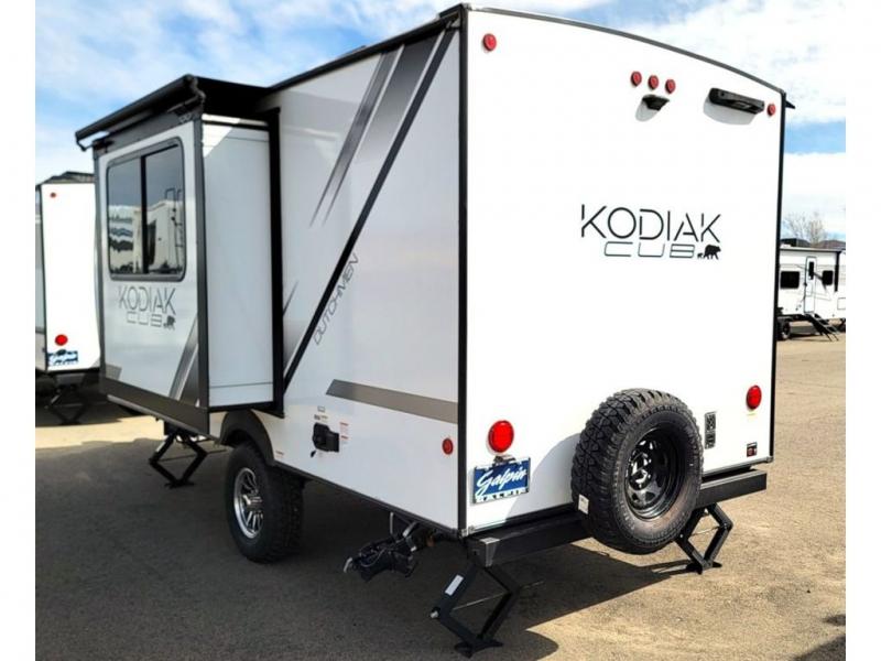 With any Kodiak Cub travel trailer by Dutchmen, you will enjoy lightweight towing and at-home comforts! Each model is constructed with aluminum framing and a laminated roof, plus front diamond plate protection against rock and debris. You will also find a power tongue jack outside, along with hybrid aluminum steps, plus electric front and rear stabilizer jacks for easy set-up. Head inside to enjoy the roller night shades, Home Series interior decor collection, and seamless countertops. There is also a central command center, a Bluetooth speaker, HyperDeck flooring, plus a furnace and A/C unit to keep you comfortable year around!