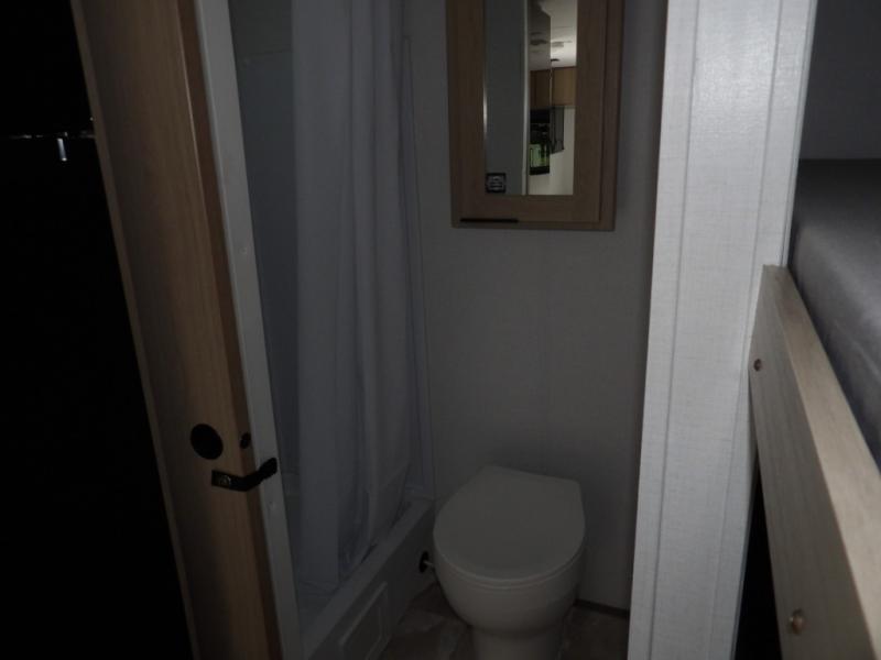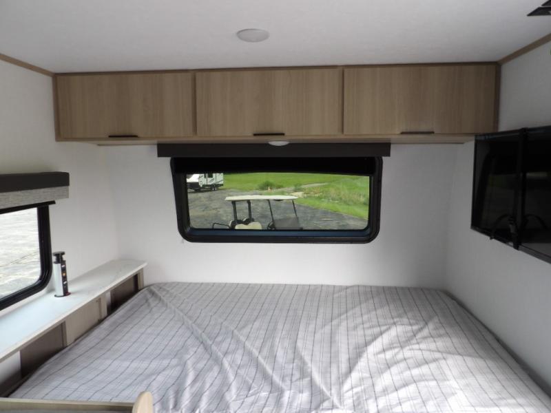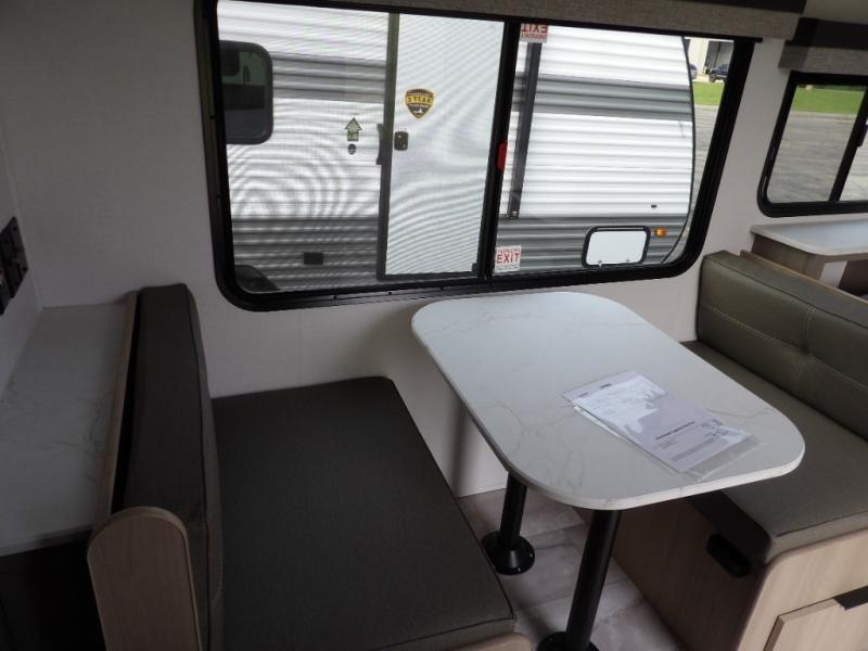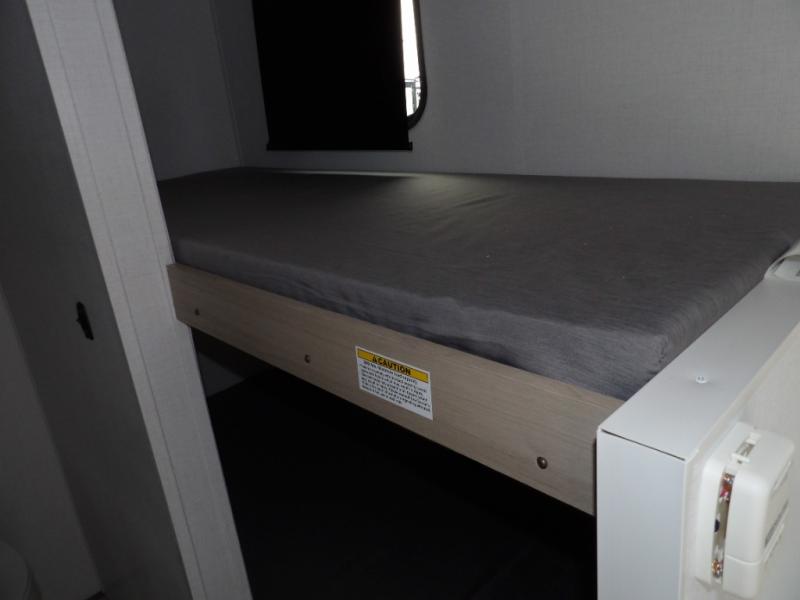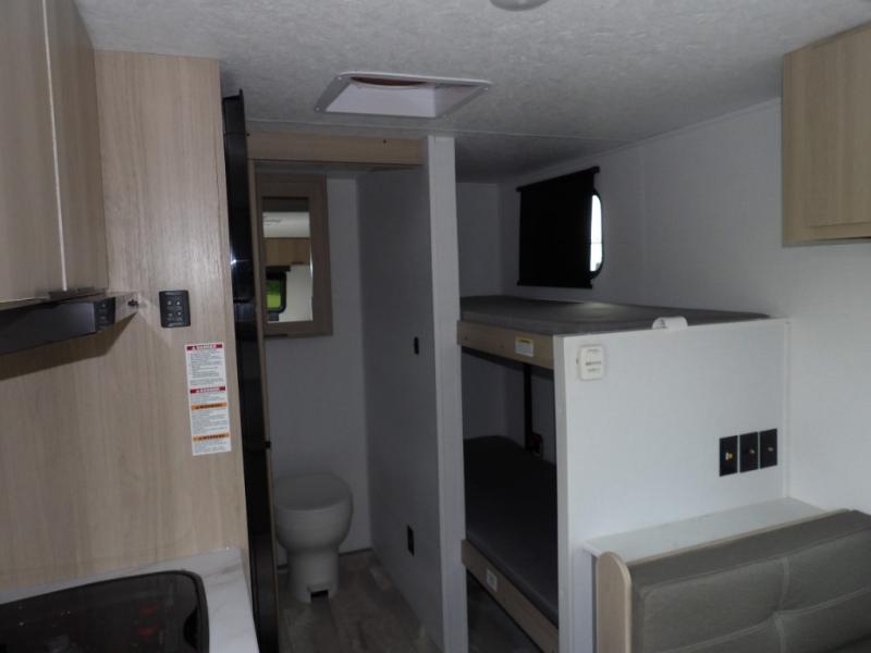 Pack your bags and head to your local state park in this travel trailer for five! There is a set of bunk beds in the rear corner and a private bath in the other rear corner for easy nighttime use. After you've made lunch on the two burner cooktop, you can dine at the booth dinette, or you can take your plate outdoors to sit under the 12' awning. When it's time to call it a night, the front queen bed will provide a great night's rest, while your guests take the bunks and dinette!