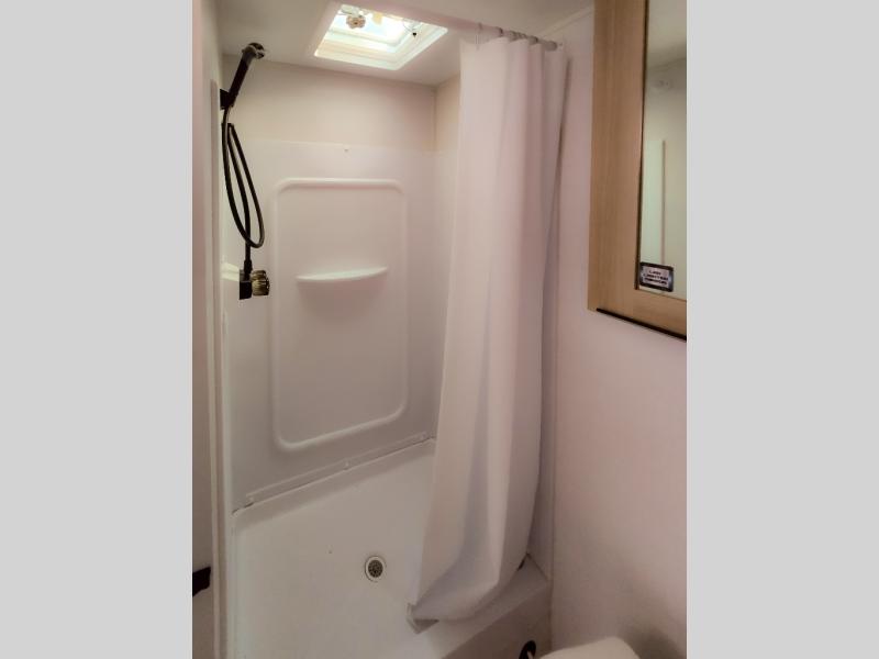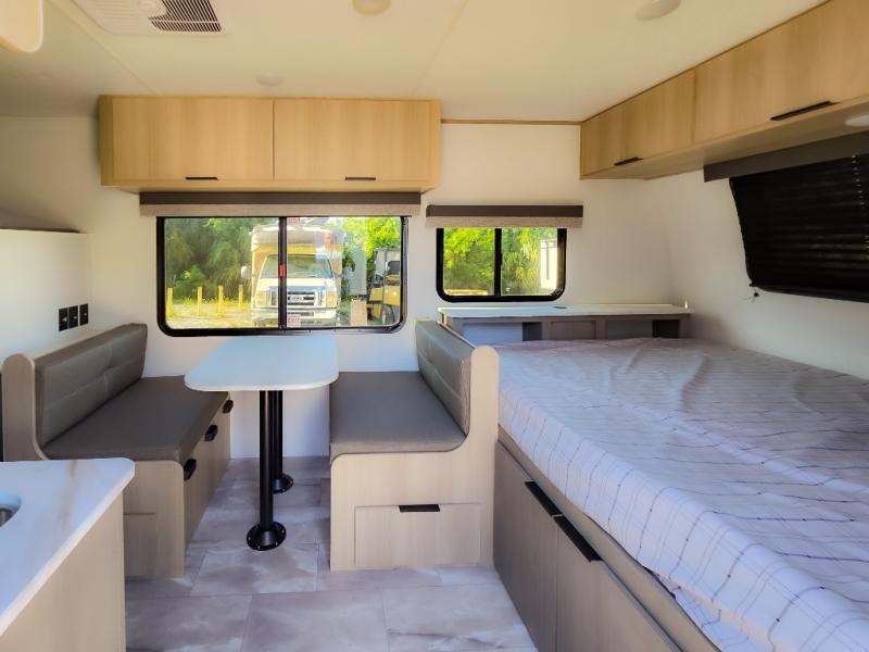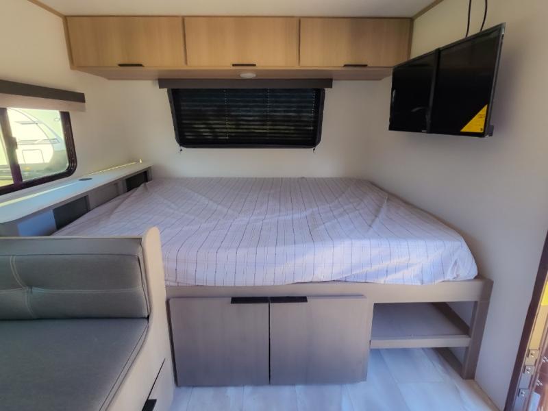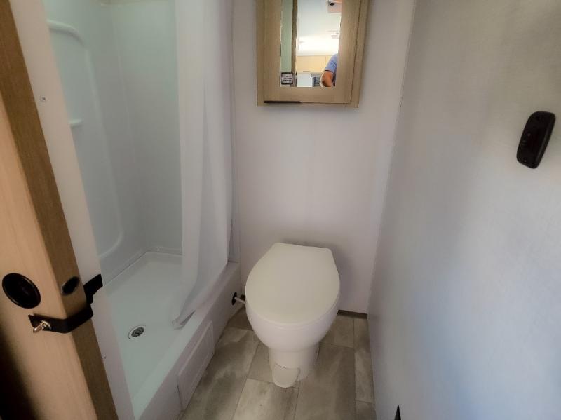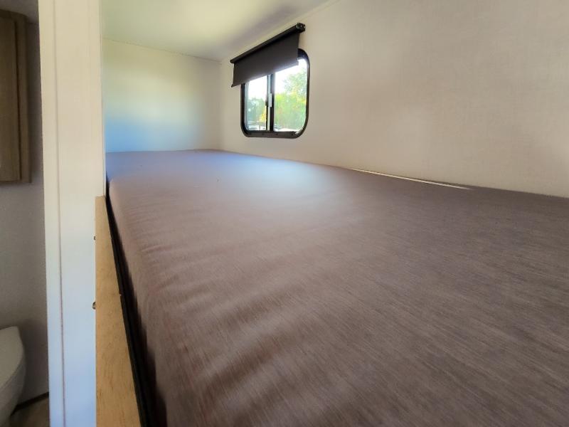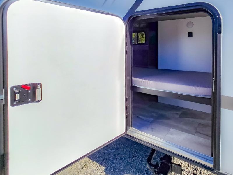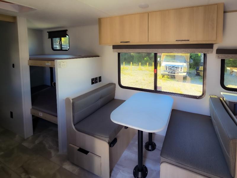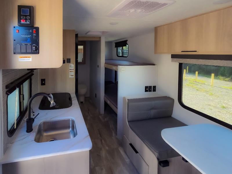 Pack your bags and head to your local state park in this travel trailer for five! There is a set of bunk beds in the rear corner and a private bath in the other rear corner for easy nighttime use. After you've made lunch on the two burner cooktop, you can dine at the booth dinette, or you can take your plate outdoors to sit under the 12' awning. When it's time to call it a night, the front queen bed will provide a great night's rest, while your guests take the bunks and dinette!