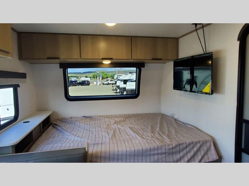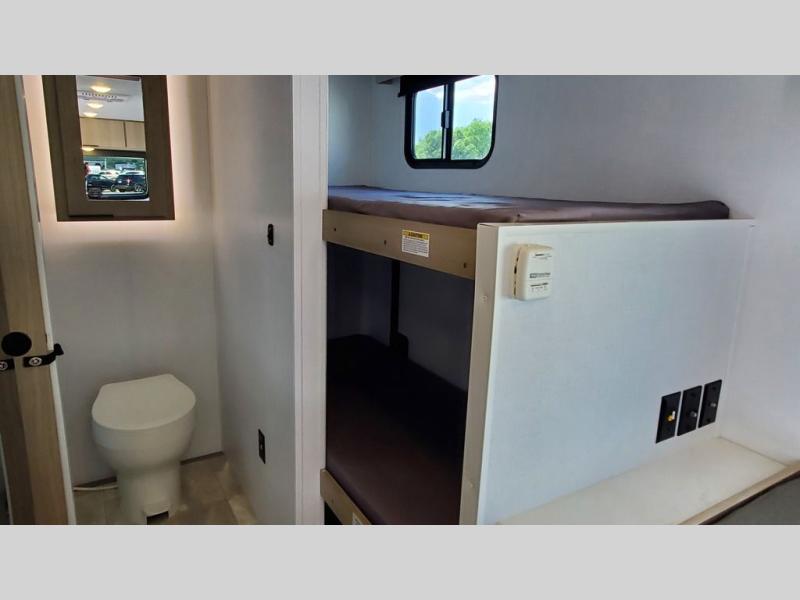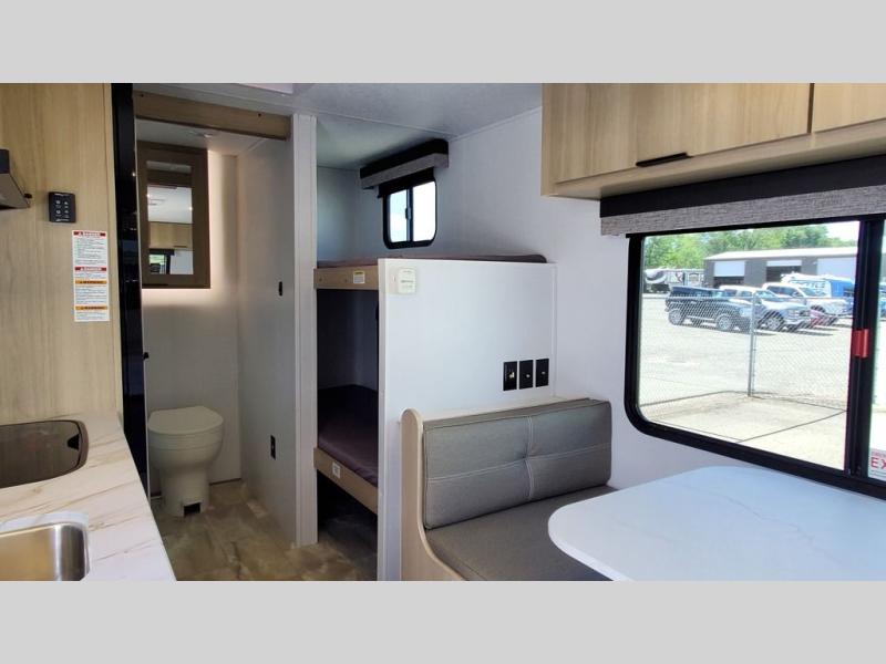 Pack your bags and head to your local state park in this travel trailer for five! There is a set of bunk beds in the rear corner and a private bath in the other rear corner for easy nighttime use. After you've made lunch on the two burner cooktop, you can dine at the booth dinette, or you can take your plate outdoors to sit under the 12' awning. When it's time to call it a night, the front queen bed will provide a great night's rest, while your guests take the bunks and dinette!