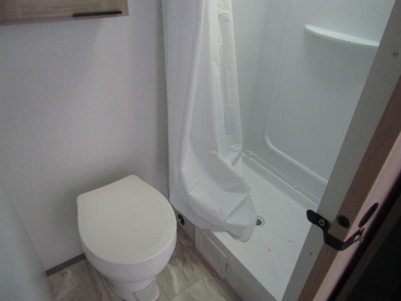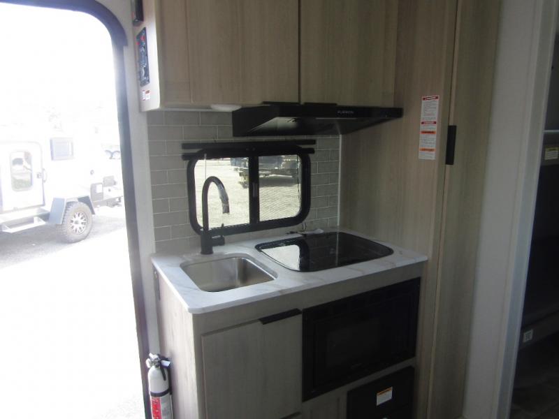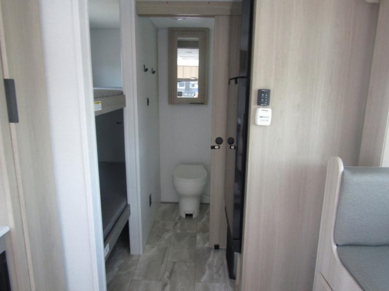 Pack your bags and head to your local state park in this travel trailer for five! There is a set of bunk beds in the rear corner and a private bath in the other rear corner for easy nighttime use. After you've made lunch on the two burner cooktop, you can dine at the booth dinette slide out, or you can take your plate outdoors to sit under the 14' awning. When it's time to call it a night, the front queen bed will provide a great night's rest, while your guests take the bunks and dinette!