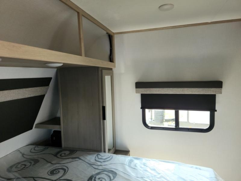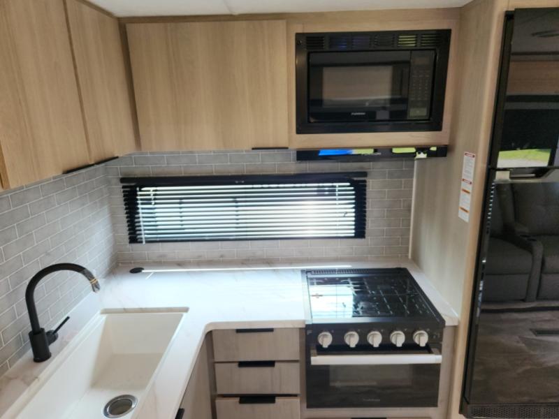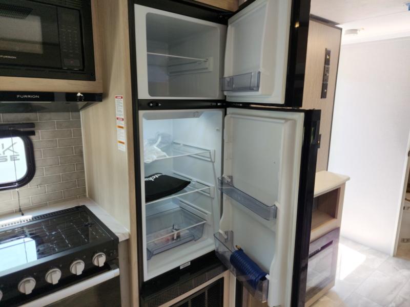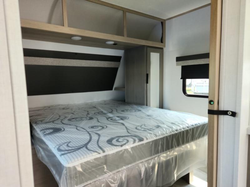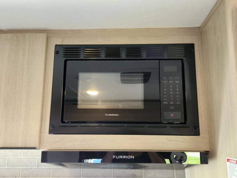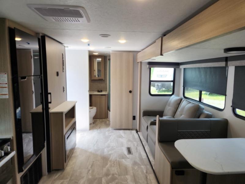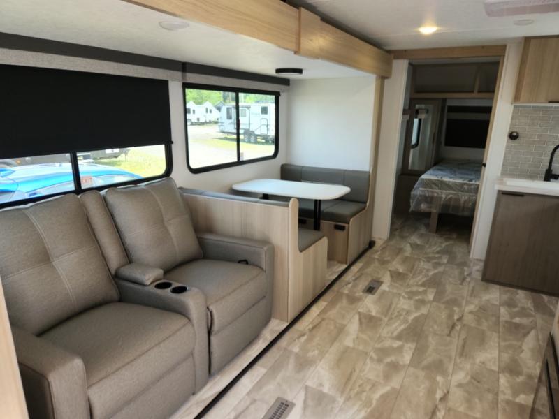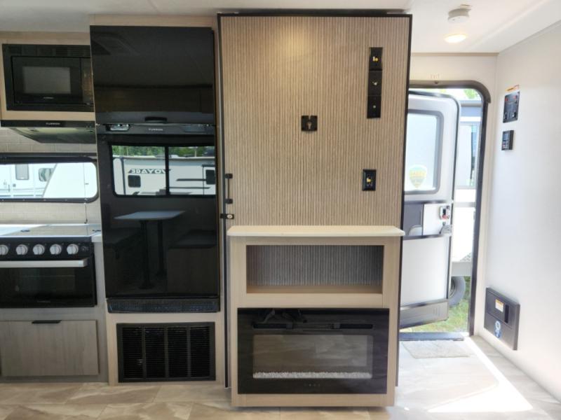 This travel trailer is ready to provide you with a home-like environment while you're at the campground. You can prepare meals each day on the two burner cooktop or in the microwave oven, and there is a 10 cu. ft. 12V refrigerator for perishables. Dine at the booth dinette or take your plate outdoors to sit under the 14' power awning with LED lights. There are also theater seats inside if you want to stay close to the fireplace with a good book instead. The full rear bath includes plenty of storage space, and the front private bedroom with a queen bed will feel just like home!