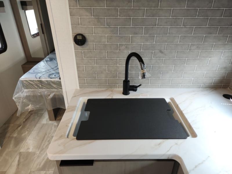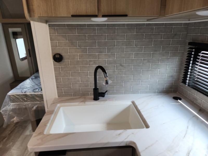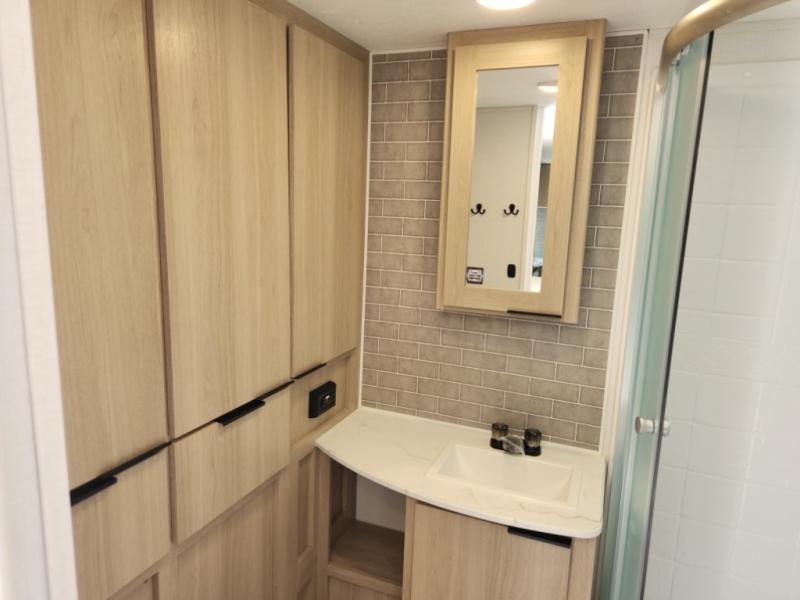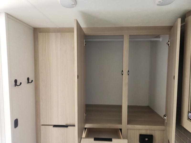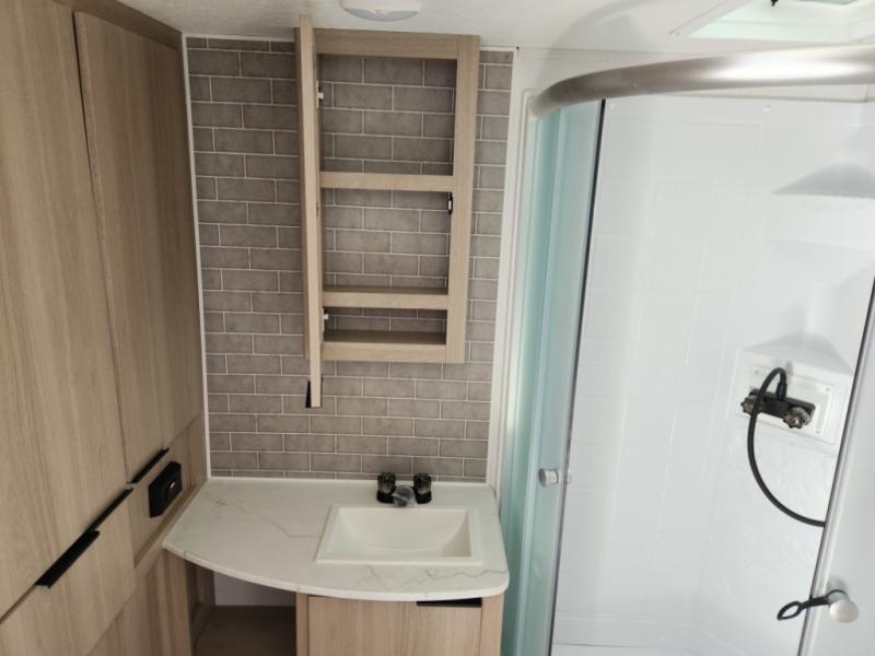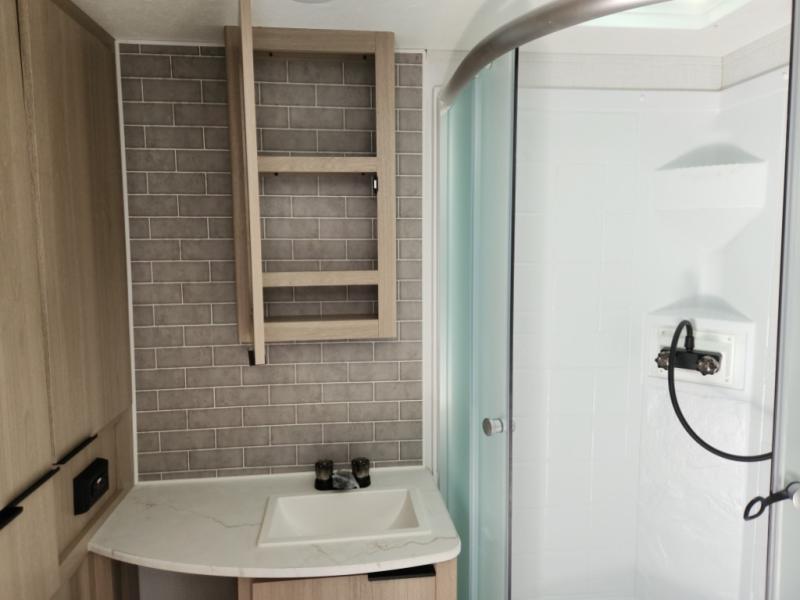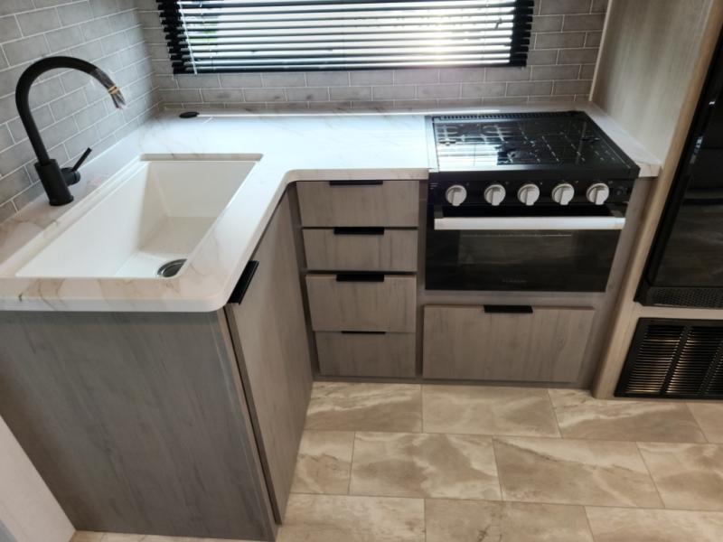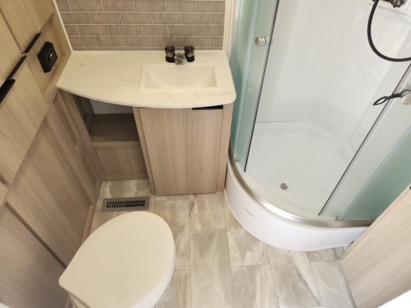 This travel trailer is ready to provide you with a home-like environment while you're at the campground. You can prepare meals each day on the two burner cooktop or in the microwave oven, and there is a 10 cu. ft. 12V refrigerator for perishables. Dine at the booth dinette or take your plate outdoors to sit under the 14' power awning with LED lights. There are also theater seats inside if you want to stay close to the fireplace with a good book instead. The full rear bath includes plenty of storage space, and the front private bedroom with a queen bed will feel just like home!