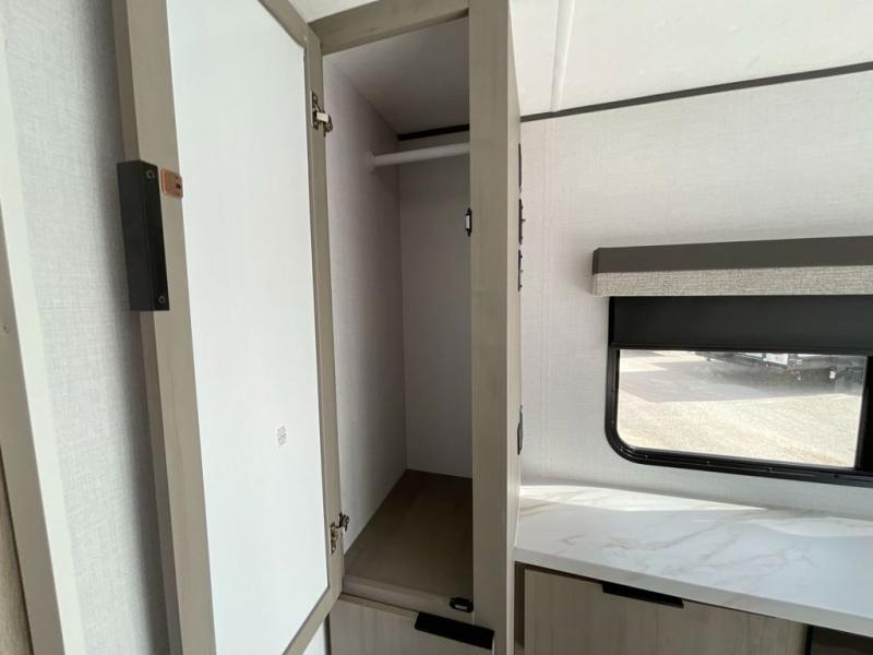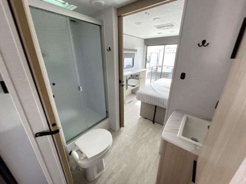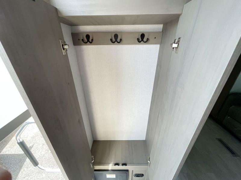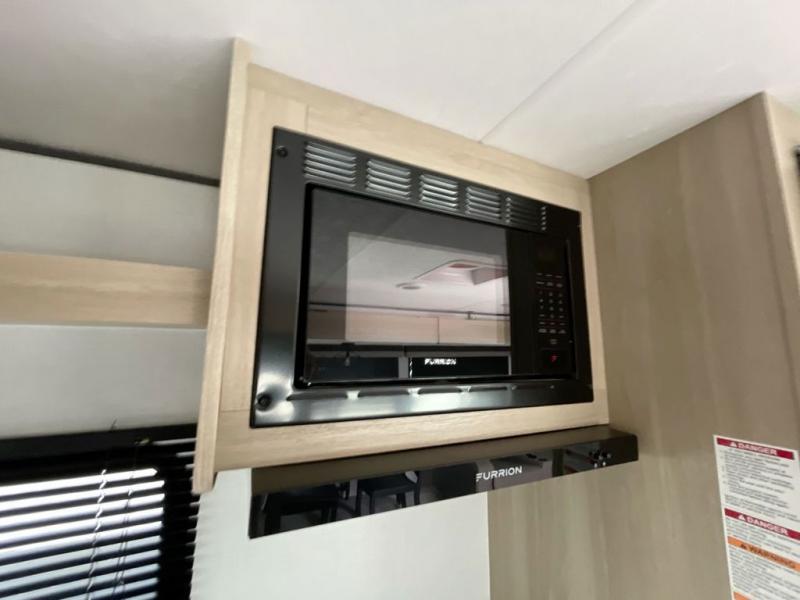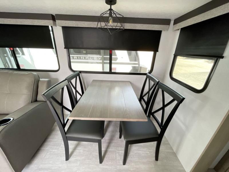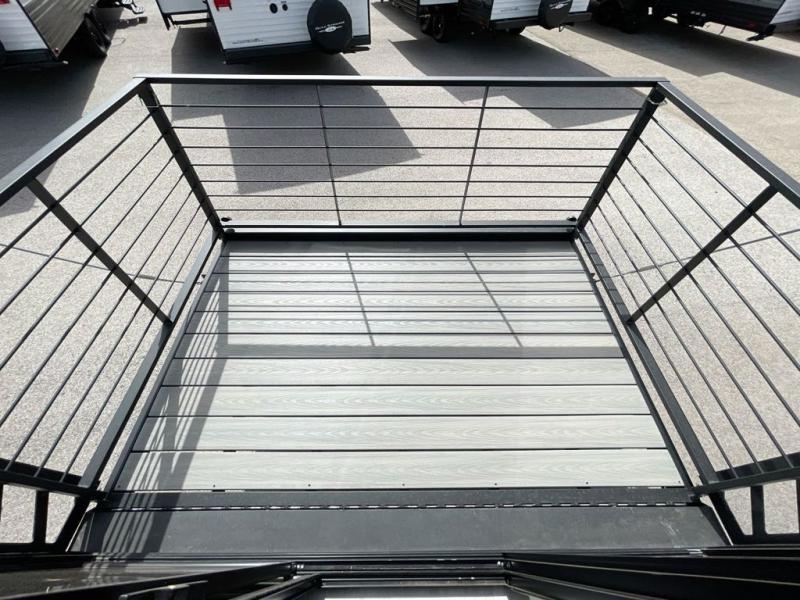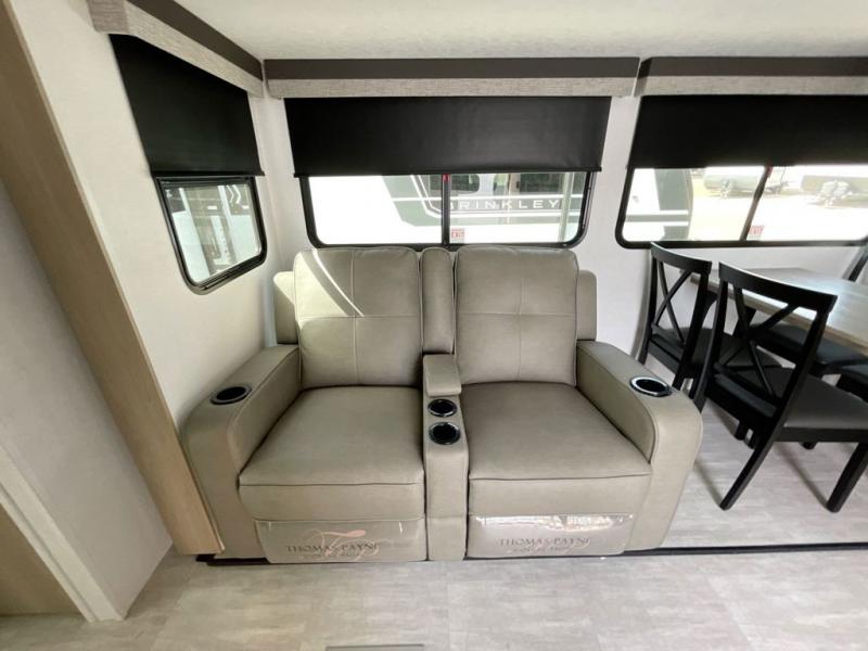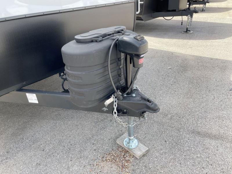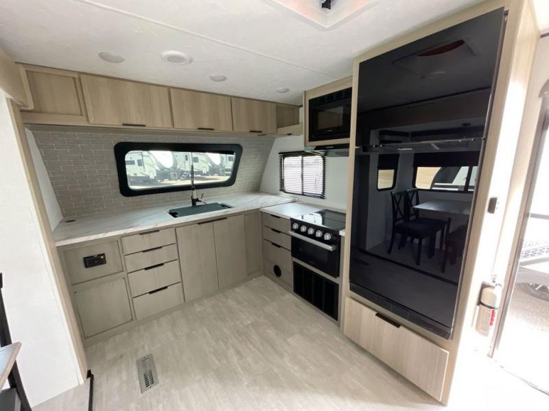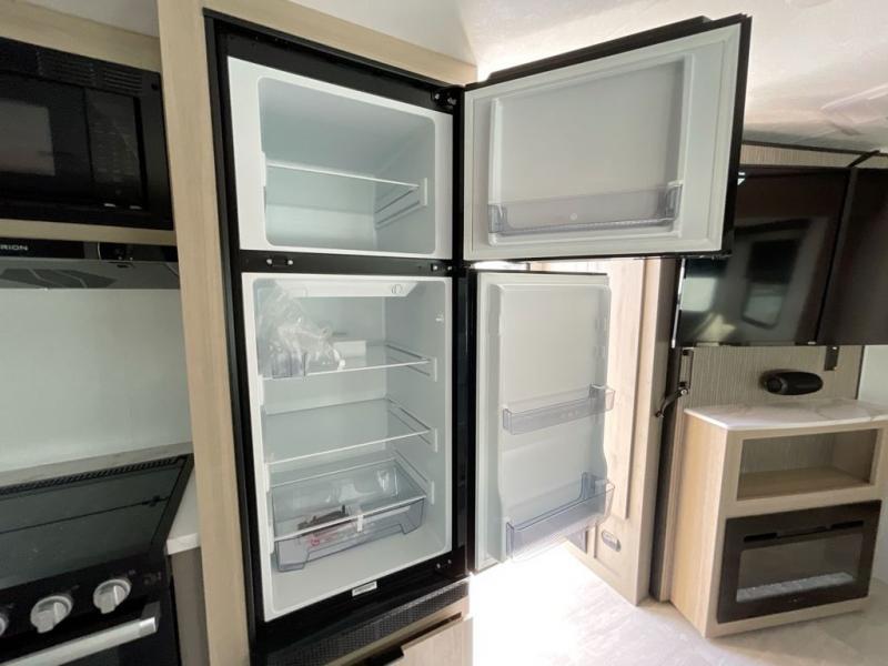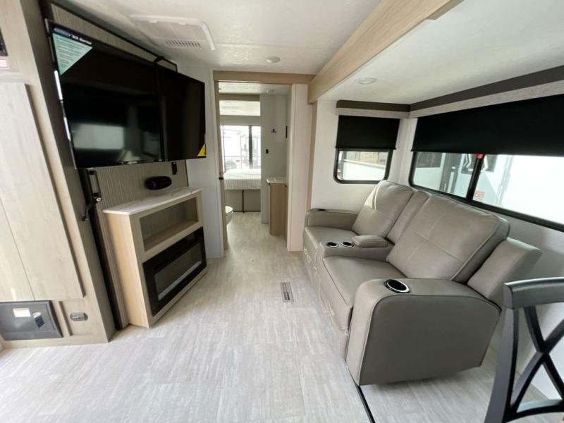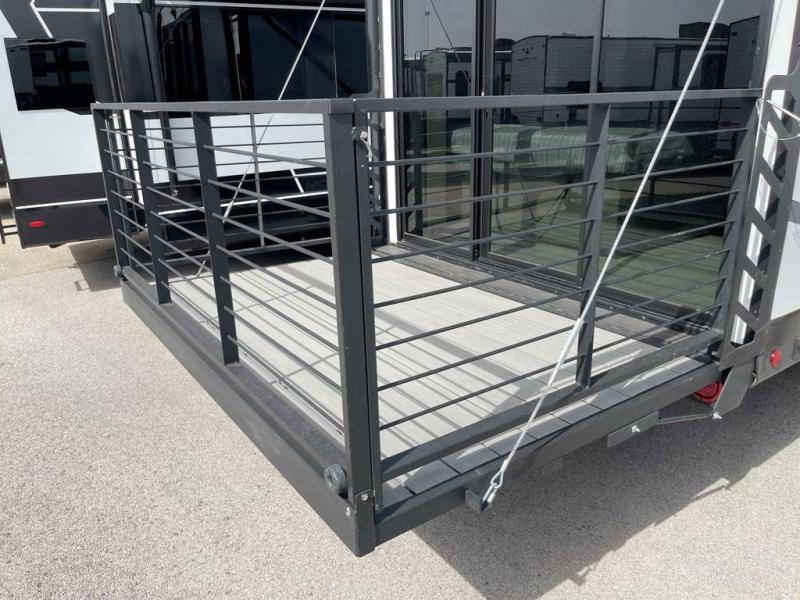 There is much to love in this travel trailer! Starting with the fold down porch in the rear by the private bedroom for added convenience. The walk through bath has a linen closet for your toiletries and a shower with a skylight for added natural lighting as you freshen up each morning. You can sleep soundly on the king bed slide and relax in front of the bedroom fireplace or in front of the hinged entertainment center with a hidden pantry behind it and a fireplace below it. The chef of your group will have ample counter space in the front kitchen to prep meals, plus there is a 10 cu. ft. refrigerator to store perishables. After dinner, get comfortable on the theater seating with footrests or play a game at the booth dinette. Or you may just want to relax outdoors under the power awning with LED lights!