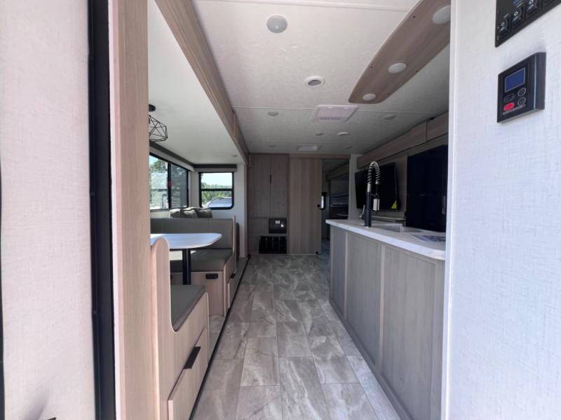 A private bunkhouse makes this travel trailer the perfect family-friendly RV. Or if you like to camp with friends, they will enjoy their own space each night here. Everyone can gather in the main living room to dine at the booth dinette or relax on the jack knife sofa in front of the fireplace if the weather isn't cooperating. If the sun is out, you will probably find the chef of your group outdoors at the outside kitchen grilling up some burgers under the 18' power awning. There is plenty of storage space for all your belongings, including an exterior pass-through storage for your larger gear. You and your spouse will have the front master bedroom all to yourselves with a king bed for comfort!
