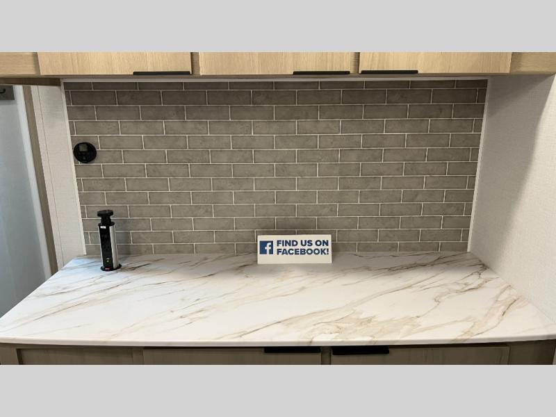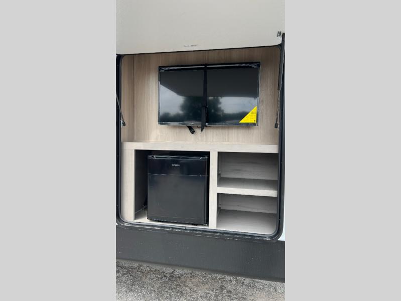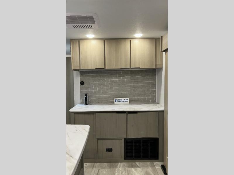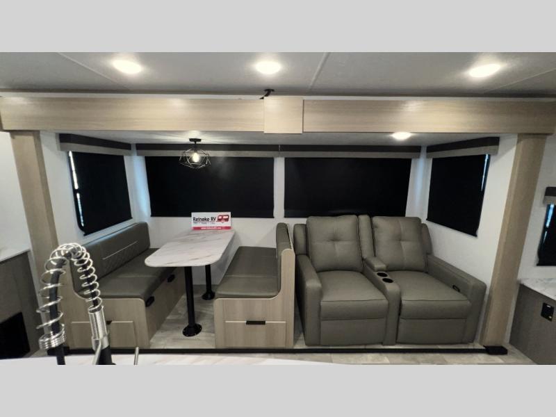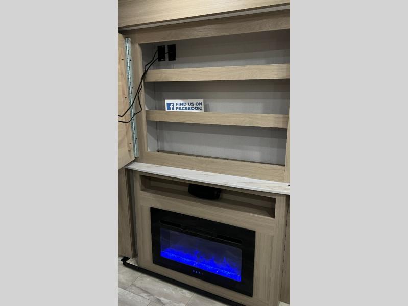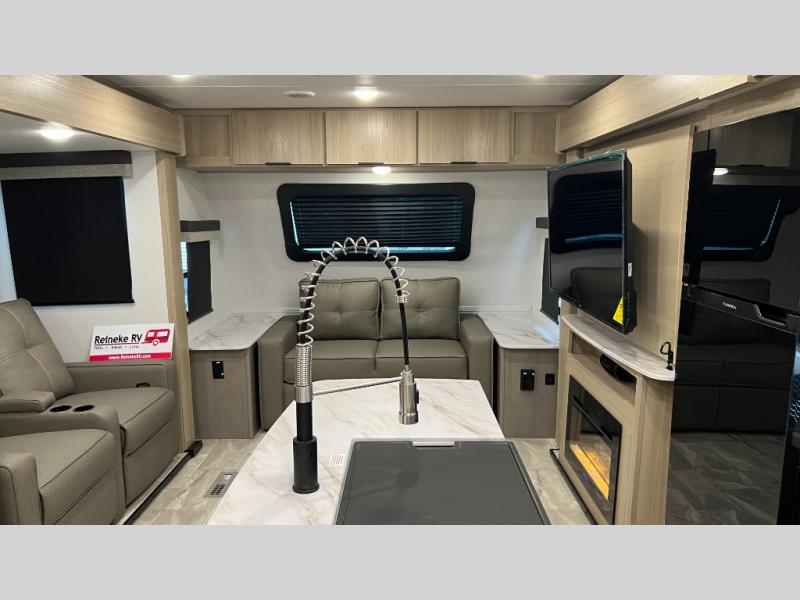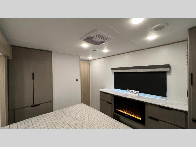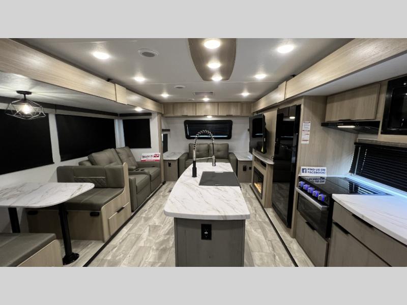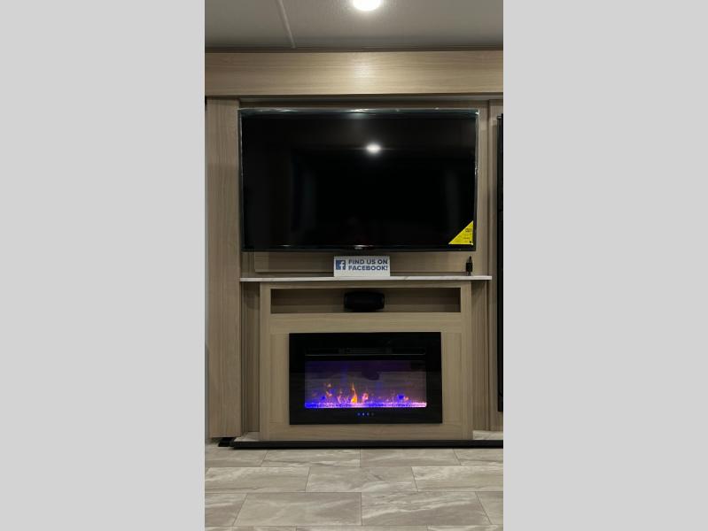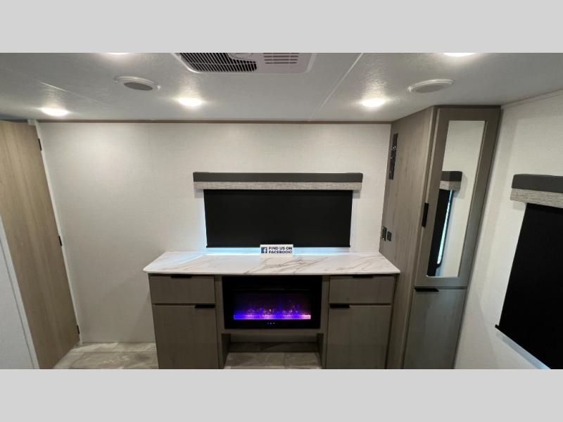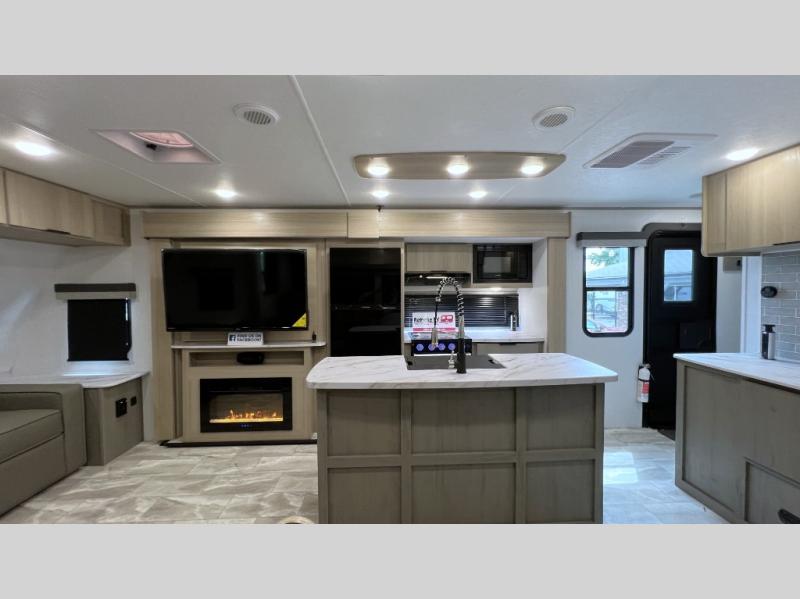 Enjoy ultimate family vacations or trips with friends in this spacious travel trailer. The dual opposing slides in the front living area open up the whole unit for a more at-home feel, and you'll find plenty of seating spaces on the theater seating, booth dinette, and jack knife sofa. The chef of the family will appreciate the extra counter space provided by the kitchen island, plus there is an extra counter with cabinets above for dishes and food. There is an outside kitchen that will come in handy if you like to cook breakfast outdoors, and the power awning with LED lights will provide your crew with shade as they wait for the food to be done. You and your spouse will love retreating to the rear private bedroom for bed each night. Here, the slide out king bed will provide a great night's rest, plus you will have your own fireplace, a closet, and linen storage for more belongings!