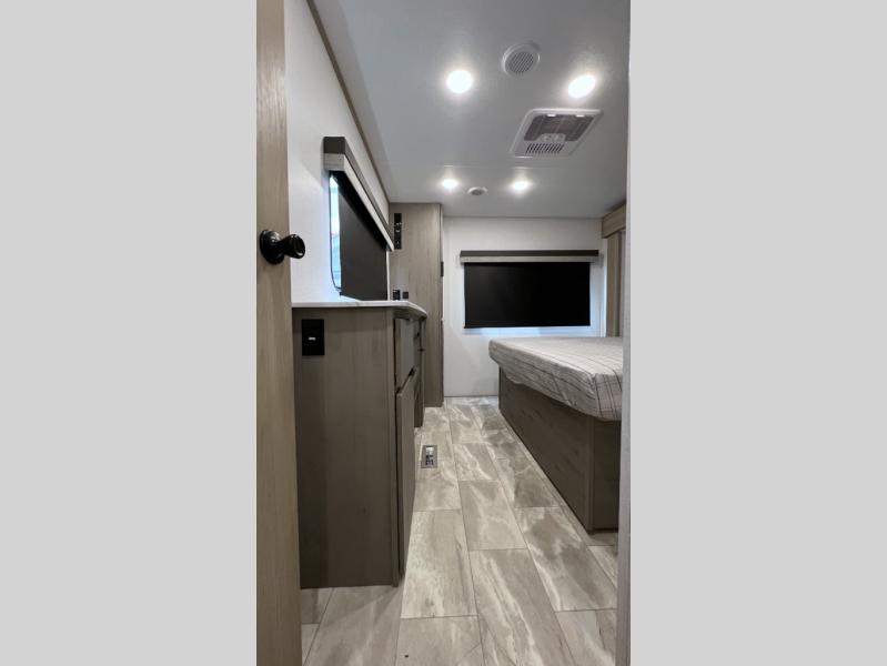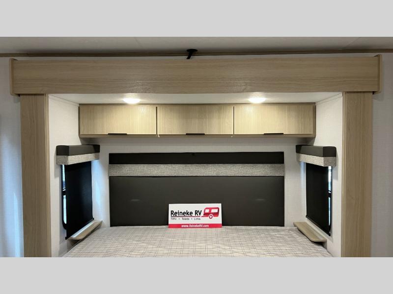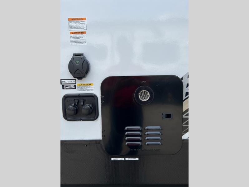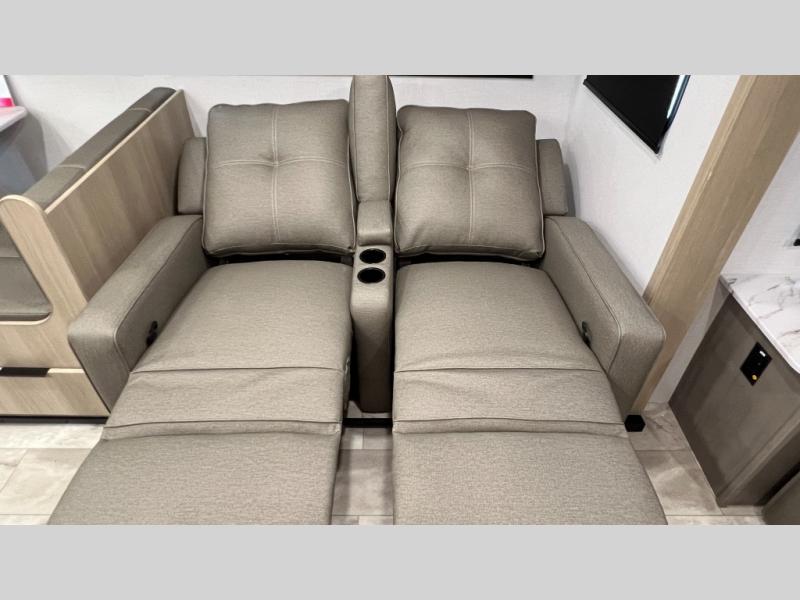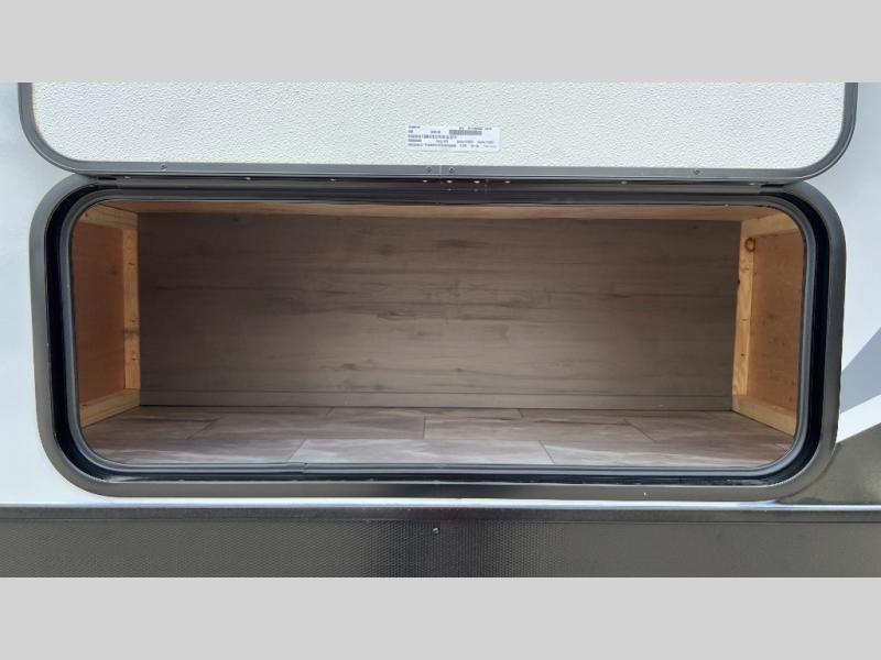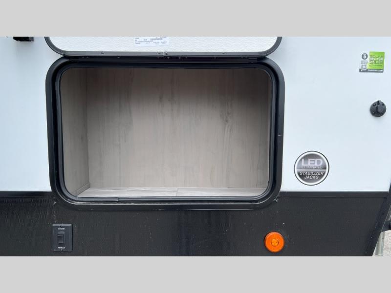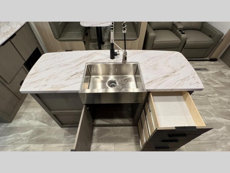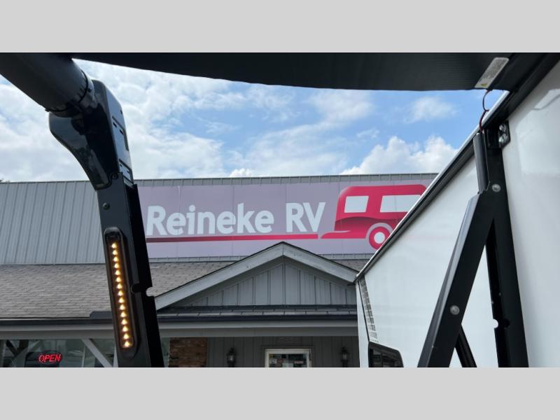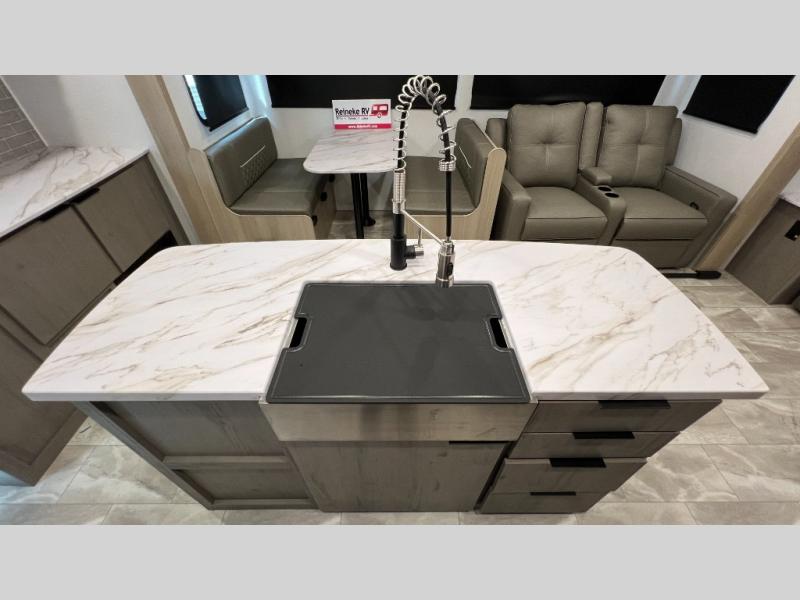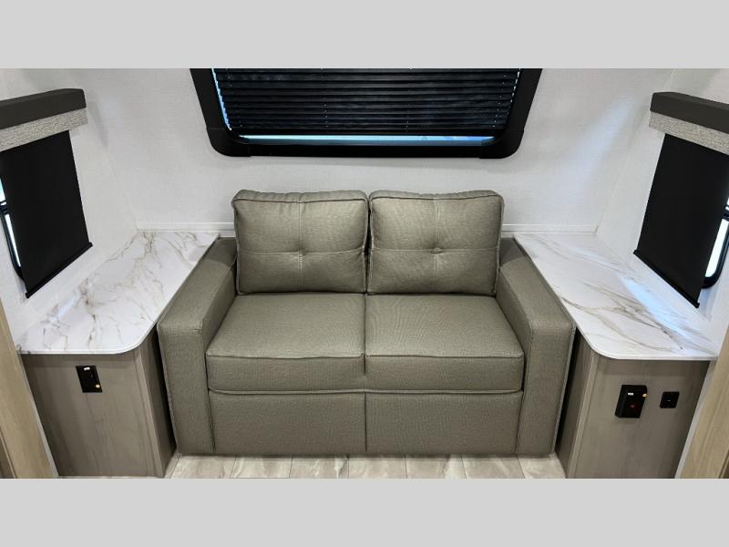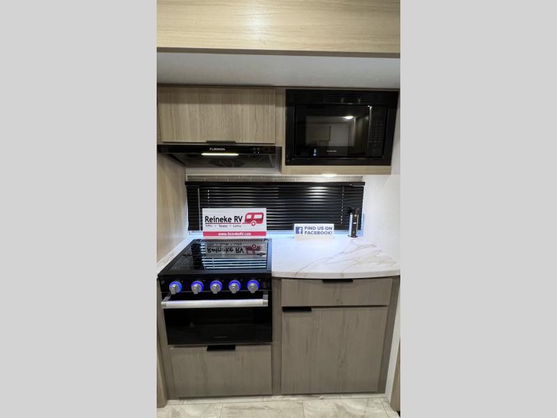 Enjoy ultimate family vacations or trips with friends in this spacious travel trailer. The dual opposing slides in the front living area open up the whole unit for a more at-home feel, and you'll find plenty of seating spaces on the theater seating, booth dinette, and jack knife sofa. The chef of the family will appreciate the extra counter space provided by the kitchen island, plus there is an extra counter with cabinets above for dishes and food. There is an outside kitchen that will come in handy if you like to cook breakfast outdoors, and the power awning with LED lights will provide your crew with shade as they wait for the food to be done. You and your spouse will love retreating to the rear private bedroom for bed each night. Here, the slide out king bed will provide a great night's rest, plus you will have your own fireplace, a closet, and linen storage for more belongings!
