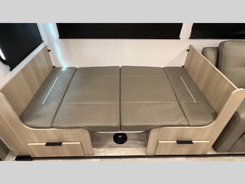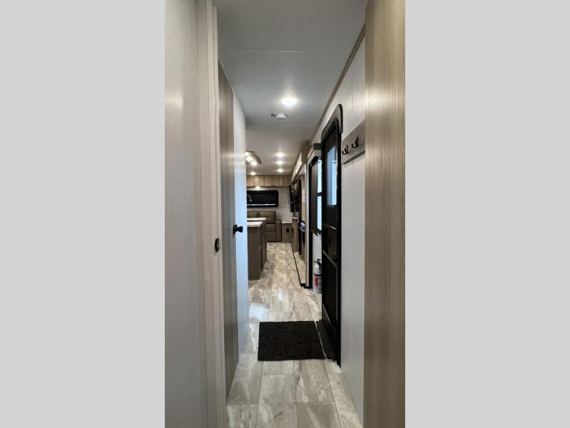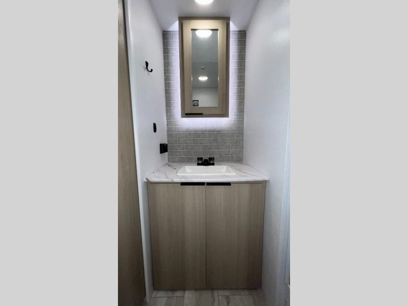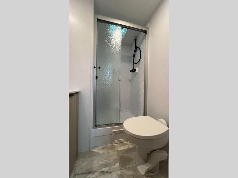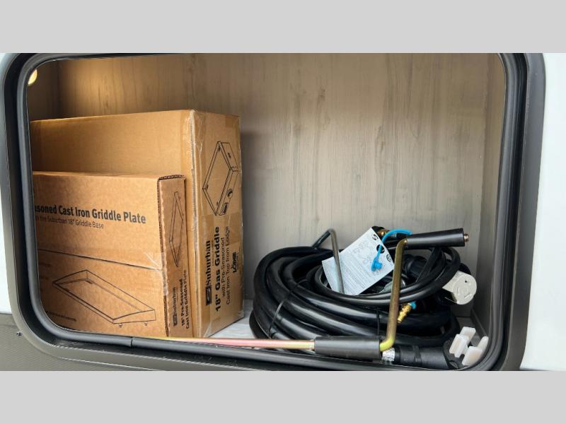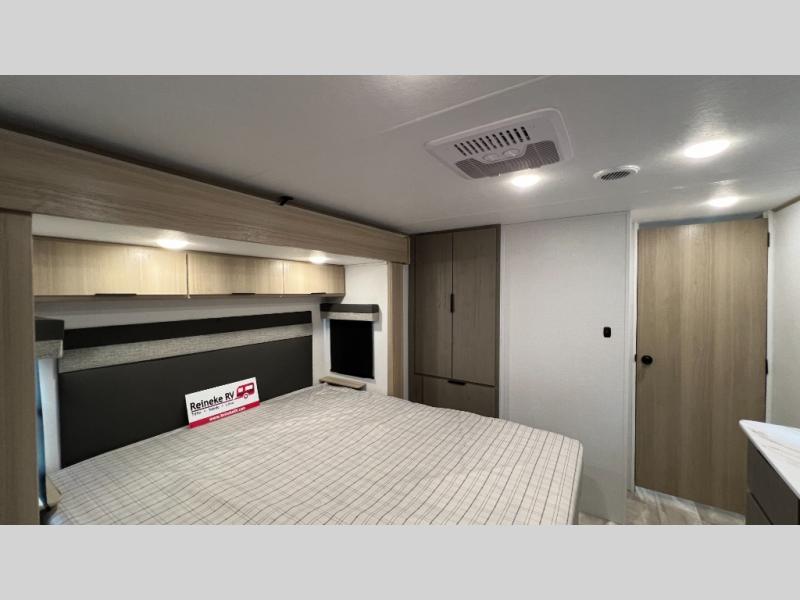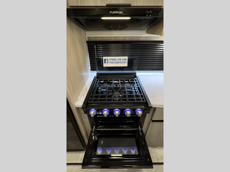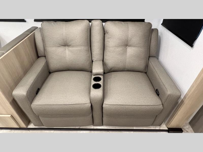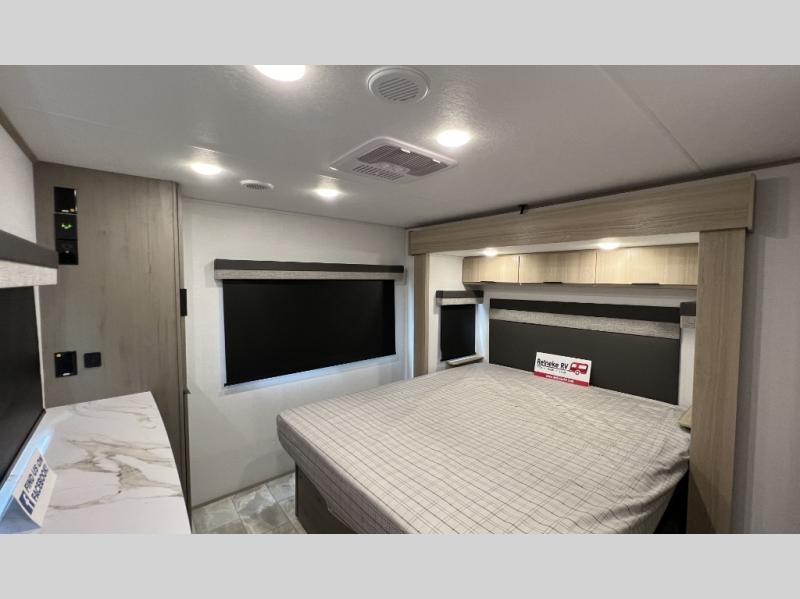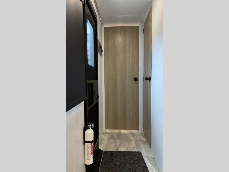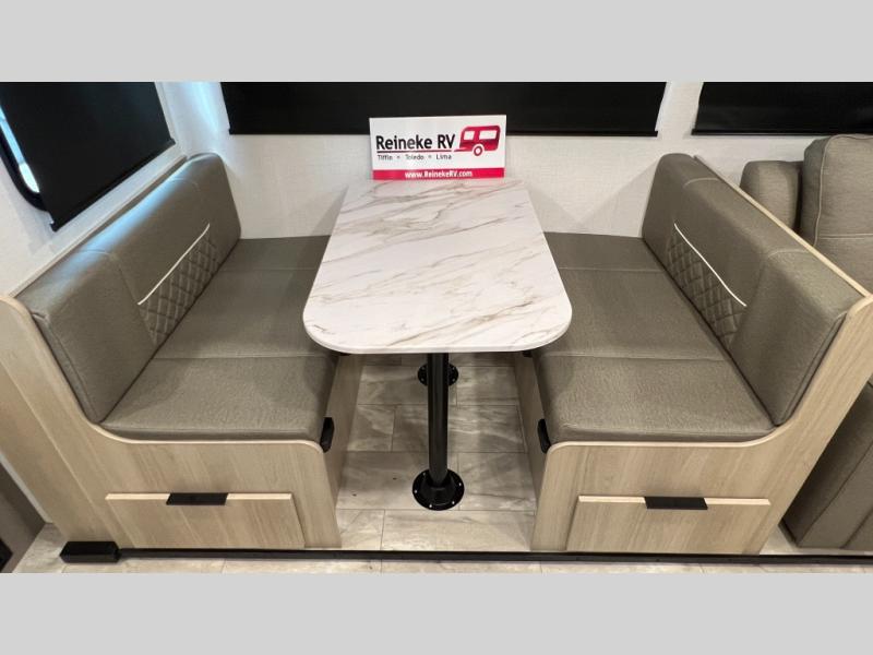 Enjoy ultimate family vacations or trips with friends in this spacious travel trailer. The dual opposing slides in the front living area open up the whole unit for a more at-home feel, and you'll find plenty of seating spaces on the theater seating, booth dinette, and jack knife sofa. The chef of the family will appreciate the extra counter space provided by the kitchen island, plus there is an extra counter with cabinets above for dishes and food. There is an outside kitchen that will come in handy if you like to cook breakfast outdoors, and the power awning with LED lights will provide your crew with shade as they wait for the food to be done. You and your spouse will love retreating to the rear private bedroom for bed each night. Here, the slide out king bed will provide a great night's rest, plus you will have your own fireplace, a closet, and linen storage for more belongings!
