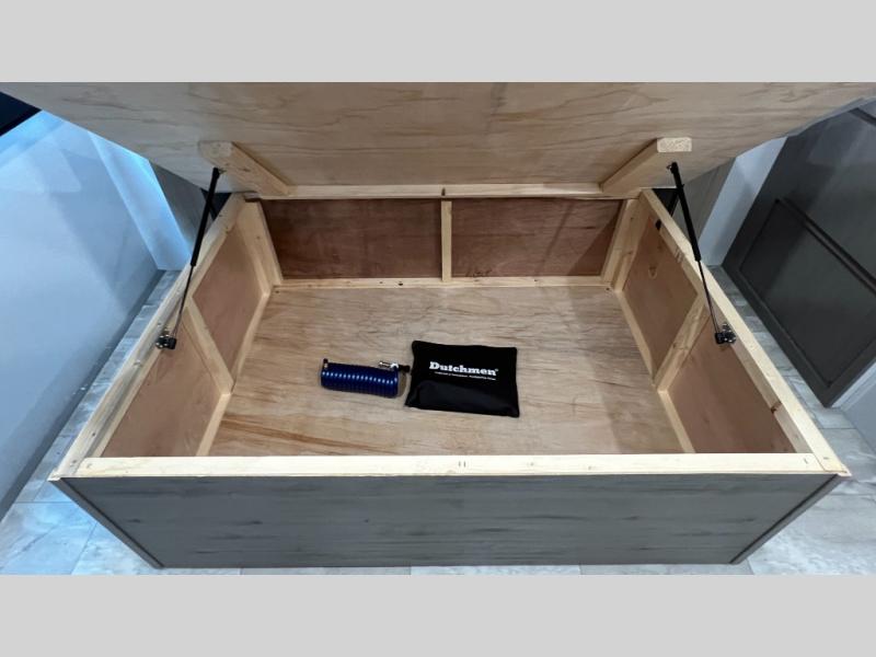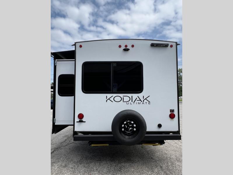 Each Kodiak Ultimate travel trailer by Dutchmen is constructed with an insulated reinforced front cap and diamond plate front rock guard to protect your RV from rock and debris on the way to the campground. The aluminum entry steps are not only dependably, but they collapse and expand quickly so you can get on the road in no-time! These models feature HyperDeck flooring that includes fiberglass reinforced thermoplastic and a fully enclosed underbelly, and the Bear Cave storage allows you to bring along all of your hiking and fishing gear. Some of the interior features you are sure to love are the modern decor choices, dual motion sensory bathroom LED lights, stainless kitchen sink with an apron front, plus a central control panel to easily keep track of your units functions. Your next adventure starts with a Kodiak Ultimate travel trailer!