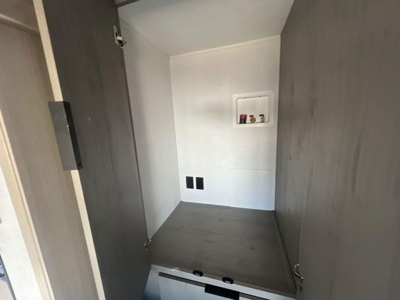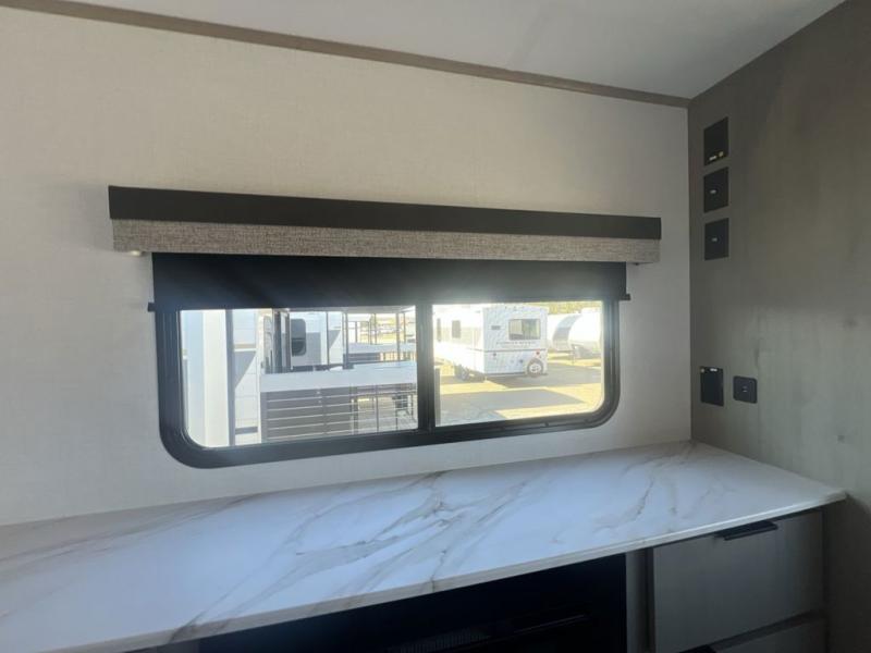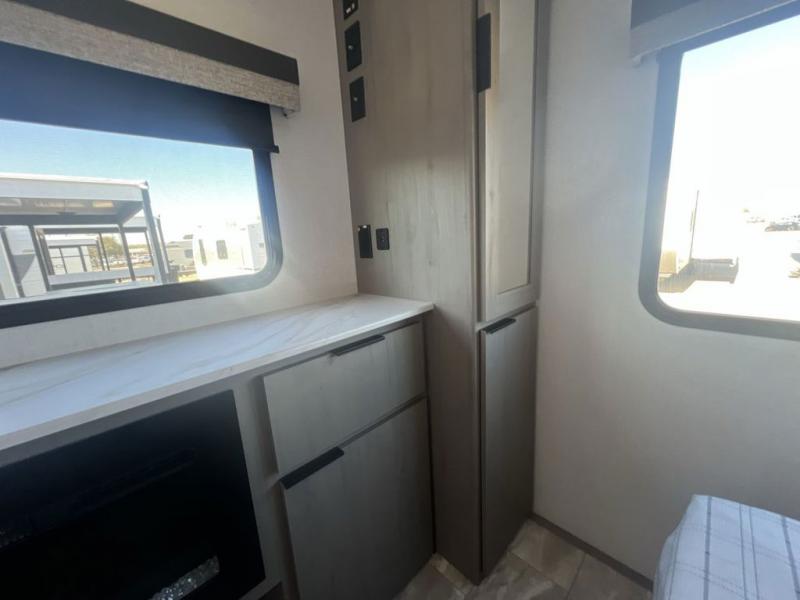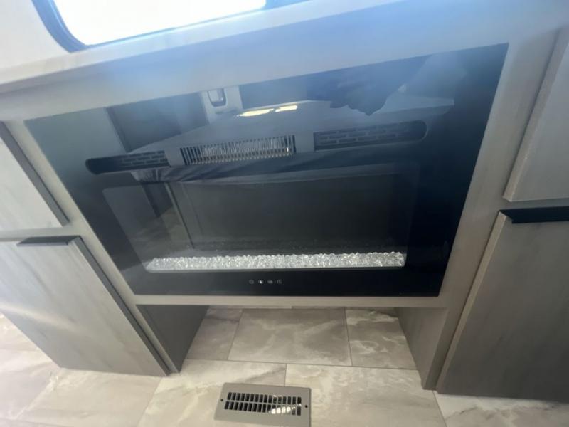 Enjoy ultimate family vacations or trips with friends in this spacious travel trailer. The dual opposing slides in the front living area open up the whole unit for a more at-home feel, and you'll find plenty of seating spaces on the theater seating with a foot rest, booth dinette, and jack knife sofa. The chef of the family will appreciate the extra counter space provided by the kitchen island, plus there is an extra counter with cabinets above for dishes and food. There is an outside kitchen that will come in handy if you like to cook breakfast outdoors, and the power awning with LED lights will provide your crew with shade as they wait for the food to be done. You and your spouse will love retreating to the rear private bedroom for bed each night. Here, the slide out king bed will provide a great night's rest, plus you will have your own fireplace, a closet, and linen storage for more belongings!