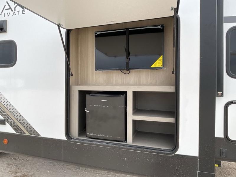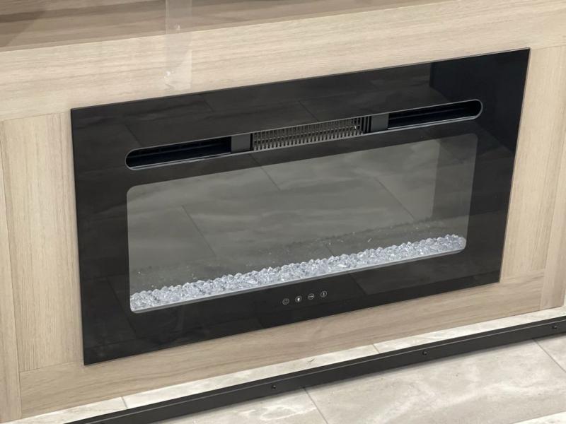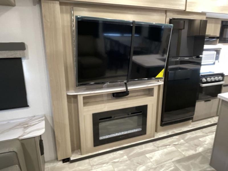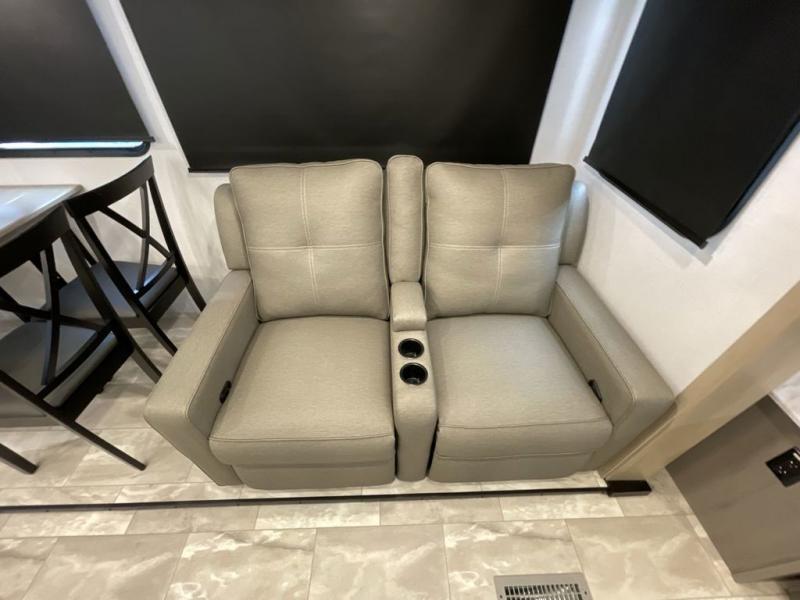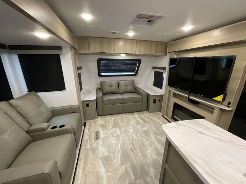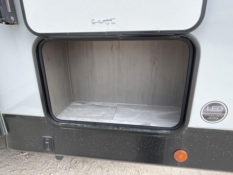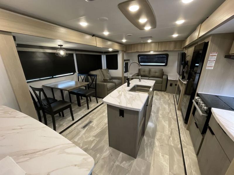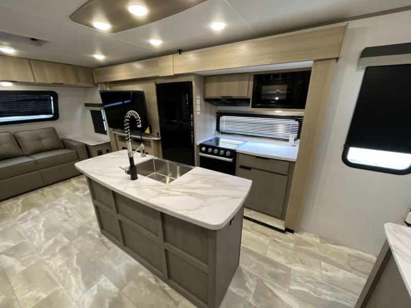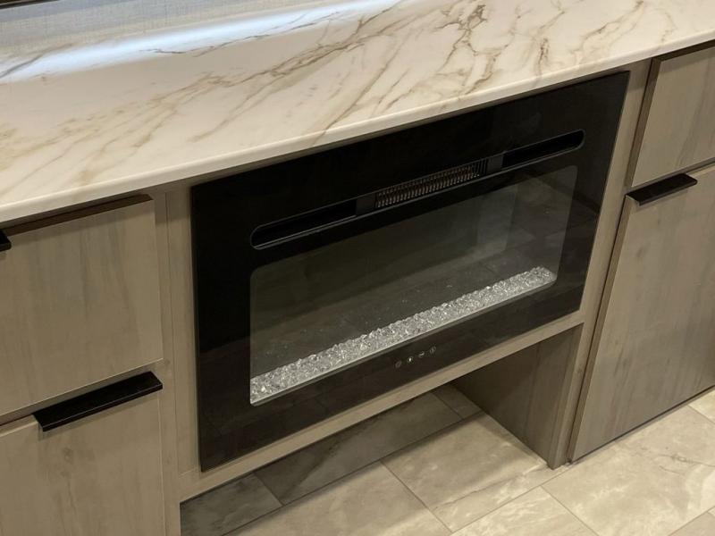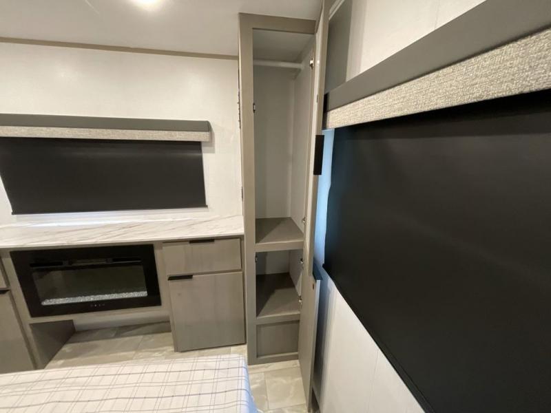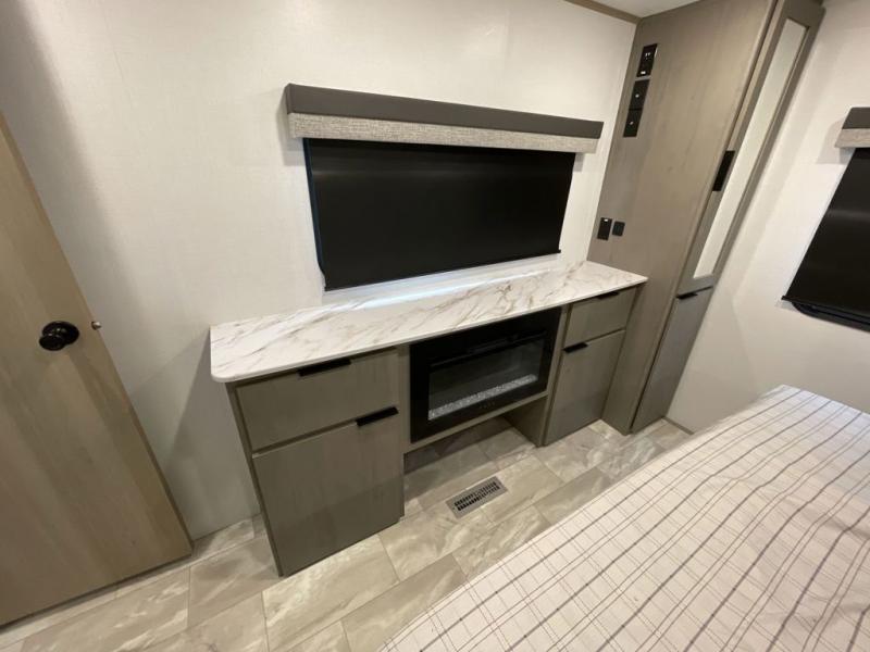 Enjoy ultimate family vacations or trips with friends in this spacious travel trailer. The dual opposing slides in the front living area open up the whole unit for a more at-home feel, and you'll find plenty of seating spaces on the theater seating with a foot rest, booth dinette, and jack knife sofa. The chef of the family will appreciate the extra counter space provided by the kitchen island, plus there is an extra counter with cabinets above for dishes and food. There is an outside kitchen that will come in handy if you like to cook breakfast outdoors, and the power awning with LED lights will provide your crew with shade as they wait for the food to be done. You and your spouse will love retreating to the rear private bedroom for bed each night. Here, the slide out king bed will provide a great night's rest, plus you will have your own fireplace, a closet, and linen storage for more belongings!