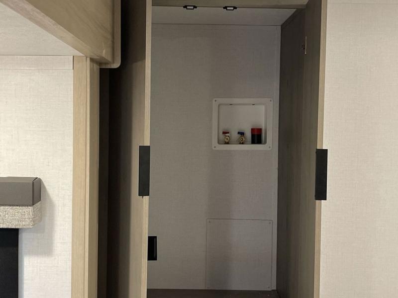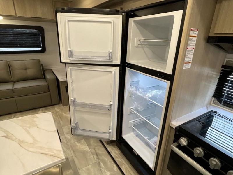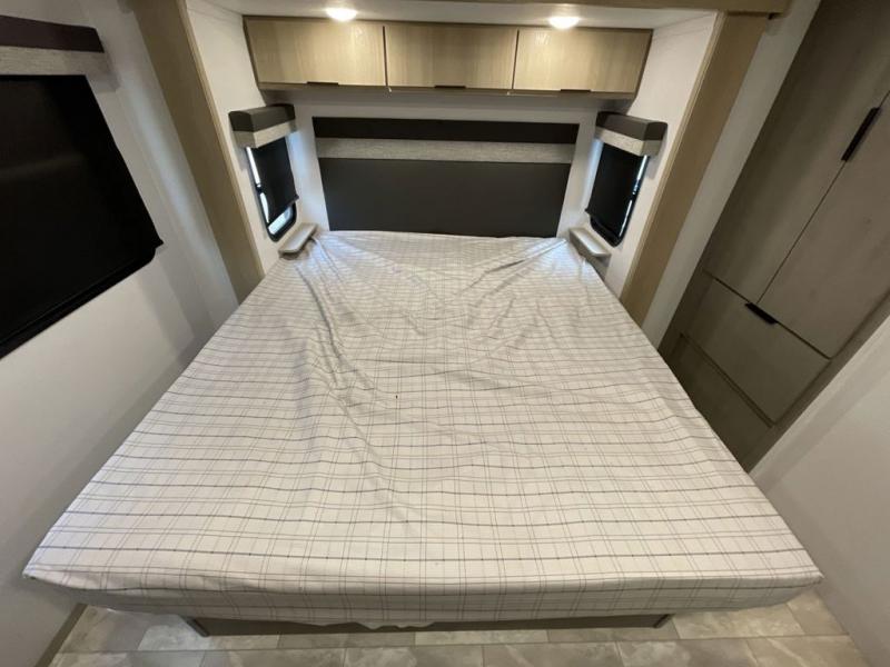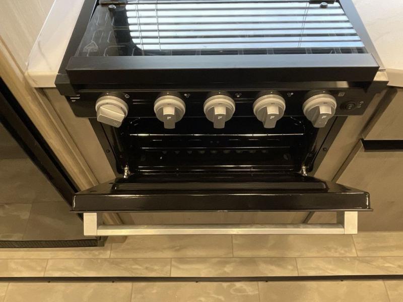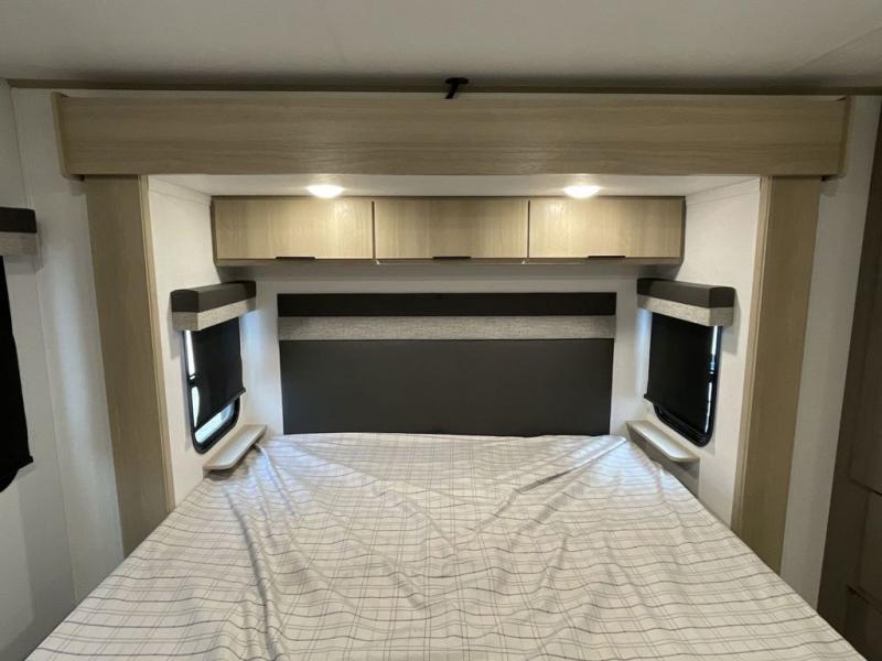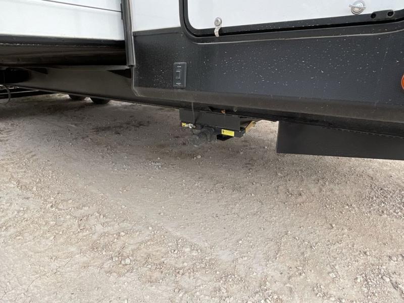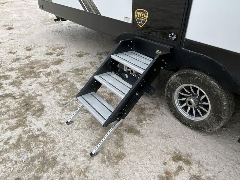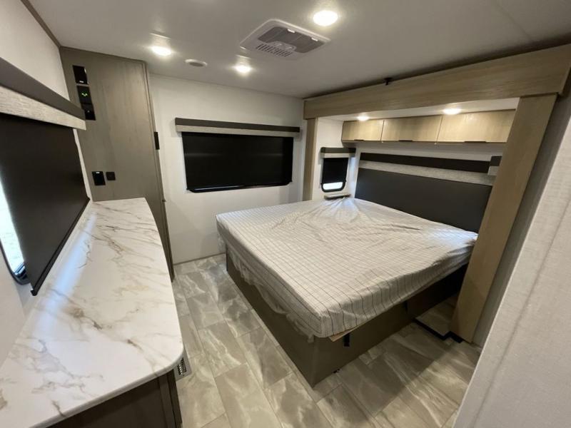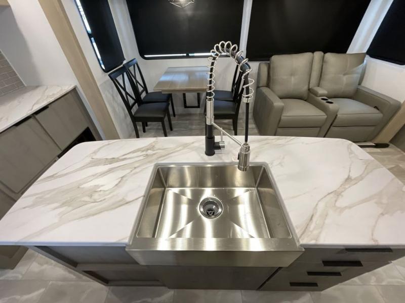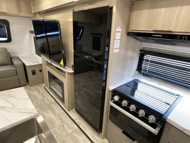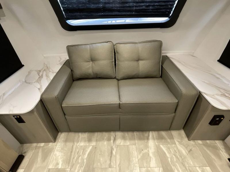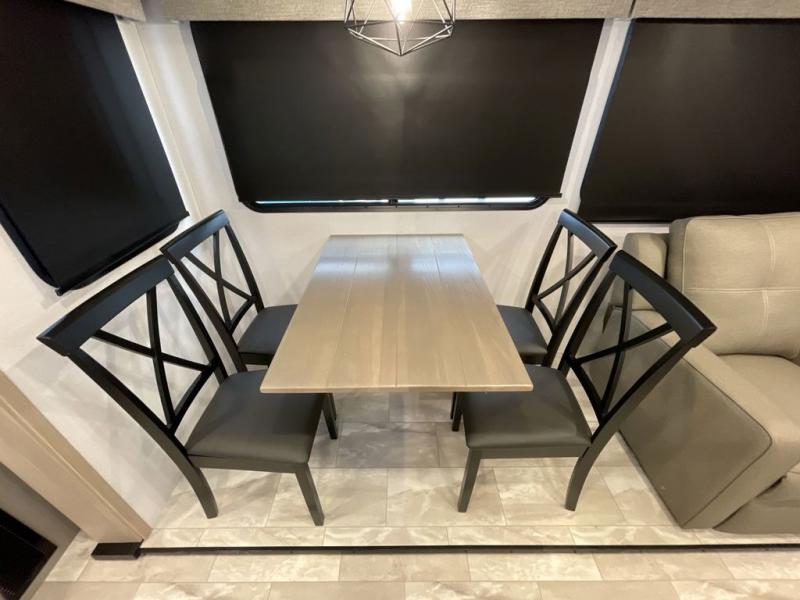 Enjoy ultimate family vacations or trips with friends in this spacious travel trailer. The dual opposing slides in the front living area open up the whole unit for a more at-home feel, and you'll find plenty of seating spaces on the theater seating with a foot rest, booth dinette, and jack knife sofa. The chef of the family will appreciate the extra counter space provided by the kitchen island, plus there is an extra counter with cabinets above for dishes and food. There is an outside kitchen that will come in handy if you like to cook breakfast outdoors, and the power awning with LED lights will provide your crew with shade as they wait for the food to be done. You and your spouse will love retreating to the rear private bedroom for bed each night. Here, the slide out king bed will provide a great night's rest, plus you will have your own fireplace, a closet, and linen storage for more belongings!