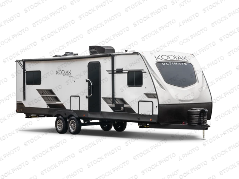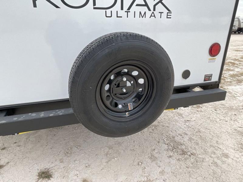 Each Kodiak Ultimate travel trailer by Dutchmen is constructed with an insulated reinforced front cap and diamond plate front rock guard to protect your RV from rock and debris on the way to the campground. The aluminum entry steps are not only dependably, but they collapse and expand quickly so you can get on the road in no-time! These models feature HyperDeck flooring that includes fiberglass reinforced thermoplastic and a fully enclosed underbelly, and the Bear Cave storage allows you to bring along all of your hiking and fishing gear. Some of the interior features you are sure to love are the modern decor choices, dual motion sensory bathroom LED lights, stainless kitchen sink with an apron front, plus a central control panel to easily keep track of your units functions. Your next adventure starts with a Kodiak Ultimate travel trailer!