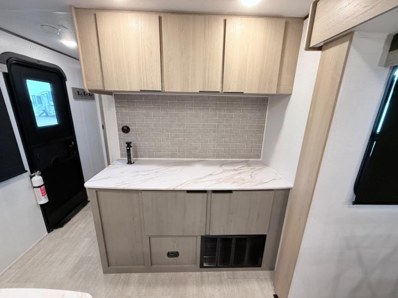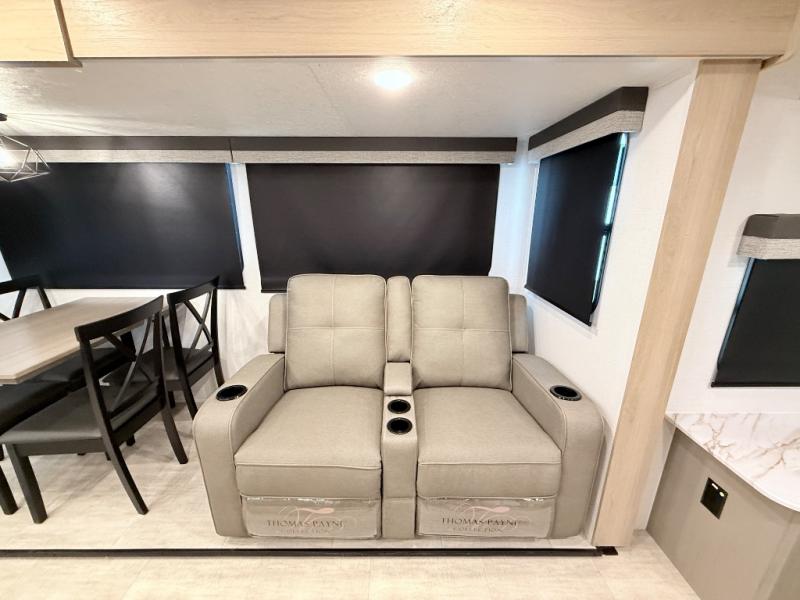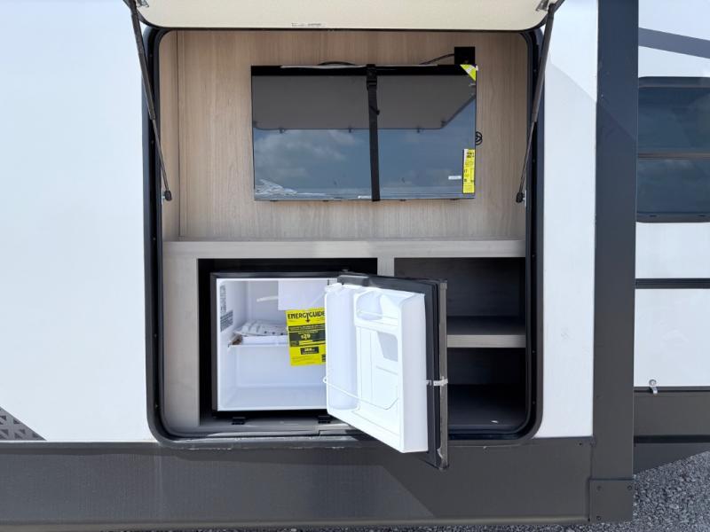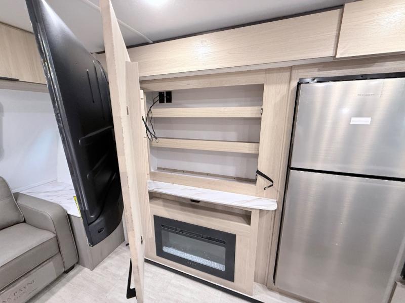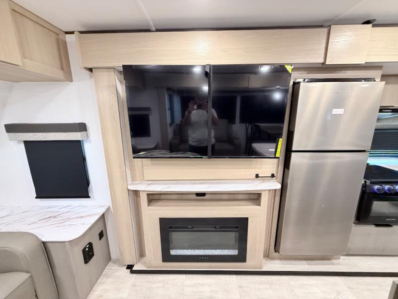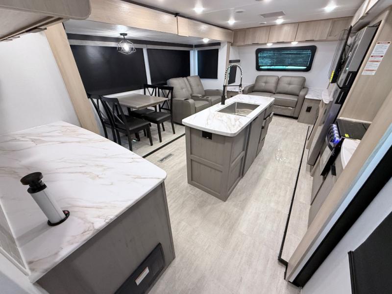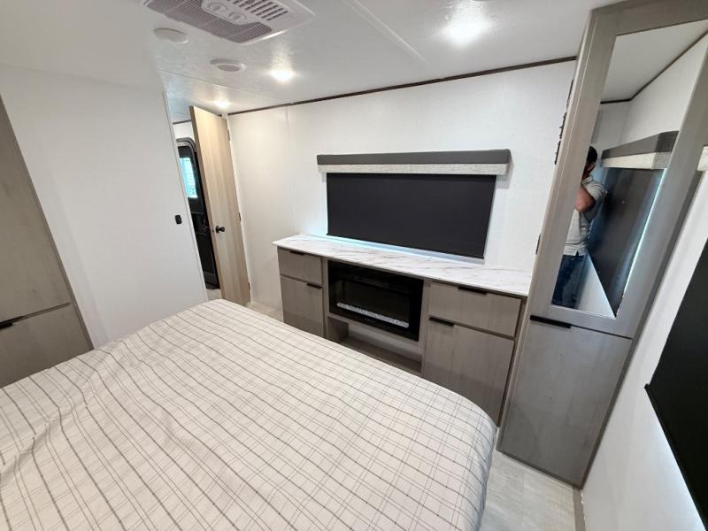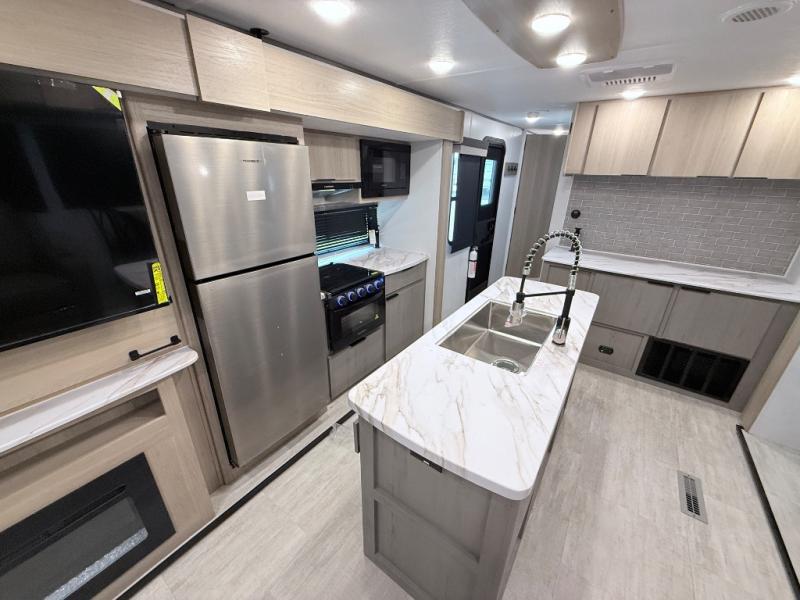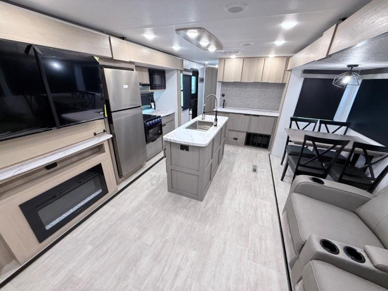 Enjoy ultimate family vacations or trips with friends in this spacious travel trailer. The dual opposing slides in the front living area open up the whole unit for a more at-home feel, and you'll find plenty of seating spaces on the theater seating with a foot rest, booth dinette, and jack knife sofa. The chef of the family will appreciate the extra counter space provided by the kitchen island, plus there is an extra counter with cabinets above for dishes and food. There is an outside kitchen that will come in handy if you like to cook breakfast outdoors, and the power awning with LED lights will provide your crew with shade as they wait for the food to be done. You and your spouse will love retreating to the rear private bedroom for bed each night. Here, the slide out king bed will provide a great night's rest, plus you will have your own fireplace, a closet, and linen storage for more belongings!