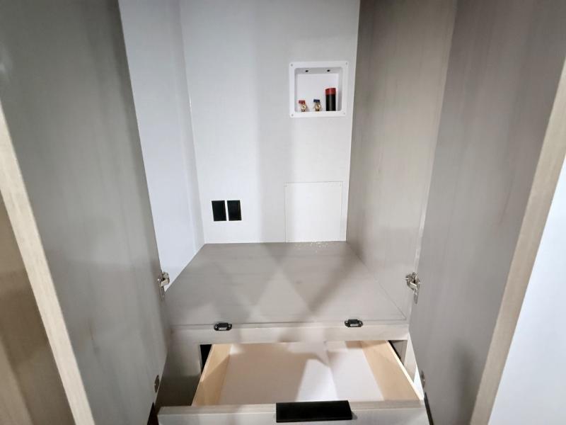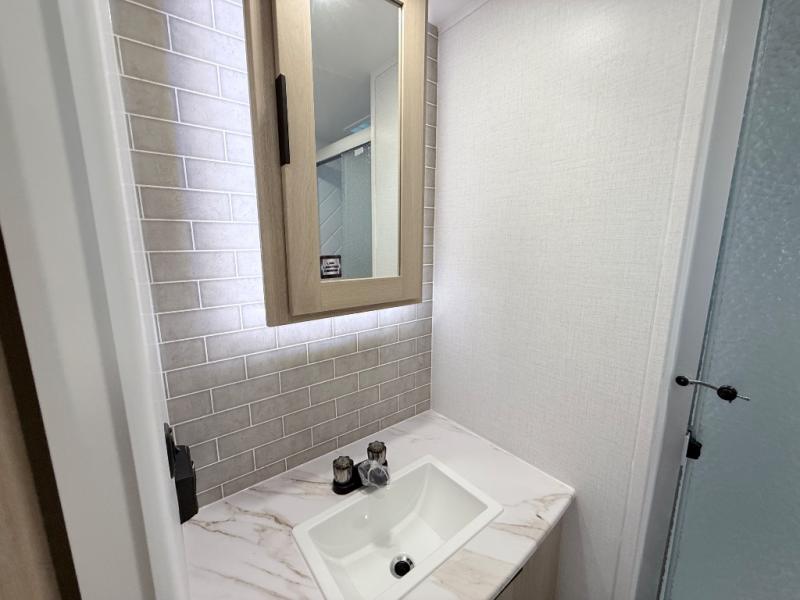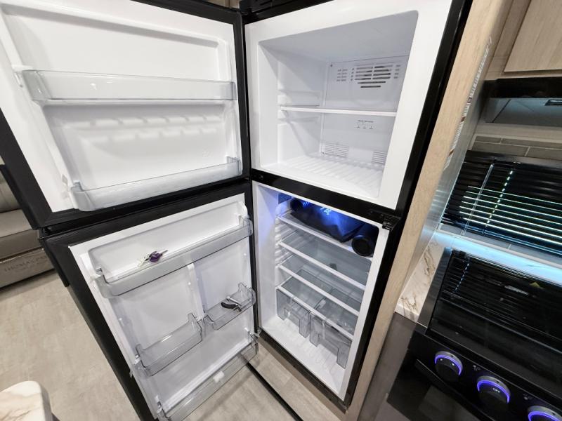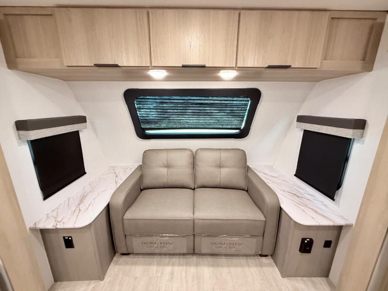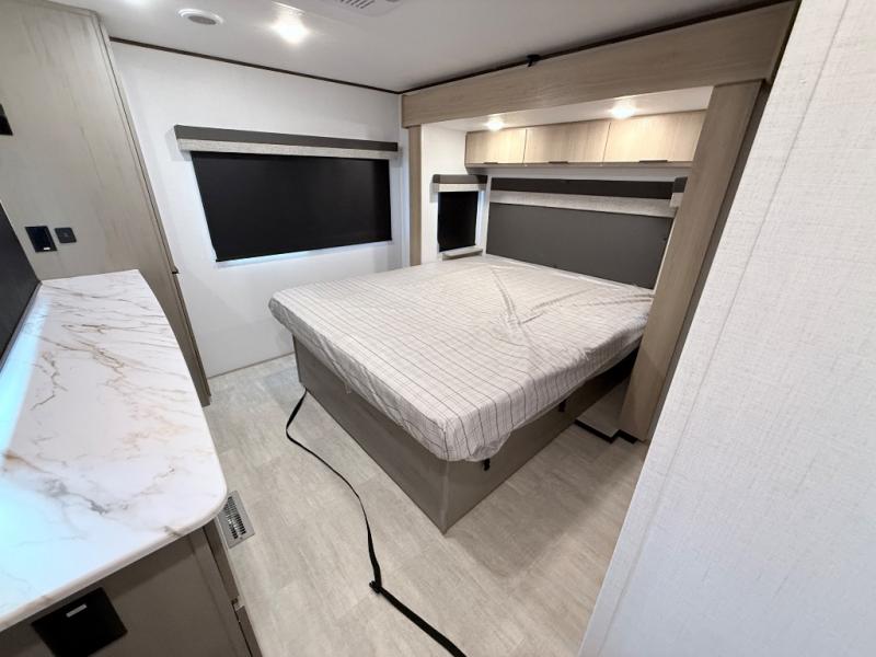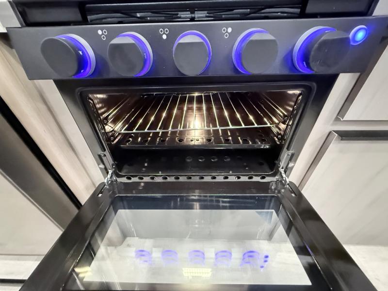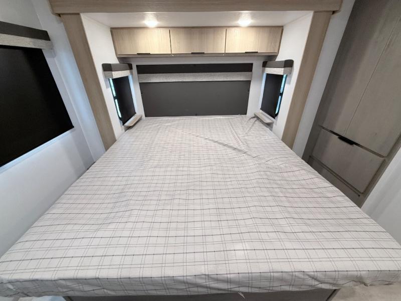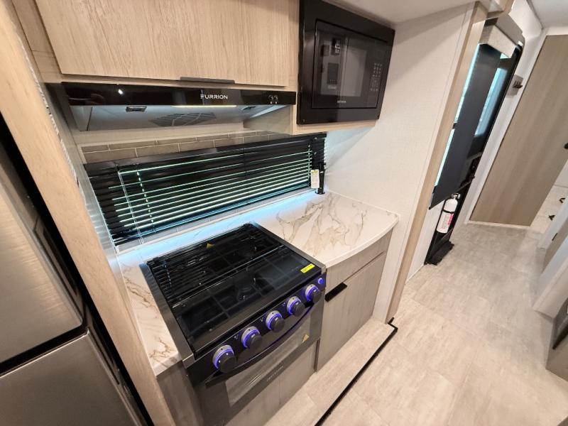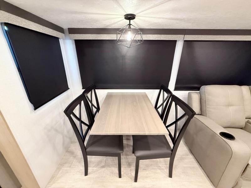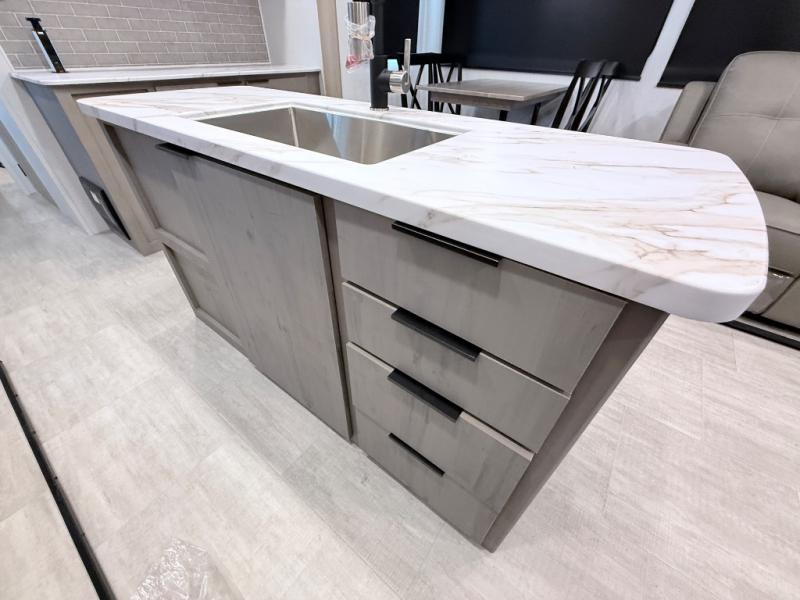 Enjoy ultimate family vacations or trips with friends in this spacious travel trailer. The dual opposing slides in the front living area open up the whole unit for a more at-home feel, and you'll find plenty of seating spaces on the theater seating with a foot rest, booth dinette, and jack knife sofa. The chef of the family will appreciate the extra counter space provided by the kitchen island, plus there is an extra counter with cabinets above for dishes and food. There is an outside kitchen that will come in handy if you like to cook breakfast outdoors, and the power awning with LED lights will provide your crew with shade as they wait for the food to be done. You and your spouse will love retreating to the rear private bedroom for bed each night. Here, the slide out king bed will provide a great night's rest, plus you will have your own fireplace, a closet, and linen storage for more belongings!