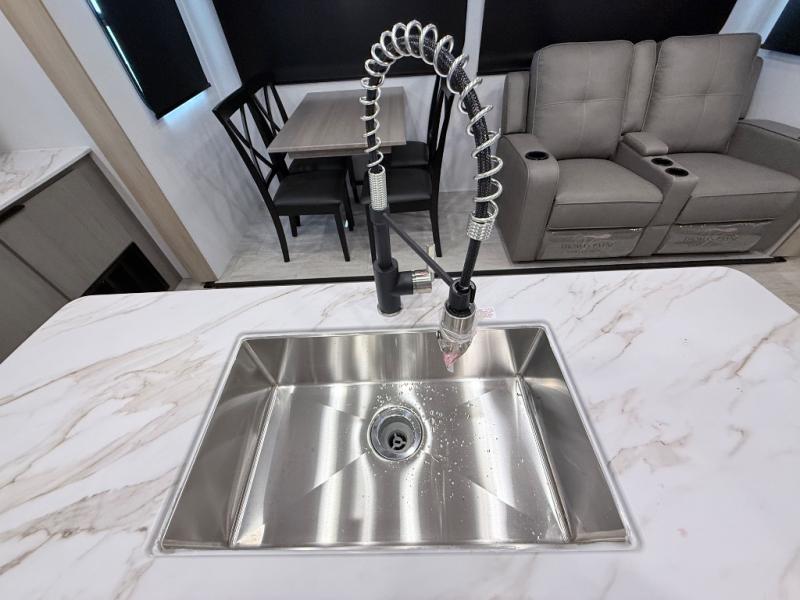 Each Kodiak Ultimate travel trailer by Dutchmen is constructed with an insulated reinforced front cap and diamond plate front rock guard to protect your RV from rock and debris on the way to the campground. The aluminum entry steps are not only dependably, but they collapse and expand quickly so you can get on the road in no-time! These models feature HyperDeck flooring that includes fiberglass reinforced thermoplastic and a fully enclosed underbelly, and the Bear Cave storage allows you to bring along all of your hiking and fishing gear. Some of the interior features you are sure to love are the modern decor choices, dual motion sensory bathroom LED lights, stainless kitchen sink with an apron front, plus a central control panel to easily keep track of your units functions. Your next adventure starts with a Kodiak Ultimate travel trailer!