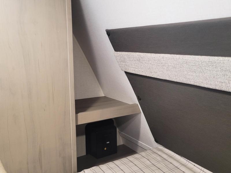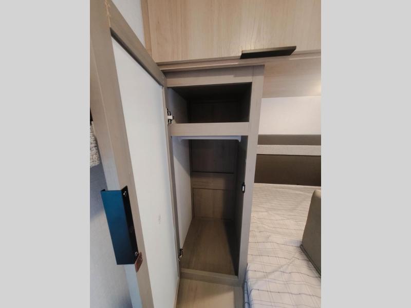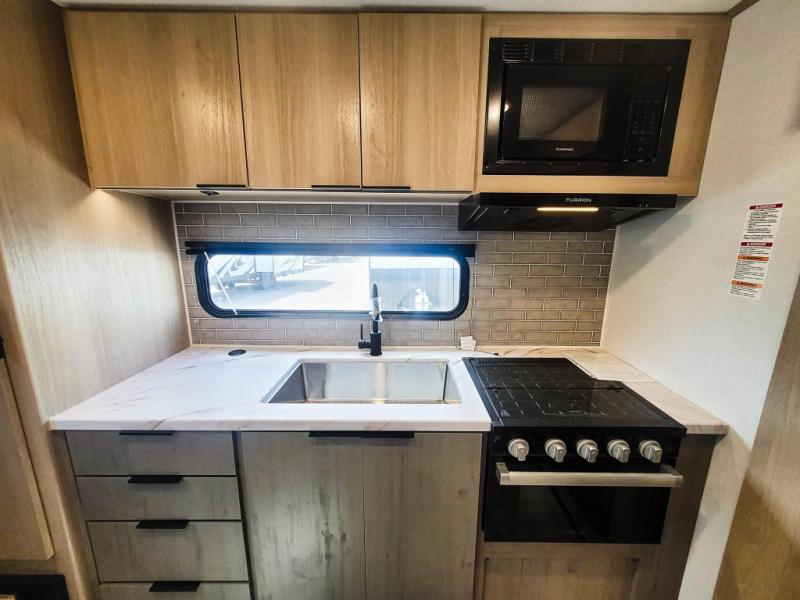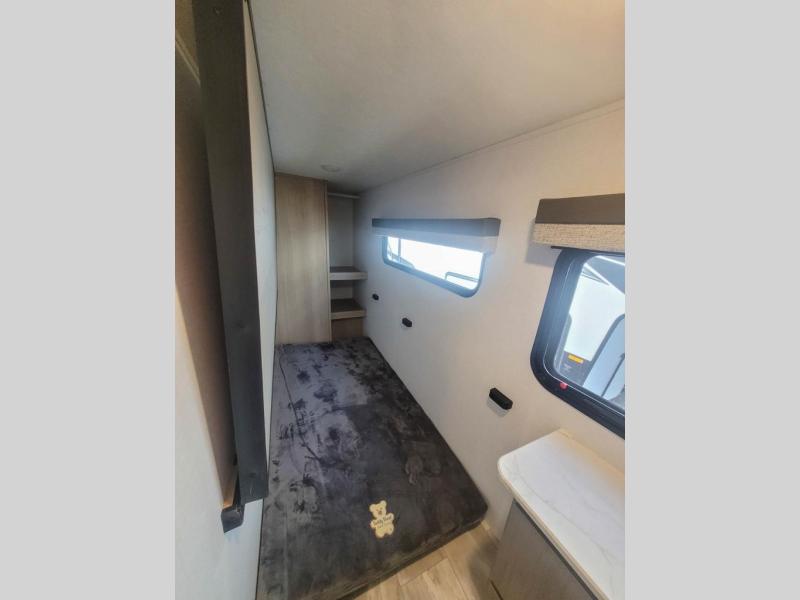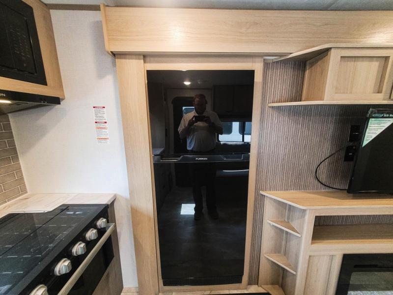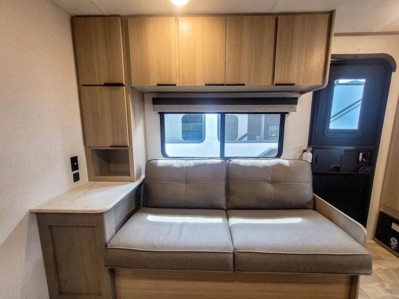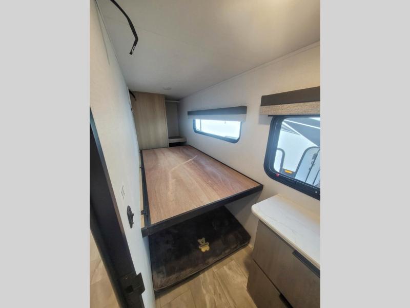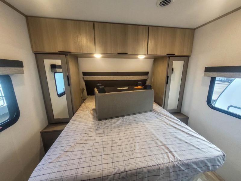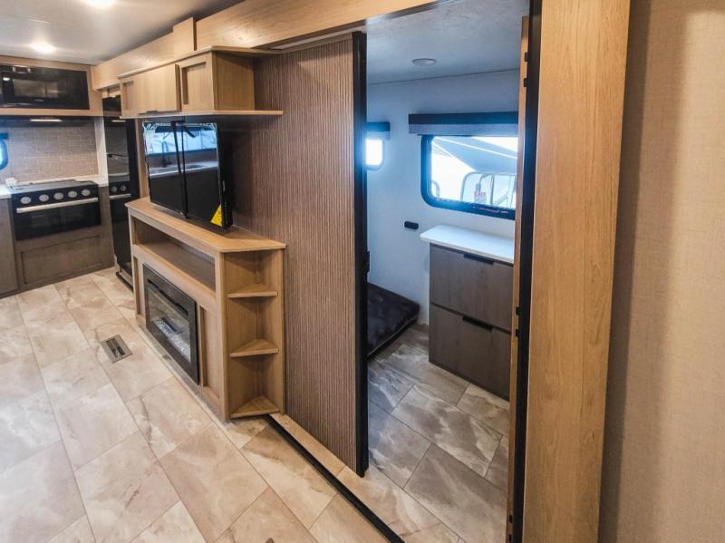 You'll love every minute spent in this spacious travel trailer. There is a front private bedroom with a queen bed and dual bedside closets to keep your things organized. The jack knife sofa sits across from the fireplace so you can enjoy your evenings indoors, and the hidden convertible bunk is behind the entertainment center for a smart usage of space! The rear kitchen includes a cooktop with an oven, a microwave, plus a 12V refrigerator and pantry for food storage. And don't overlook the mid-coach full bath for quick and easy showers!