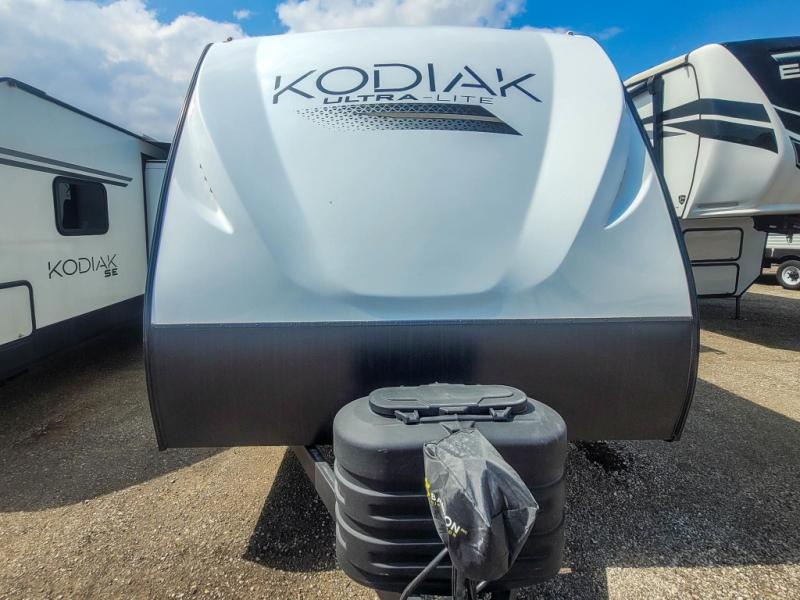 Each Kodiak travel trailer by Dutchmen includes a diamond front plate, easy lube axles, and a power tongue jack for hassle-free towing. The bear cave storage will allow you to bring along all the camp gear, and the power awning with an LED light will create an inviting outdoor space. Head inside to enjoy the designer valances, blackout roller shades, and seamless countertops. There is also HyperDeck flooring that will withstand your many adventures plus a 6' 8" interior height for more head room. A high output furnace and 13.5k BTU A/C will keep you comfortable, and the on-demand tankless water heater will provide instant hot water when you need it!