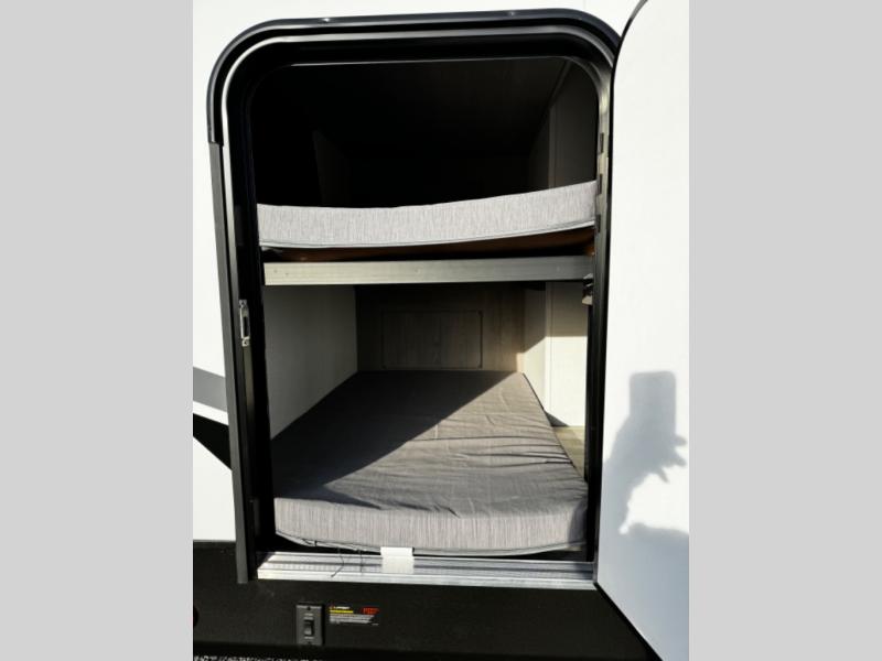 The whole family will love camping in this travel trailer! The kiddos can invite a friend to sleep on the rear triple bunks behind the half bathroom, and you will have your own privacy with the front private bedroom with a queen bed. You even have an entrance into the walk-through bathroom which has a shower with an exhaust fan. Keep your bellies full with delicious home cooked meals prepared on the three burner cooktop then enjoy them at the U-shaped dinette and store any leftovers in the 10 cu. ft. 12V refrigerator. The theater seating with foot rest is conveniently across from the hinged entertainment center which has a fireplace for a cozy evening and a pantry behind to easily grab a snack for movie night. Grill up some juicy burgers at the outdoor griddle and stay protected under the 20' power awning!