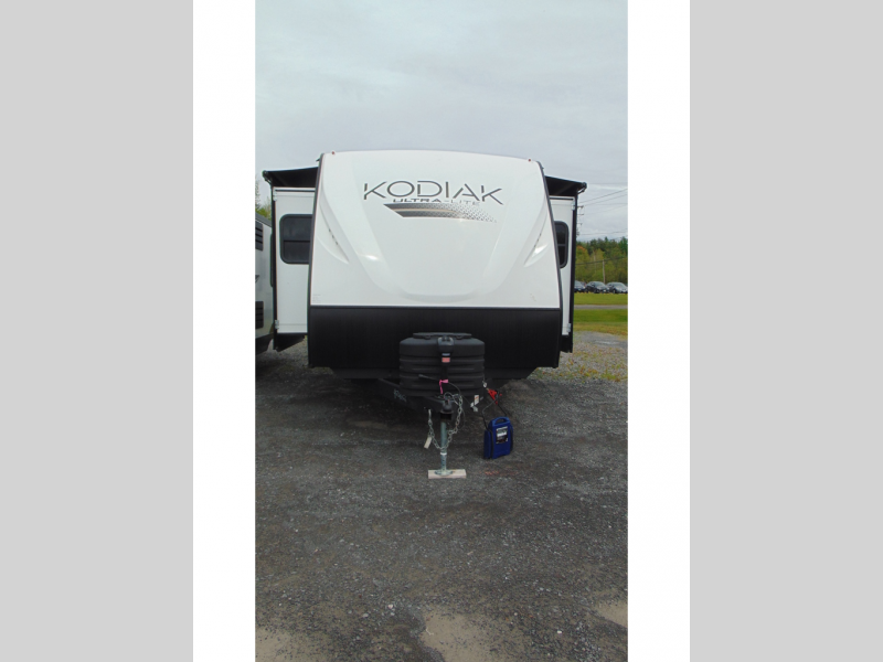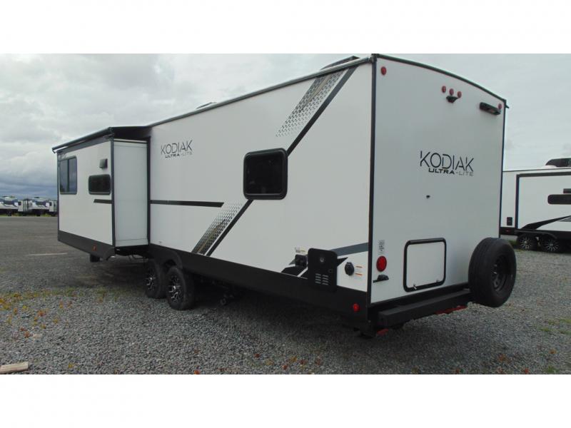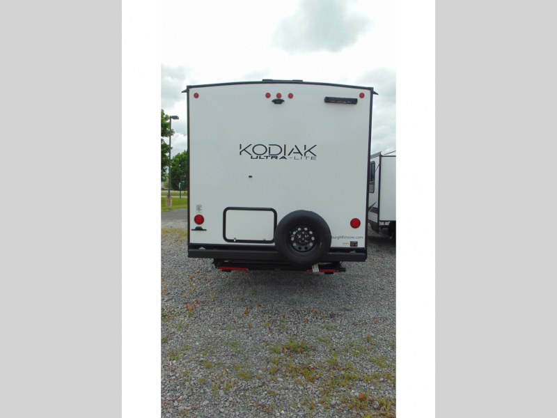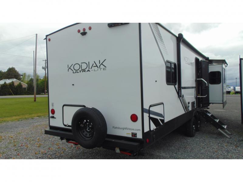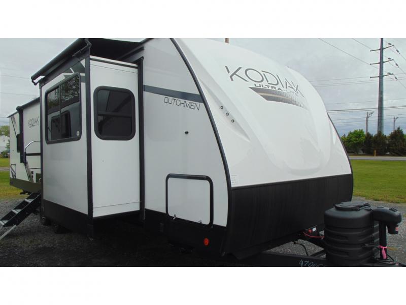 Each Kodiak Ultra-Lite travel trailer by Dutchmen includes a diamond front plate, easy lube axles, and a power tongue jack for hassle-free towing. The bear cave storage will allow you to bring along all the camp gear, and the power awning with an LED light will create an inviting outdoor space. Head inside to enjoy the designer valances, blackout roller shades, and seamless countertops. There is also HyperDeck flooring that will withstand your many adventures plus a 6' 8" interior height for more head room. A high output furnace and 13.5k BTU A/C will keep you comfortable, and the on-demand tankless water heater will provide instant hot water when you need it!