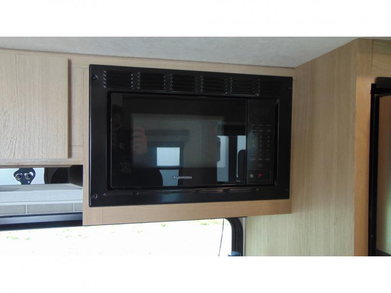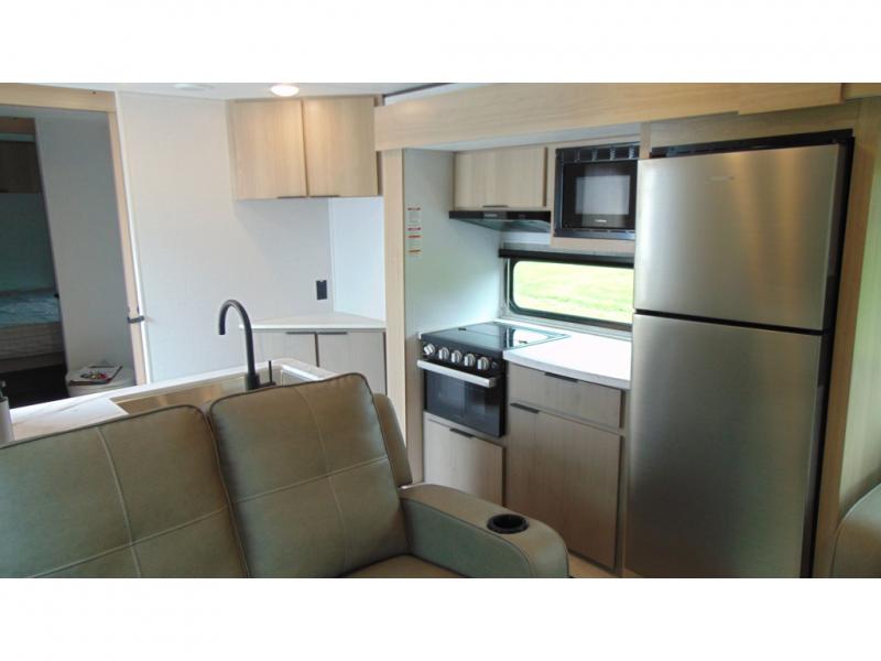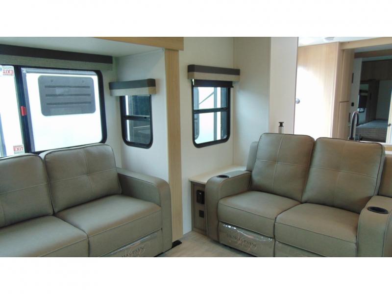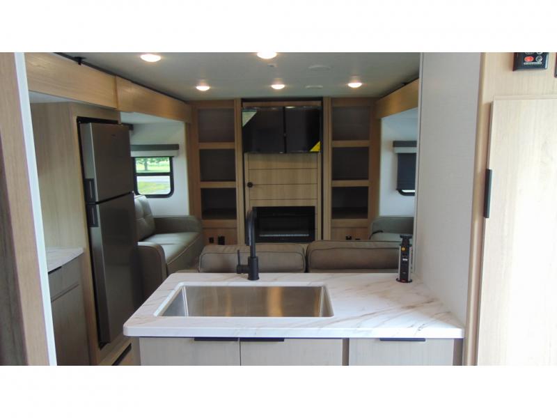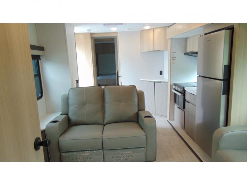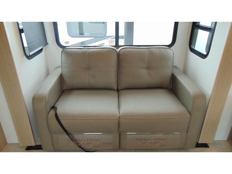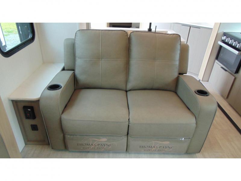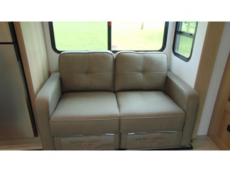 If you're looking for a unique travel trailer, this is the one! The front living area features dual opposing sofa slides, theater seating, and hidden storage behind the entertainment center and fireplace. Your guests can make this their bedroom at night, while you take the king bed in the rear master bedroom. There is also a walk-thru bath that leads to the bedroom for added convenience. A full kitchen is complete with an oven, microwave, and 10 cu. ft. 12V refrigerator, plus there are two pantries to keep snacks stocked.
