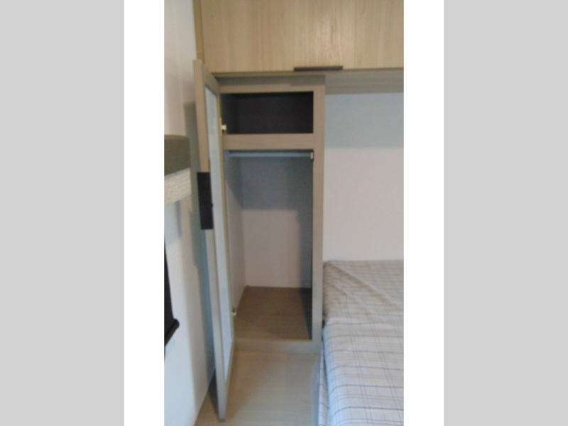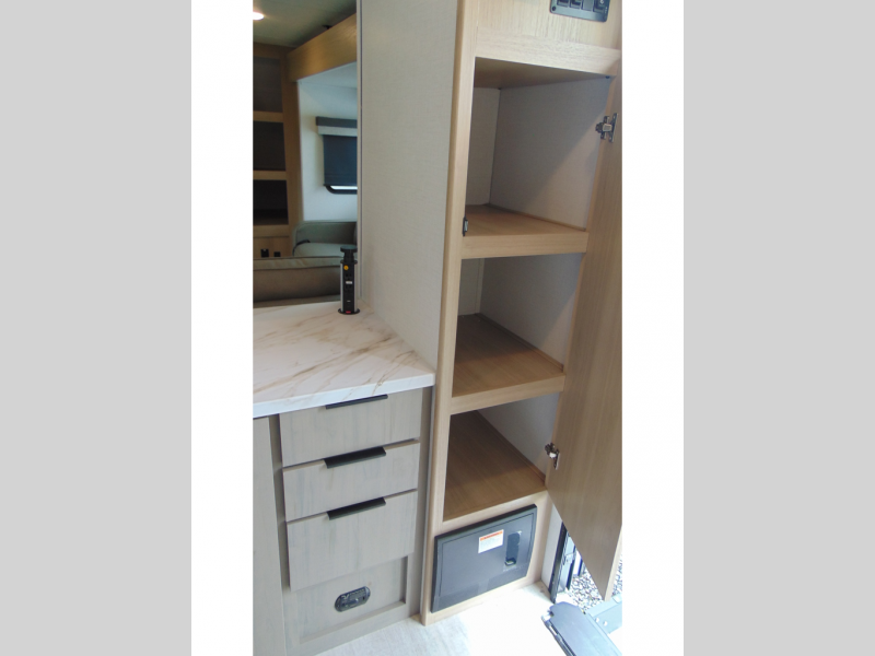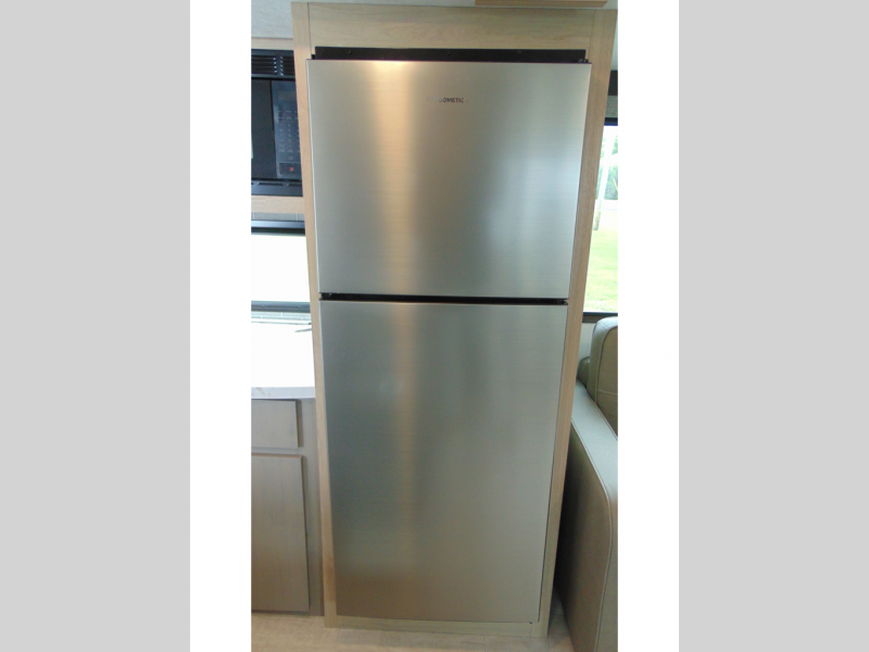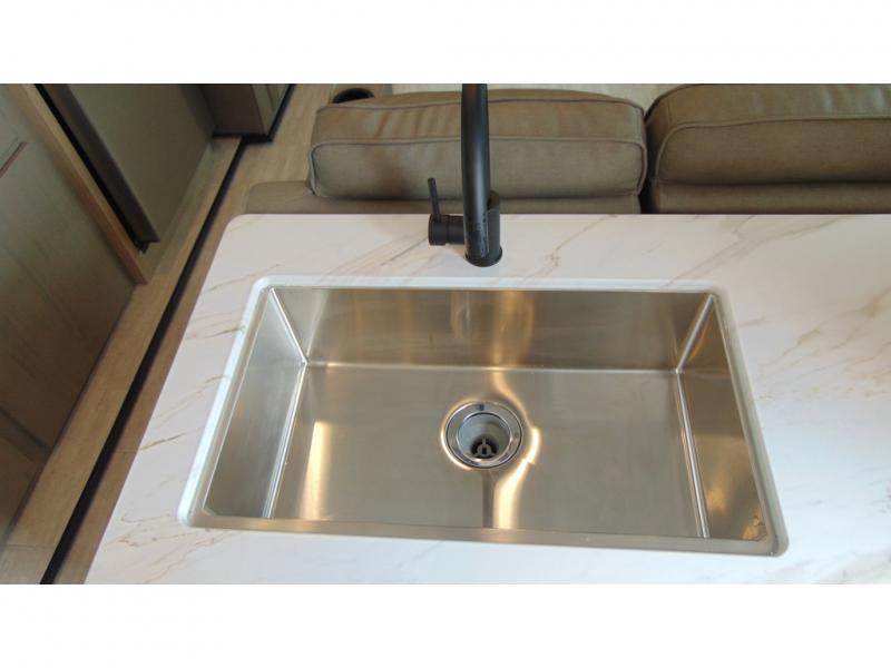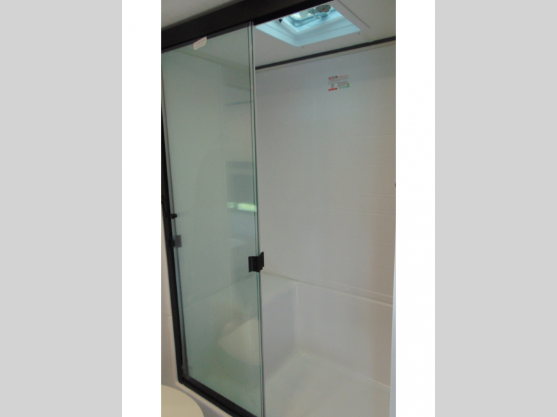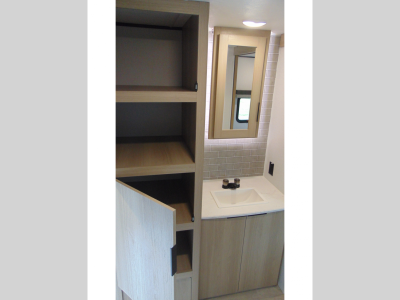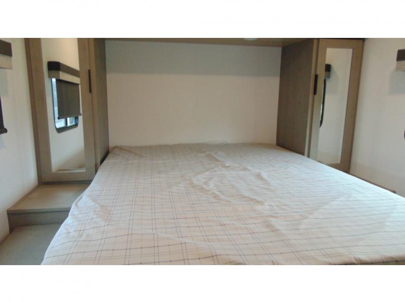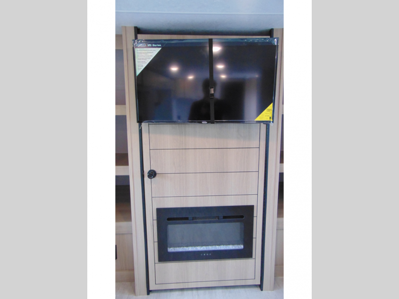 If you're looking for a unique travel trailer, this is the one! The front living area features dual opposing sofa slides, theater seating, and hidden storage behind the entertainment center and fireplace. Your guests can make this their bedroom at night, while you take the king bed in the rear master bedroom. There is also a walk-thru bath that leads to the bedroom for added convenience. A full kitchen is complete with an oven, microwave, and 10 cu. ft. 12V refrigerator, plus there are two pantries to keep snacks stocked.