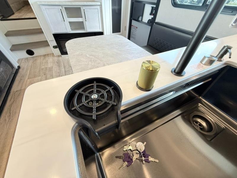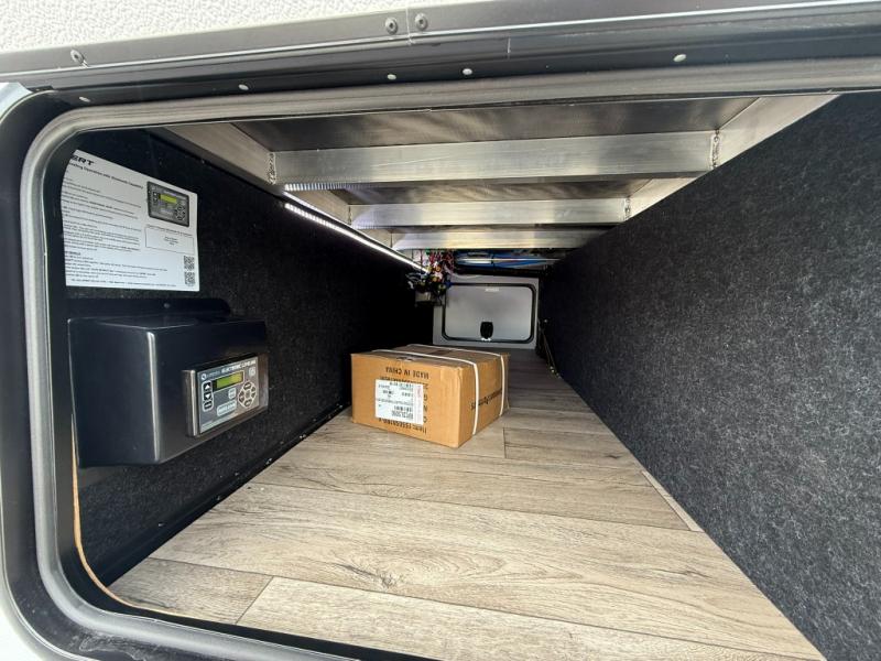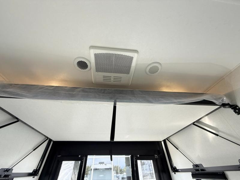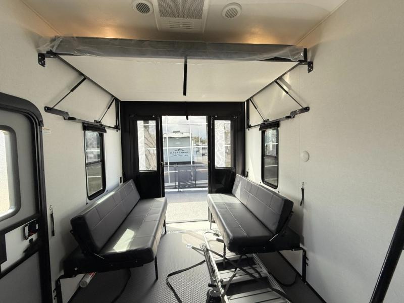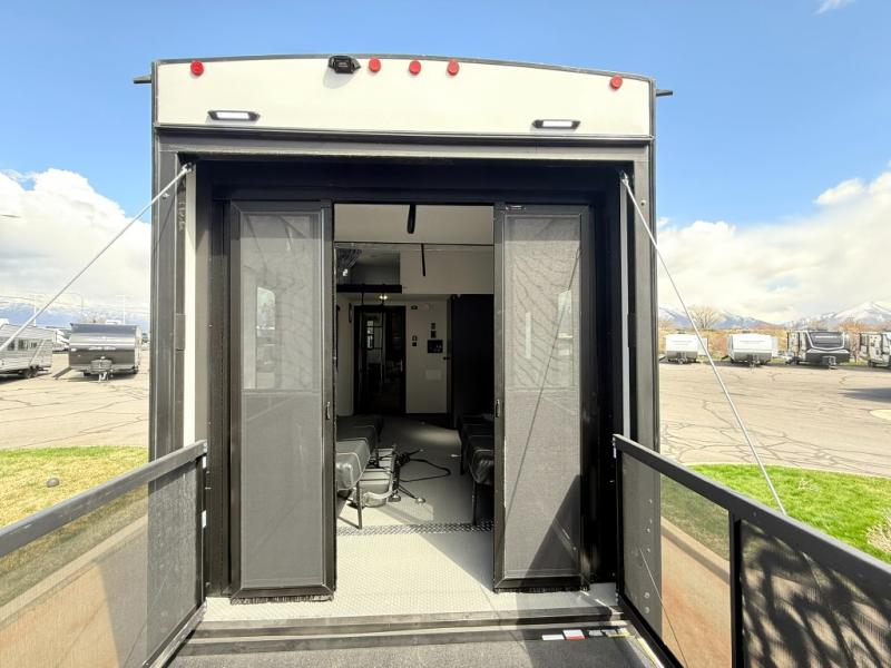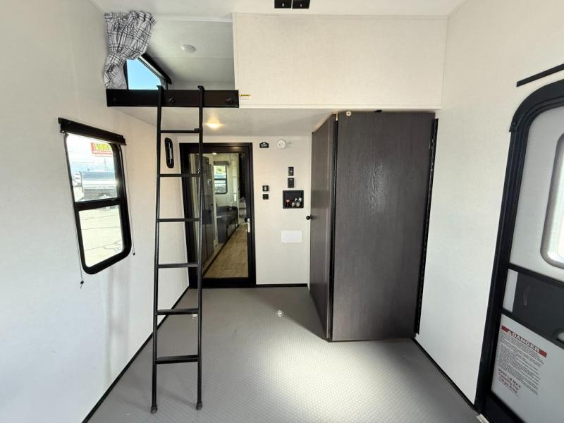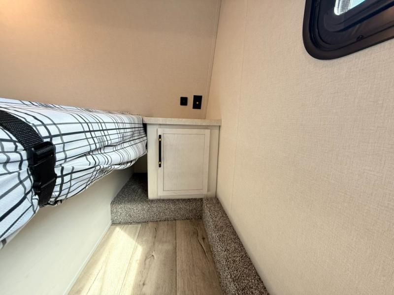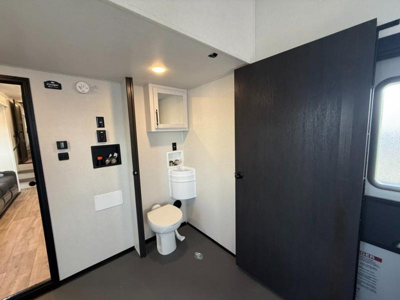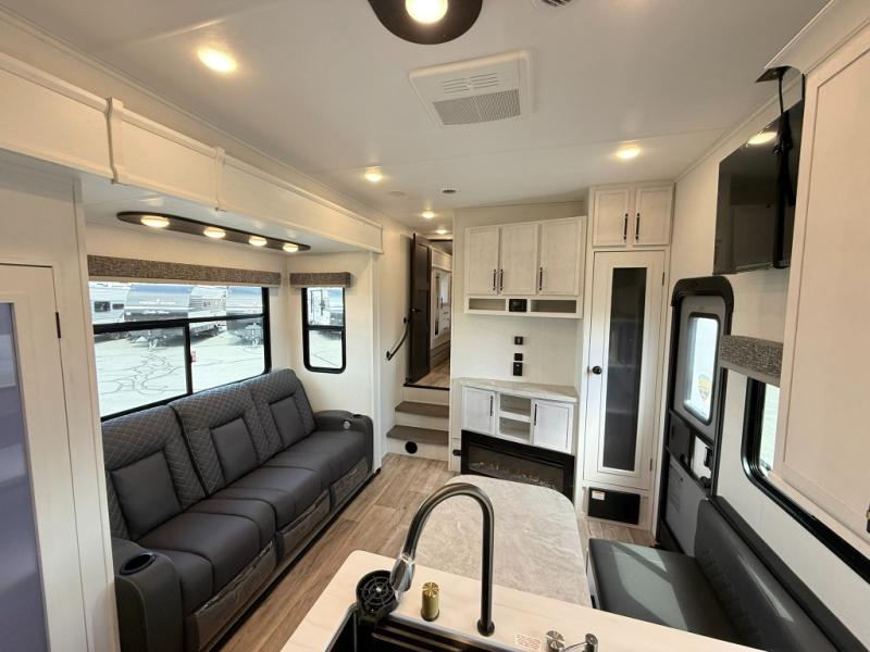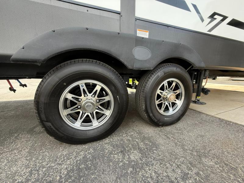 Load up your favorite off-road toys, grab a few friends and head out for a weekend of fun! This Voltage V-Series features a 14' garage with sleeping for seven or eight with the Bed Lift System over the dual sofas and dinette which convert to more sleeping in the garage area, a loft, and private front bedroom with queen bed. The main combined kitchen and living space features a reclining sofa with foot rest housed in the large slide that also includes a 16 cu. ft. 12V refrigerator and pantry for all of your food storage needs. There are full kitchen and bath amenities to keep you fueled and clean, and you will also enjoy the 40" TV and fireplace when relaxing inside. A 21' awning offers additional living space outside, and there is a Pac & Stack half bath in the garage for added convenience when coming in from a ride located beneath the loft. This unit also offers ample storage with a full pass-through compartment outside, and inside cabinets, pantry storage, plus wardrobe, dresser, and under bed storage as well.