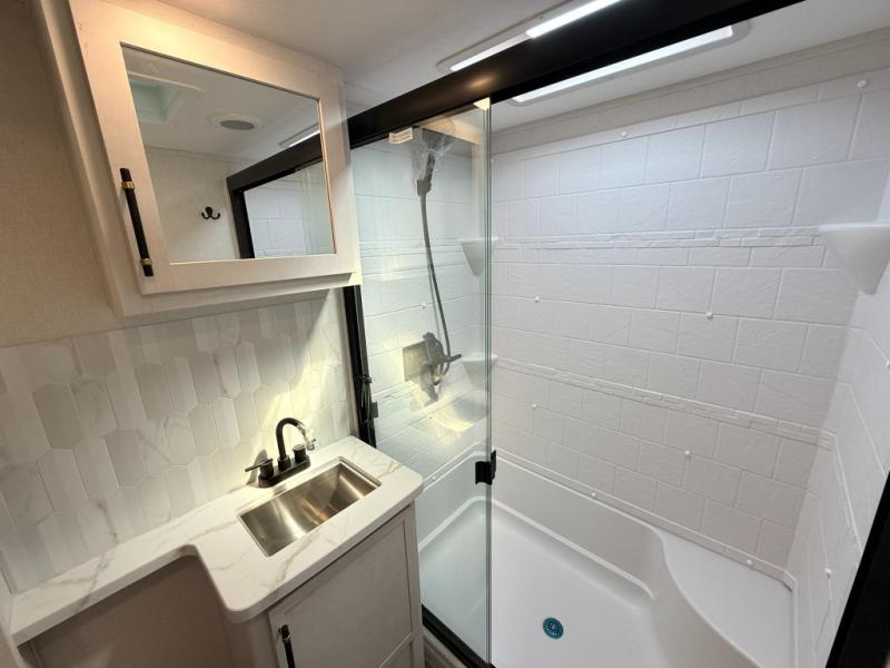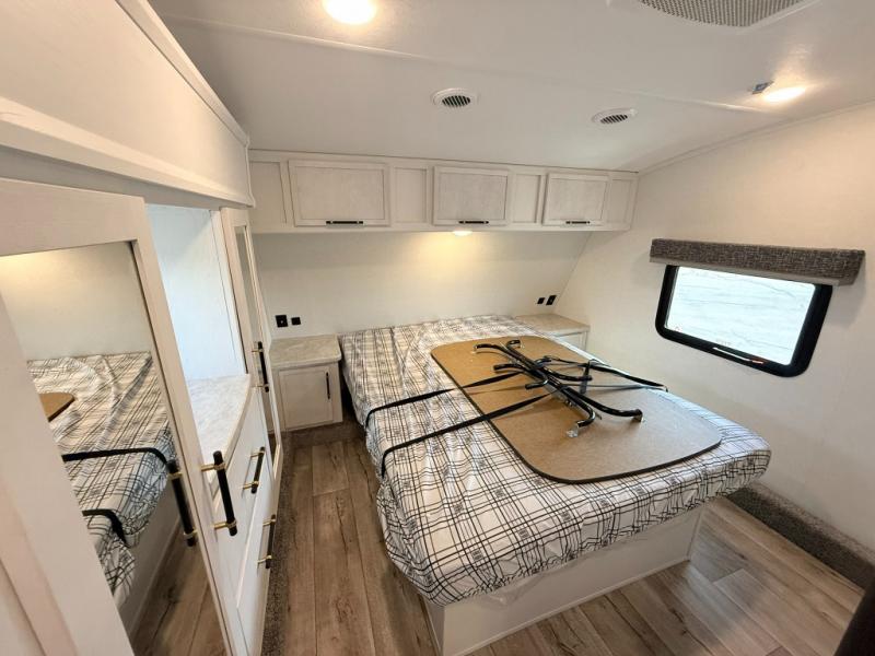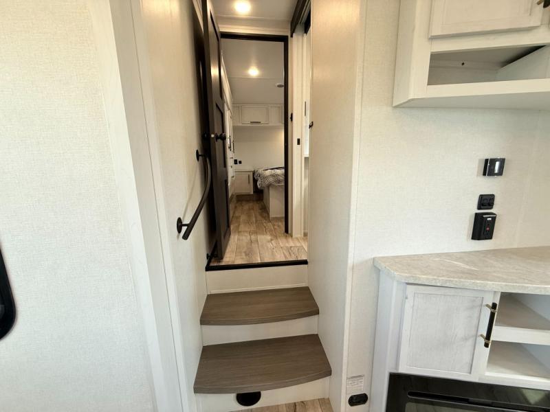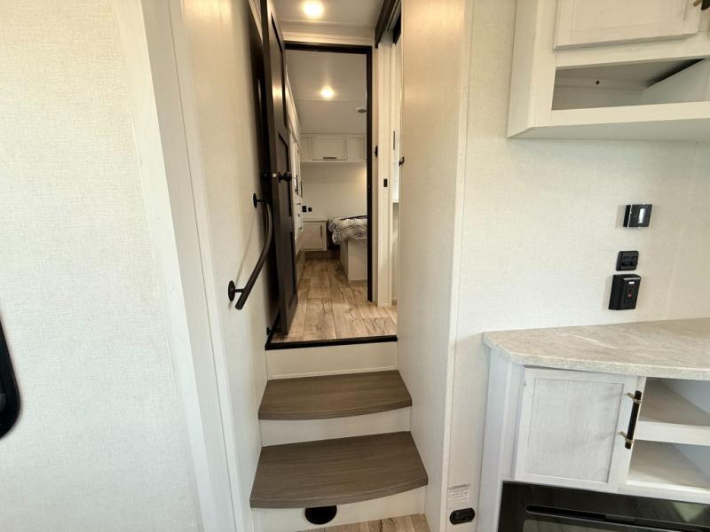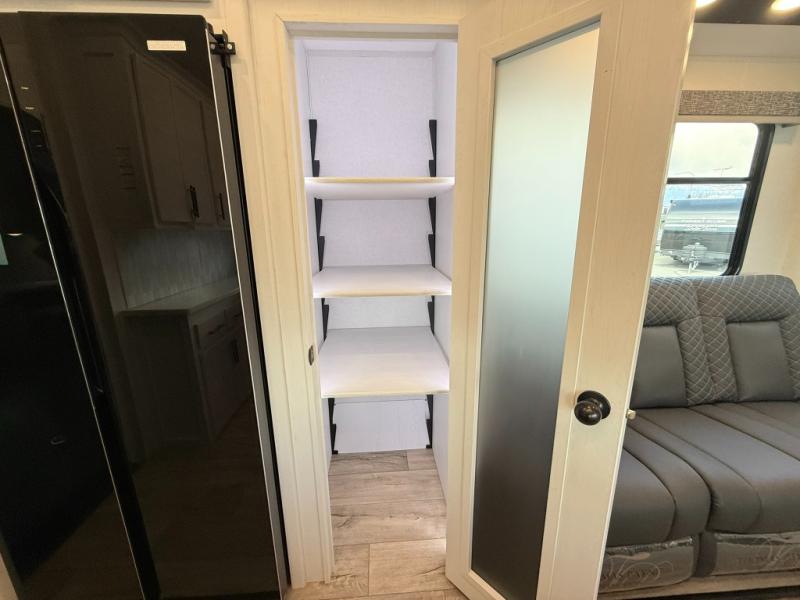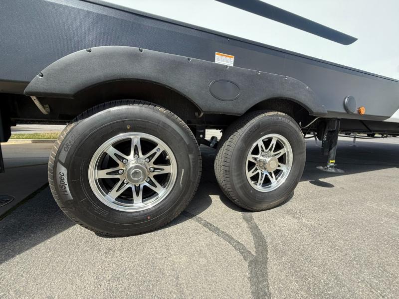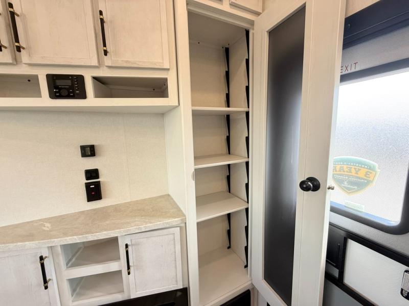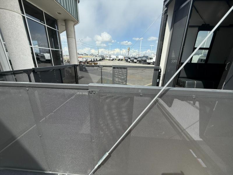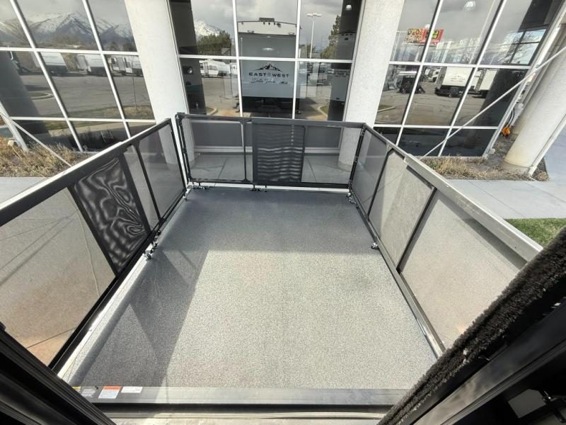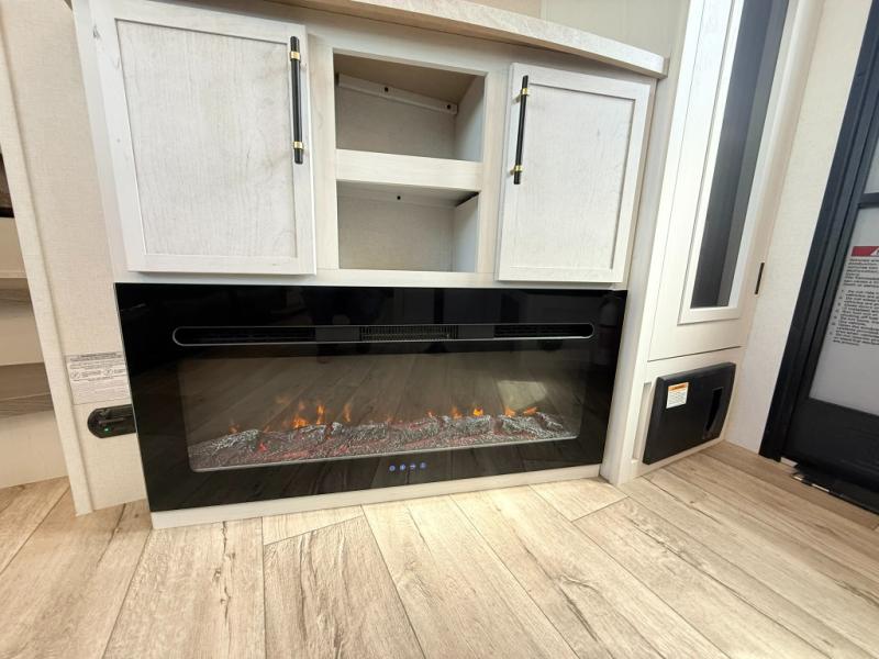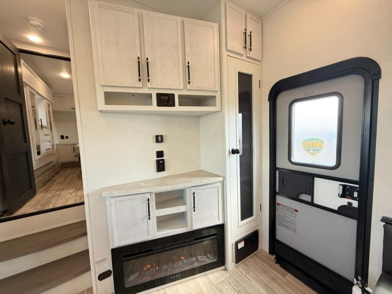 Load up your favorite off-road toys, grab a few friends and head out for a weekend of fun! This Voltage V-Series features a 14' garage with sleeping for seven or eight with the Bed Lift System over the dual sofas and dinette which convert to more sleeping in the garage area, a loft, and private front bedroom with queen bed. The main combined kitchen and living space features a reclining sofa with foot rest housed in the large slide that also includes a 16 cu. ft. 12V refrigerator and pantry for all of your food storage needs. There are full kitchen and bath amenities to keep you fueled and clean, and you will also enjoy the 40" TV and fireplace when relaxing inside. A 21' awning offers additional living space outside, and there is a Pac & Stack half bath in the garage for added convenience when coming in from a ride located beneath the loft. This unit also offers ample storage with a full pass-through compartment outside, and inside cabinets, pantry storage, plus wardrobe, dresser, and under bed storage as well.