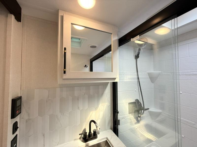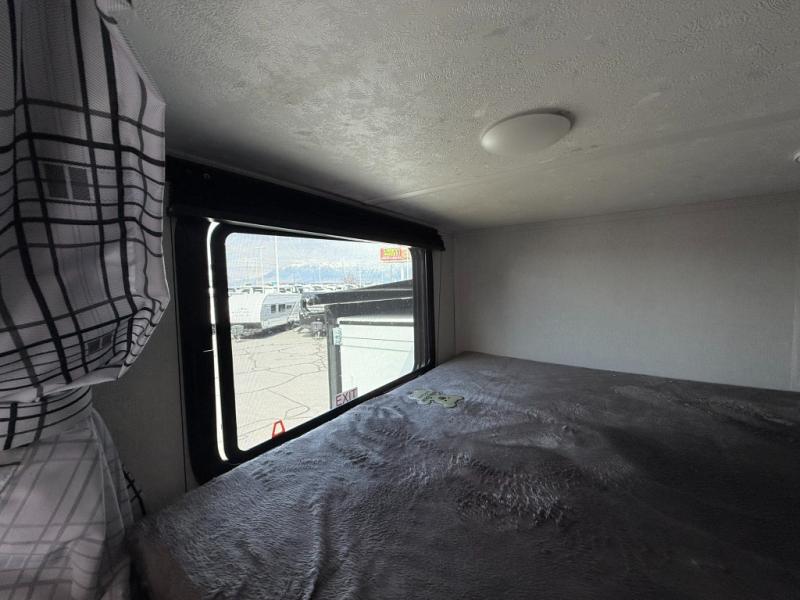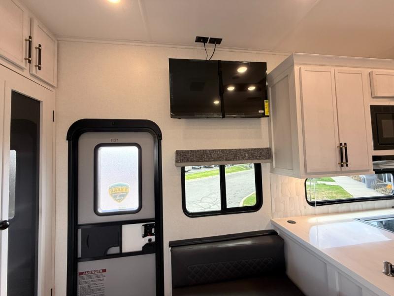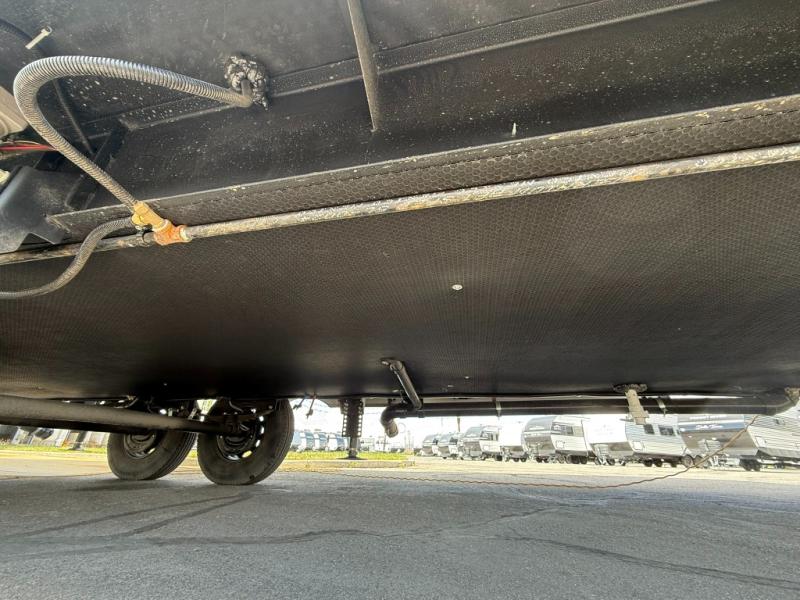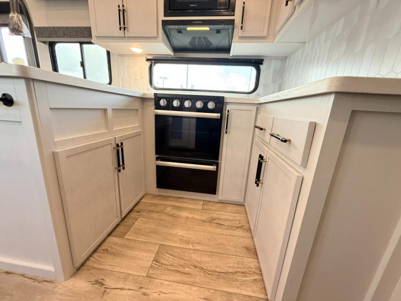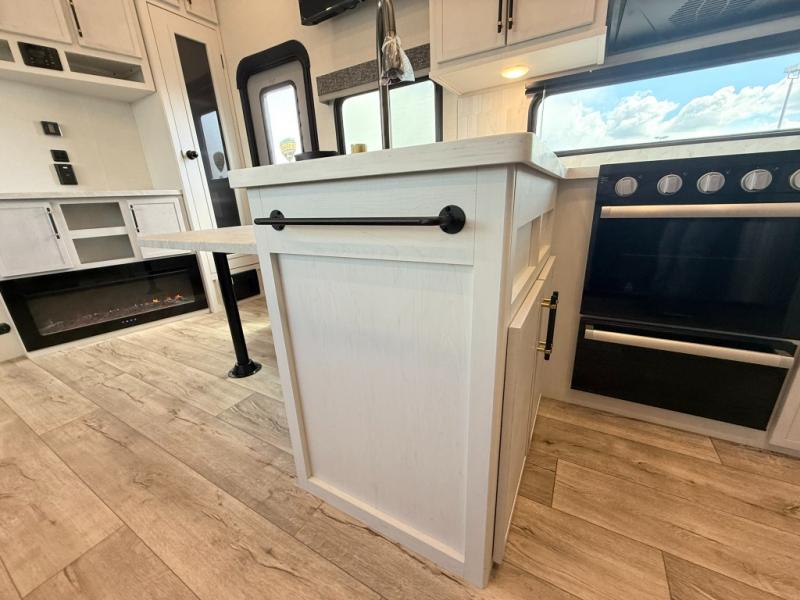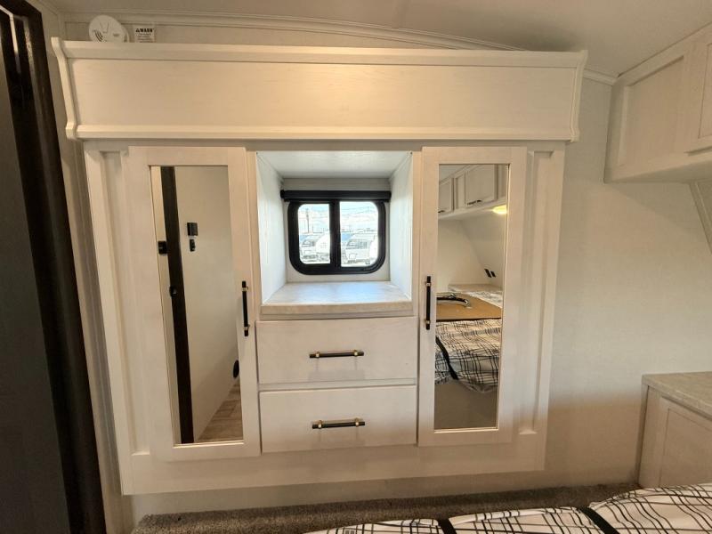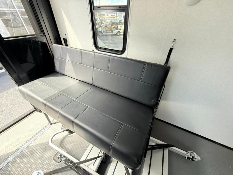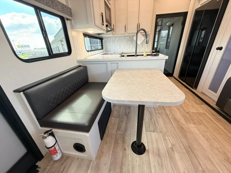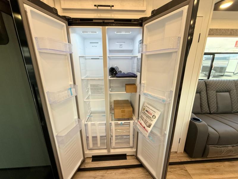 Load up your favorite off-road toys, grab a few friends and head out for a weekend of fun! This Voltage V-Series features a 14' garage with sleeping for seven or eight with the Bed Lift System over the dual sofas and dinette which convert to more sleeping in the garage area, a loft, and private front bedroom with queen bed. The main combined kitchen and living space features a reclining sofa with foot rest housed in the large slide that also includes a 16 cu. ft. 12V refrigerator and pantry for all of your food storage needs. There are full kitchen and bath amenities to keep you fueled and clean, and you will also enjoy the 40" TV and fireplace when relaxing inside. A 21' awning offers additional living space outside, and there is a Pac & Stack half bath in the garage for added convenience when coming in from a ride located beneath the loft. This unit also offers ample storage with a full pass-through compartment outside, and inside cabinets, pantry storage, plus wardrobe, dresser, and under bed storage as well.