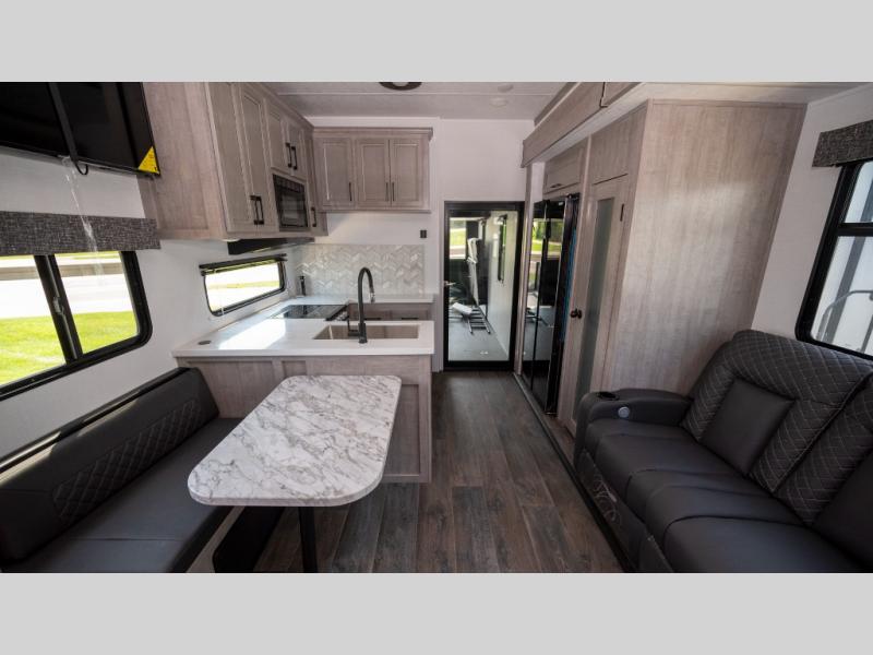 The Voltage V-Series by Dutchmen RV is a smaller and lighter weight choice when it comes to a toy hauler. These were designed with the same comforts that you would find in the standard Voltage models with the Signature Series collection including glazed cabinets with raised panel cabinet doors, modern hardware throughout, upgraded finishes and custom paint and stain. You will also enjoy the tankless water heater, garage Bed Lift System, Tuff Ply garage floor, and weight assisted ramp door for ease in loading and unloading your toys. A few bonus features like a 50" walk-in shower, 40" fireplace, and 30 gallon fuel station just makes your adventures that much more enjoyable! Come choose the Voltage V-Series as your new lightweight companion toy hauler today!
