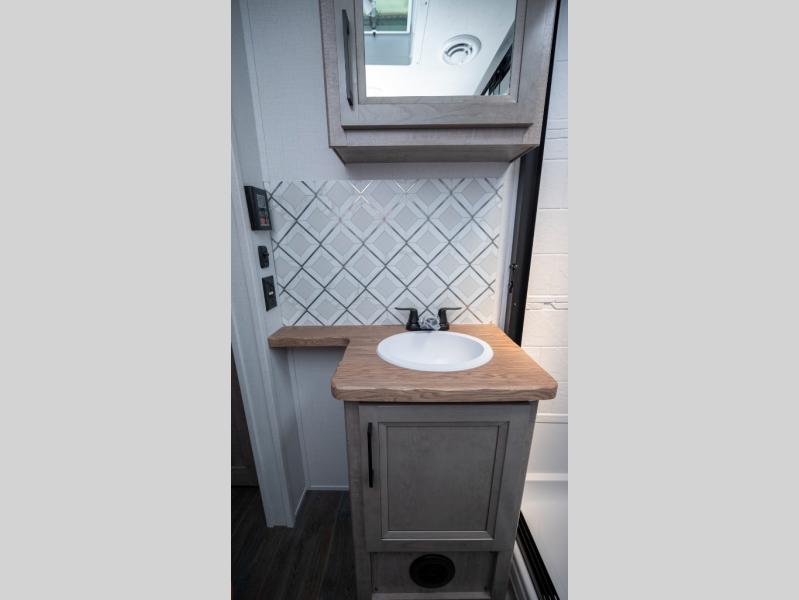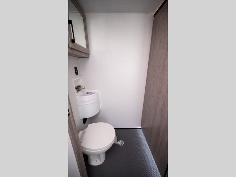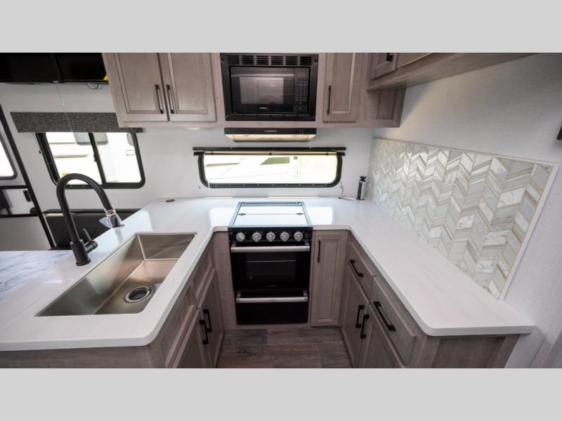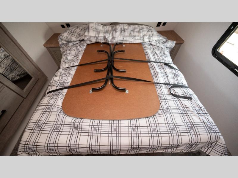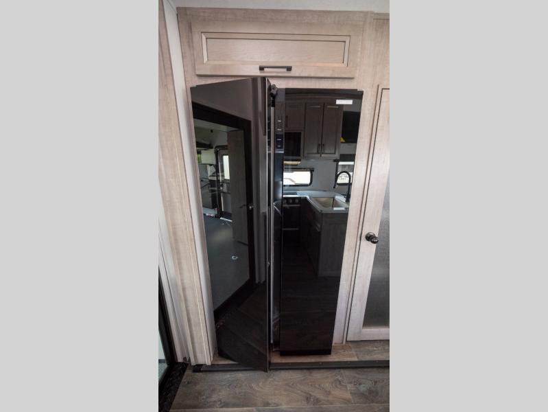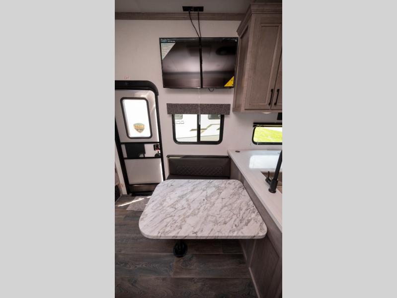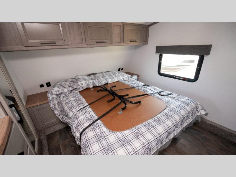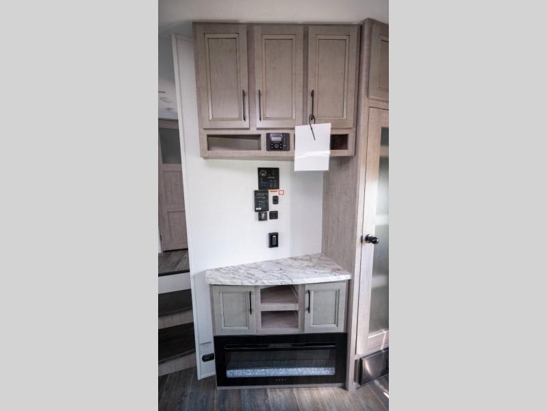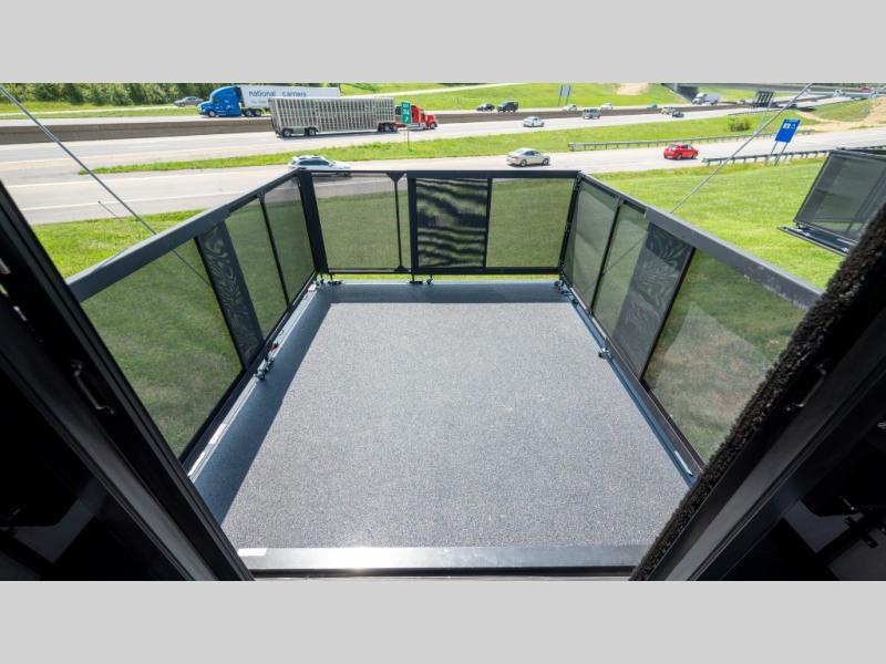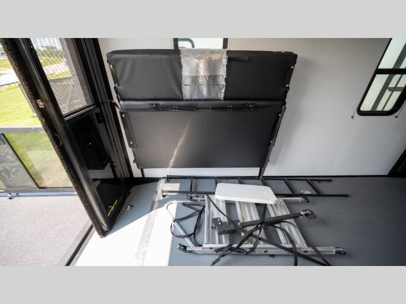 Load up your favorite off-road toys, grab a few friends and head out for a weekend of fun! This Voltage V-Series features a 14' garage with sleeping for seven or eight with the Bed Lift System over the dual sofas and dinette which convert to more sleeping in the garage area, a loft, and private front bedroom with queen bed. The main combined kitchen and living space features a reclining sofa with foot rest housed in the large slide that also includes a 16 cu. ft. 12V refrigerator and pantry for all of your food storage needs. There are full kitchen and bath amenities to keep you fueled and clean, and you will also enjoy the 40" TV and fireplace when relaxing inside. A 21' awning offers additional living space outside, and there is a Pac & Stack half bath in the garage for added convenience when coming in from a ride located beneath the loft. This unit also offers ample storage with a full pass-through compartment outside, and inside cabinets, pantry storage, plus wardrobe, dresser, and under bed storage as well.