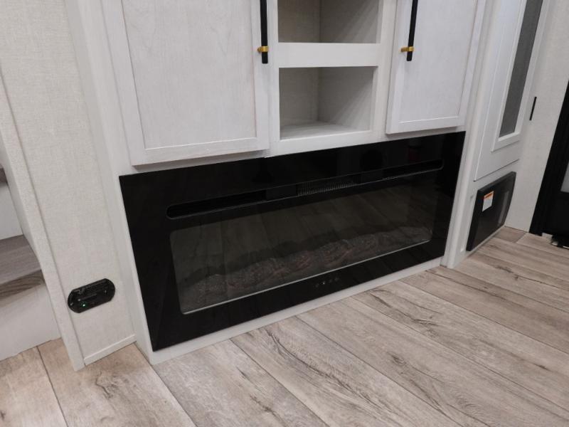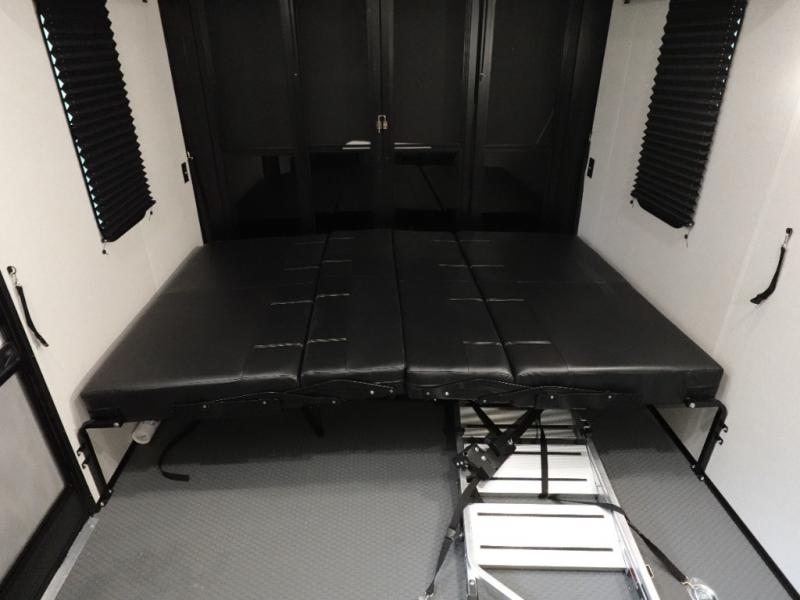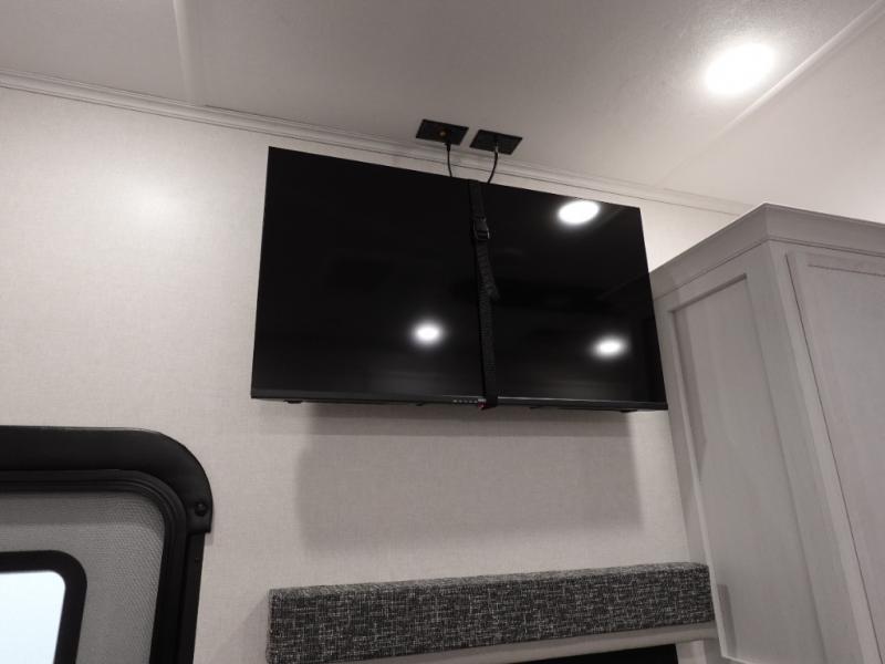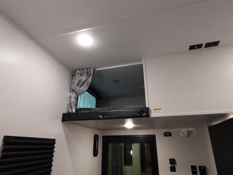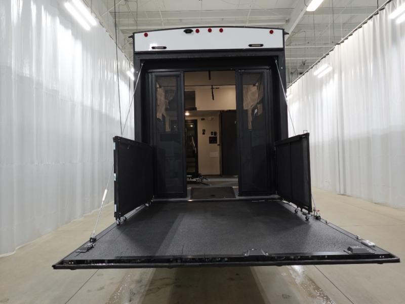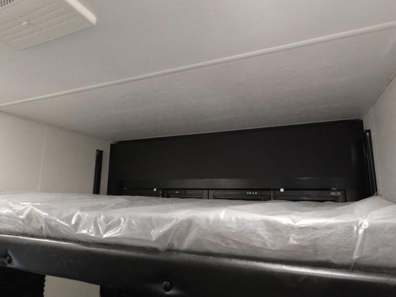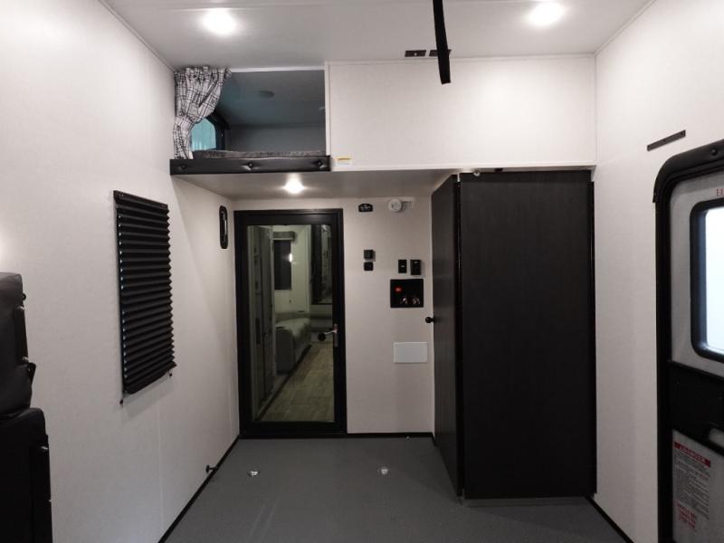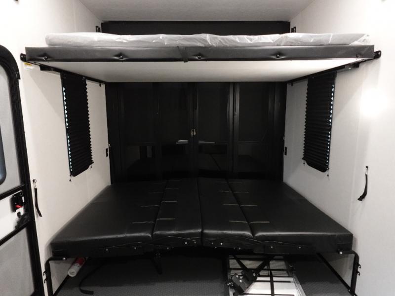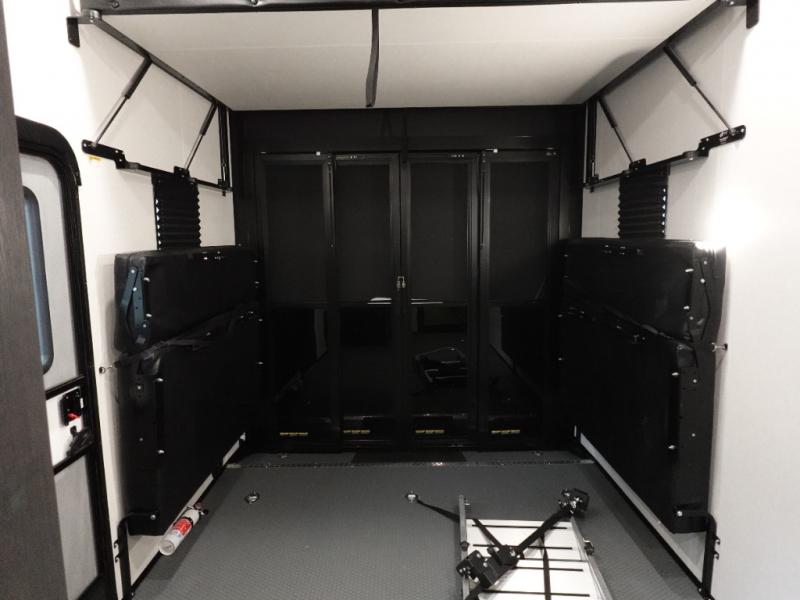 Load up your favorite off-road toys, grab a few friends and head out for a weekend of fun! This Voltage V-Series features a 14' garage with sleeping for seven or eight with the Bed Lift System over the dual sofas and dinette which convert to more sleeping in the garage area, a loft, and private front bedroom with queen bed. The main combined kitchen and living space features a reclining sofa with foot rest housed in the large slide that also includes a 16 cu. ft. 12V refrigerator and pantry for all of your food storage needs. There are full kitchen and bath amenities to keep you fueled and clean, and you will also enjoy the 40" TV and fireplace when relaxing inside. A 21' awning offers additional living space outside, and there is a Pac & Stack half bath in the garage for added convenience when coming in from a ride located beneath the loft. This unit also offers ample storage with a full pass-through compartment outside, and inside cabinets, pantry storage, plus wardrobe, dresser, and under bed storage as well.
