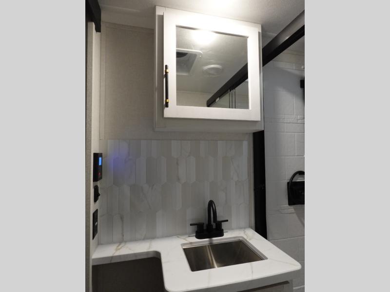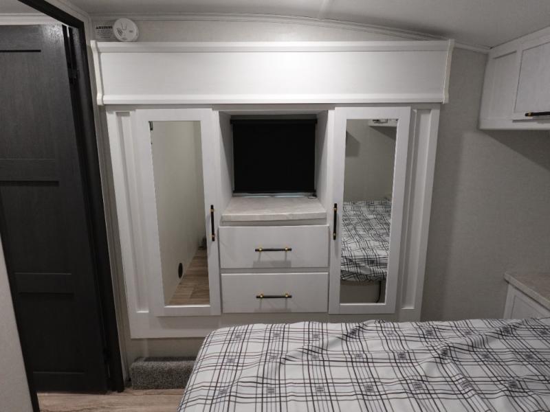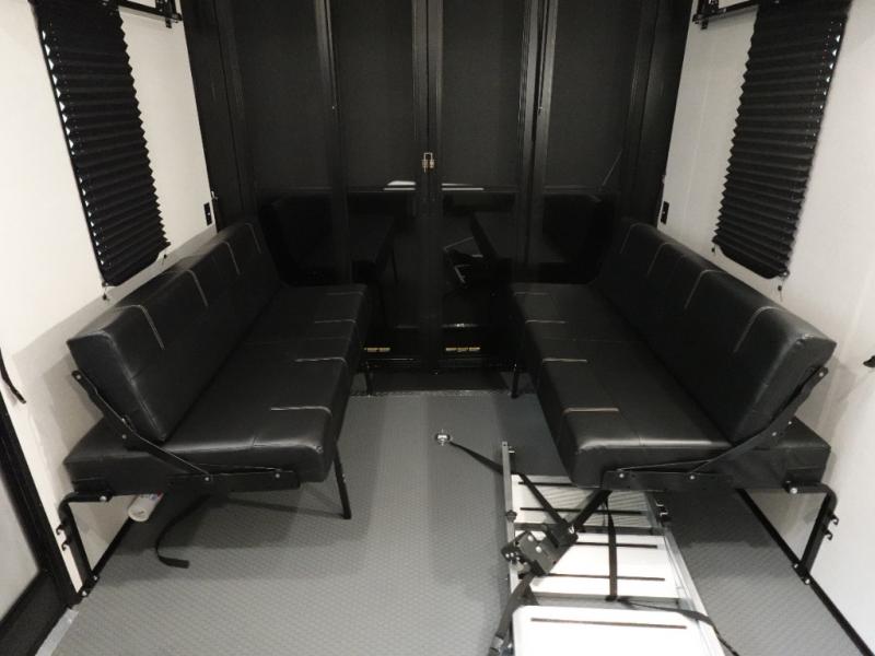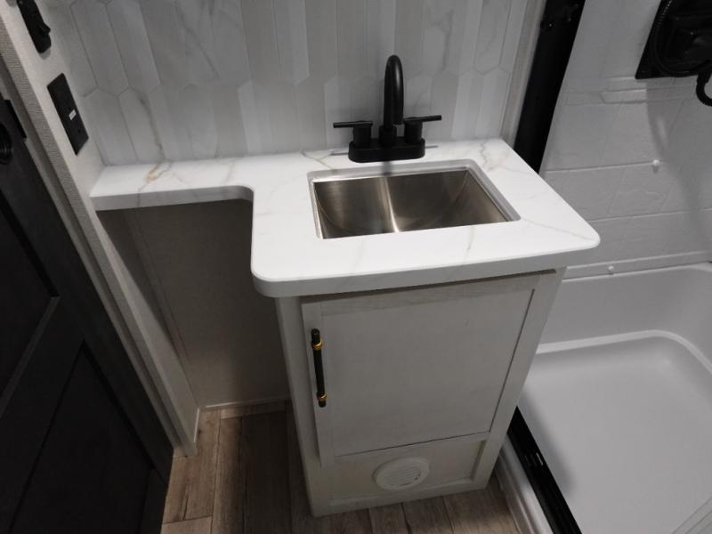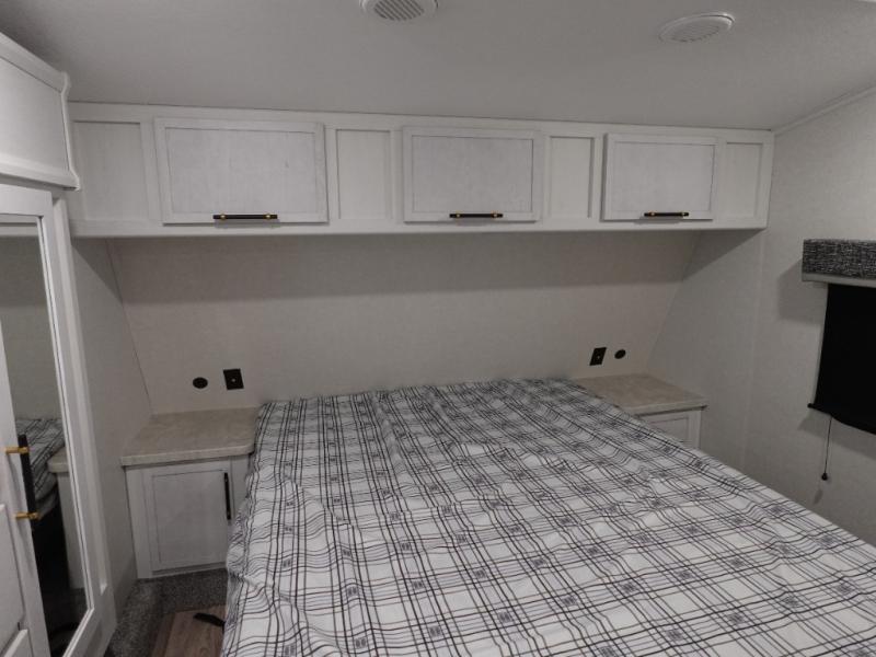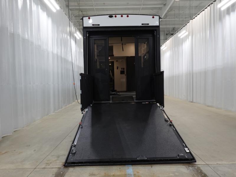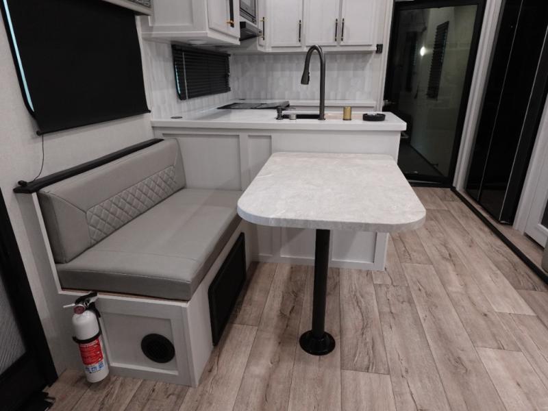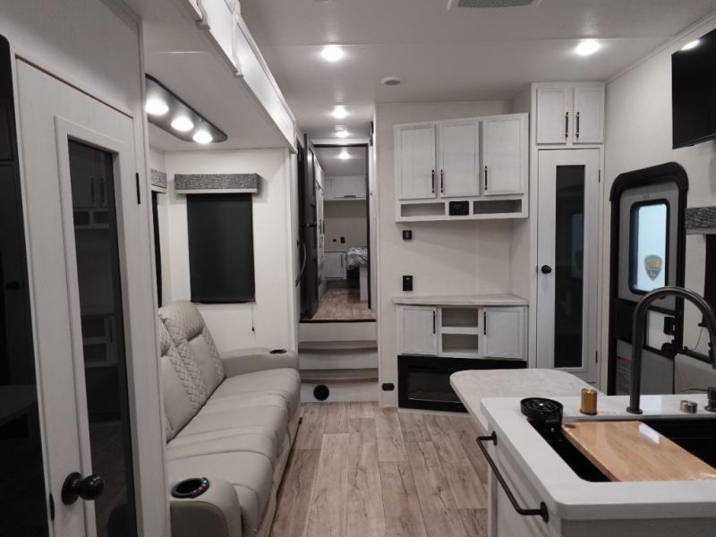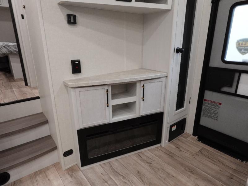 Load up your favorite off-road toys, grab a few friends and head out for a weekend of fun! This Voltage V-Series features a 14' garage with sleeping for seven or eight with the Bed Lift System over the dual sofas and dinette which convert to more sleeping in the garage area, a loft, and private front bedroom with queen bed. The main combined kitchen and living space features a reclining sofa with foot rest housed in the large slide that also includes a 16 cu. ft. 12V refrigerator and pantry for all of your food storage needs. There are full kitchen and bath amenities to keep you fueled and clean, and you will also enjoy the 40" TV and fireplace when relaxing inside. A 21' awning offers additional living space outside, and there is a Pac & Stack half bath in the garage for added convenience when coming in from a ride located beneath the loft. This unit also offers ample storage with a full pass-through compartment outside, and inside cabinets, pantry storage, plus wardrobe, dresser, and under bed storage as well.