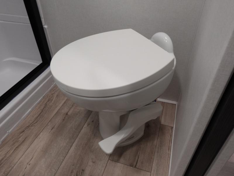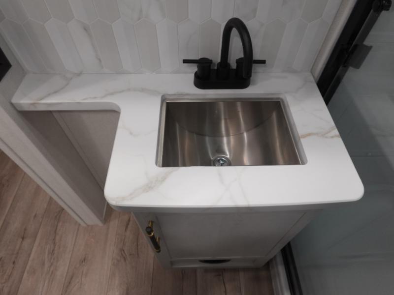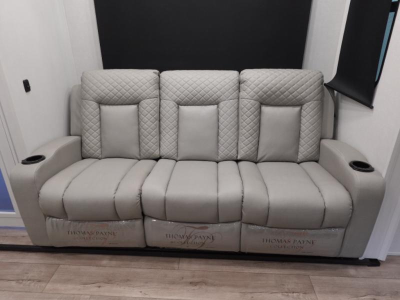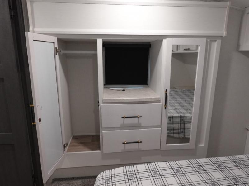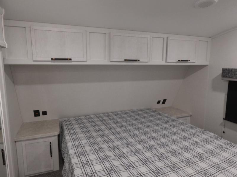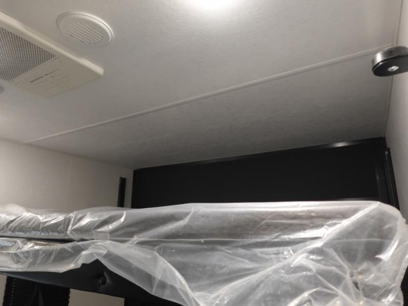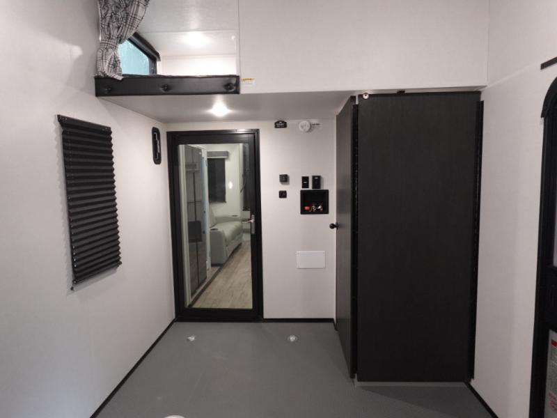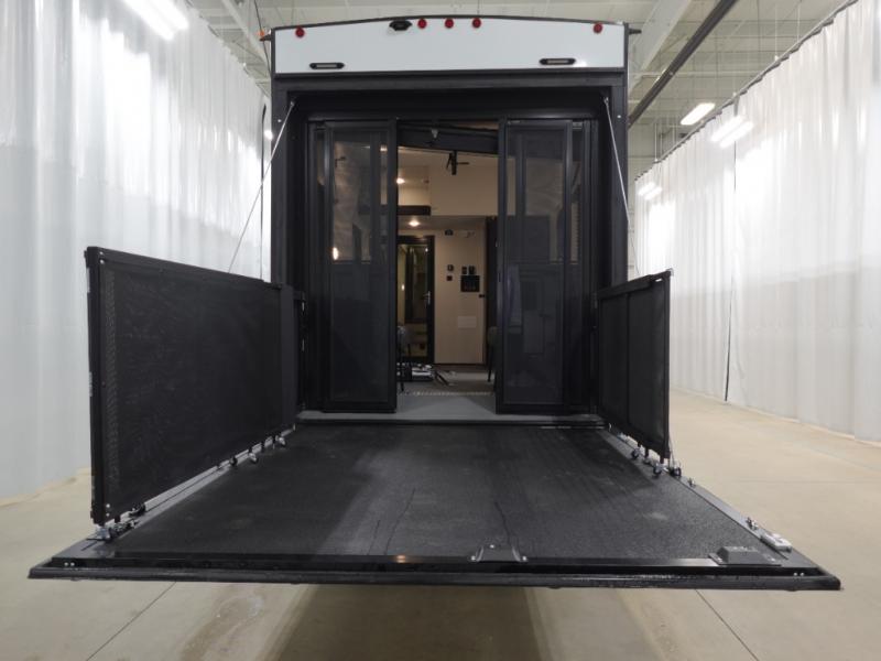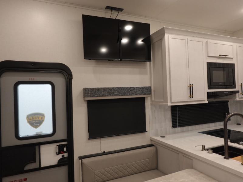 Load up your favorite off-road toys, grab a few friends and head out for a weekend of fun! This Voltage V-Series features a 14' garage with sleeping for seven or eight with the Bed Lift System over the dual sofas and dinette which convert to more sleeping in the garage area, a loft, and private front bedroom with private bed. The main combined kitchen and living space features a reclining sofa with foot rest housed in the large slide that also includes a 16 cu. ft. 12V refrigerator and pantry for all of your food storage needs. There are full kitchen and bath amenities to keep you fueled and clean, and you will also enjoy the 40" TV and fireplace when relaxing inside. A 21' awning offers additional living space outside, and there is a Pac & Stack half bath in the garage for added convenience when coming in from a ride located beneath the loft. This unit also offers ample storage with a full pass-through compartment outside, and inside cabinets, pantry storage, plus wardrobe, dresser, and under bed storage as well.