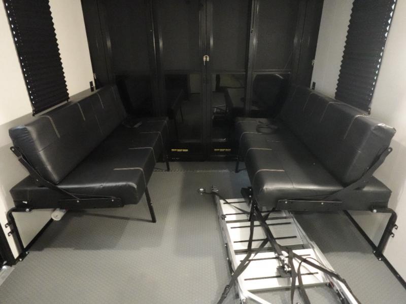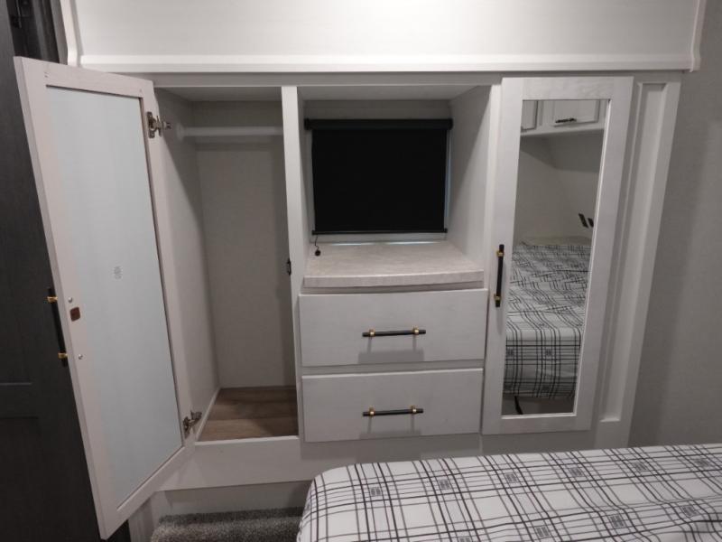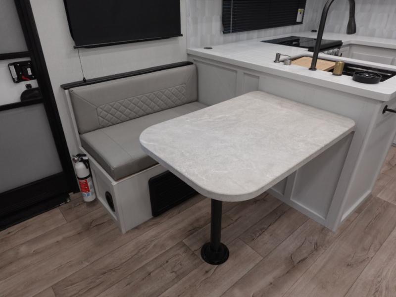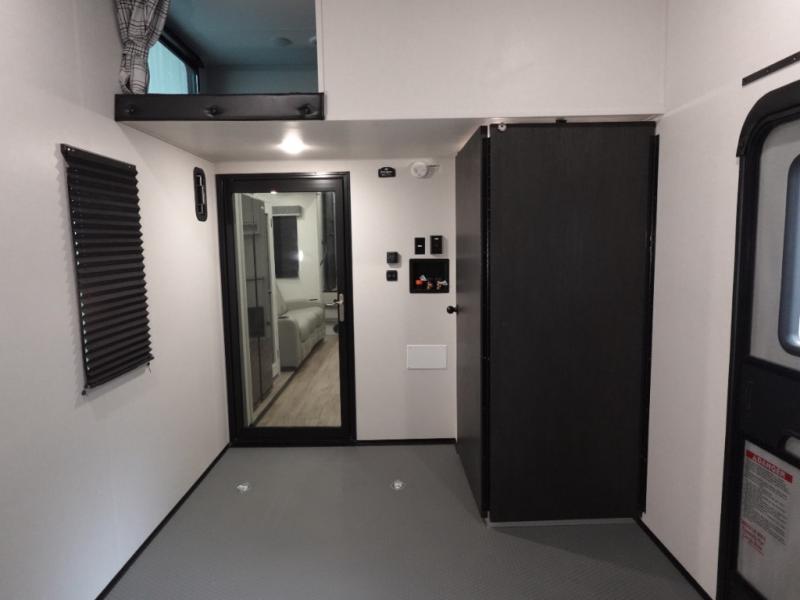Load up your favorite off-road toys, grab a few friends and head out for a weekend of fun! This Voltage V-Series features a 14' garage with sleeping for seven or eight with the Bed Lift System over the dual sofas and dinette which convert to more sleeping in the garage area, a loft, and private front bedroom with queen bed. The main combined kitchen and living space features a reclining sofa with foot rest housed in the large slide that also includes a 16 cu. ft. 12V refrigerator and pantry for all of your food storage needs. There are full kitchen and bath amenities to keep you fueled and clean, and you will also enjoy the 40" TV and fireplace when relaxing inside. A 21' awning offers additional living space outside, and there is a Pac & Stack half bath in the garage for added convenience when coming in from a ride located beneath the loft. This unit also offers ample storage with a full pass-through compartment outside, and inside cabinets, pantry storage, plus wardrobe, dresser, and under bed storage as well.