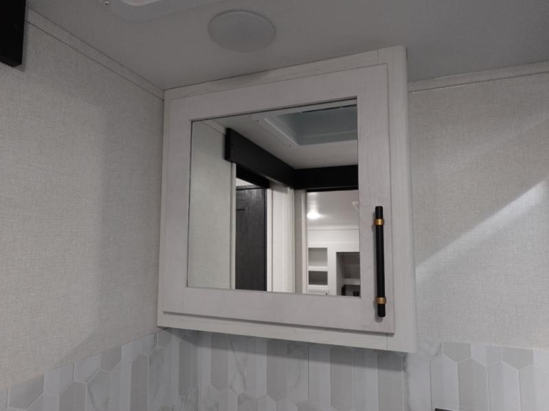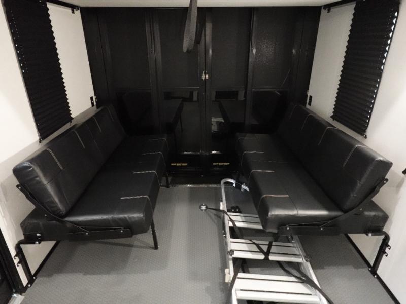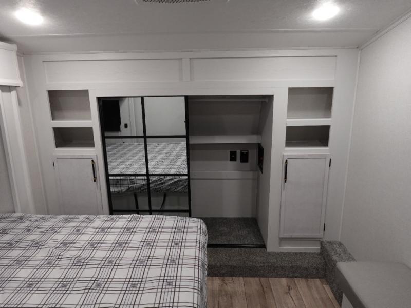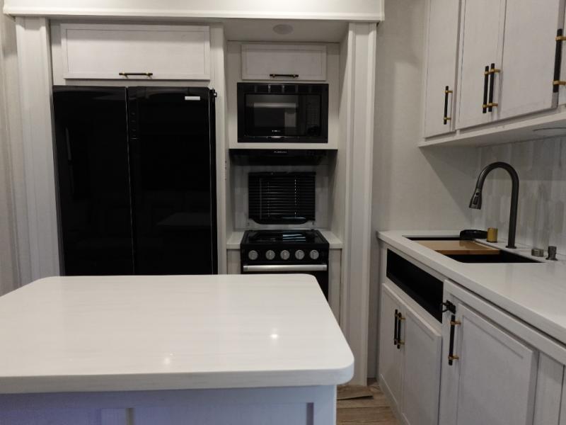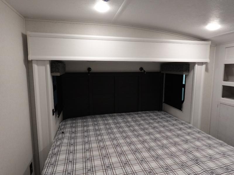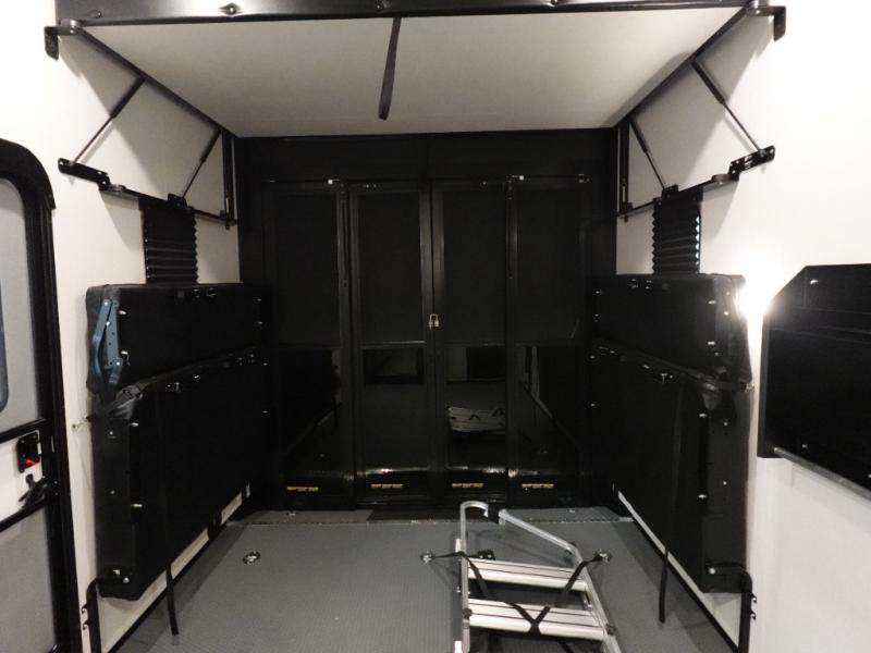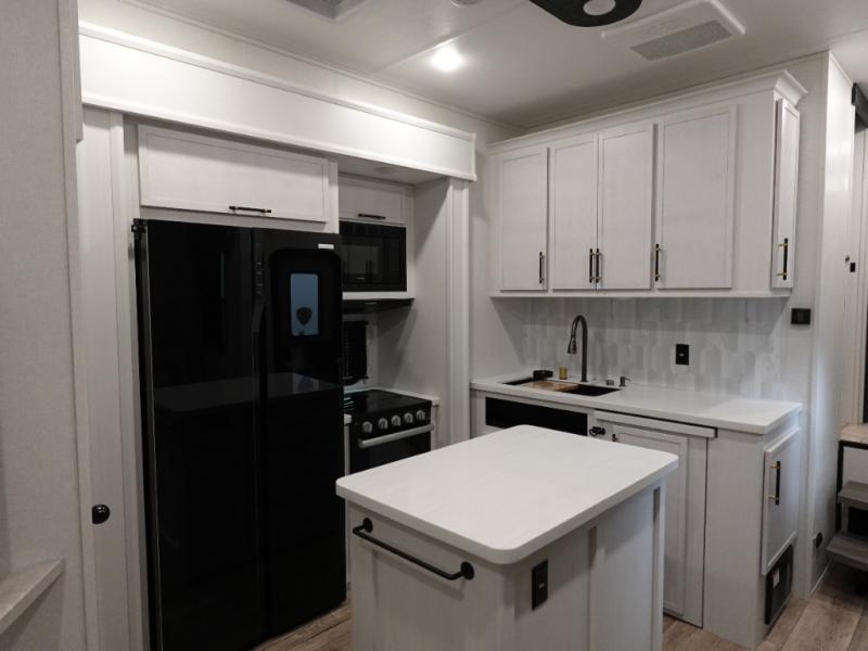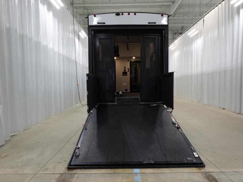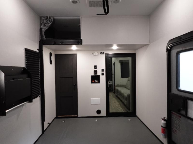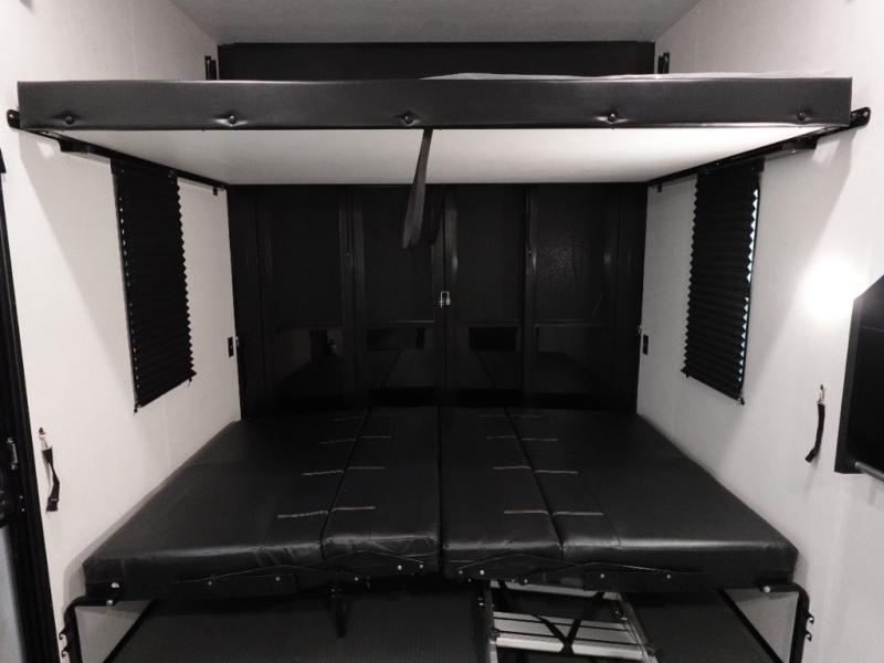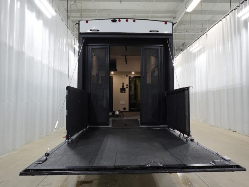 This toy hauler includes dual entry doors for a smooth flow of traffic, a bath and a half for hassle-free camping, plus a 14' separate garage for your favorite toys! The garage also includes a bed lift system and lay-flat Happi Jack seating plus a loft bed for more sleeping space. You'll find your own space up front in the private bedroom, complete with a king bed slide out and a large front closet to keep your things organized. And the full bath with a walk-in shower is close by for easy nighttime use! Everyone can meet in the middle kitchen and living room to enjoy the reclining sofa with a footrest and 50" TV while the chef whips up dinner on the three burner cooktop! There is also a kitchen island for more counter space plus a pantry and 16 cu. ft. 12V refrigerator for food storage!