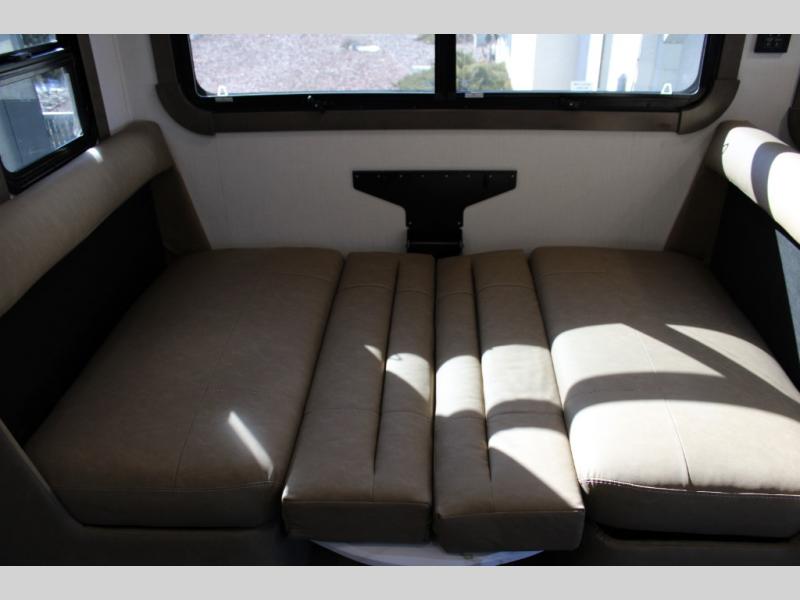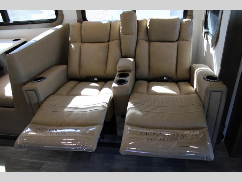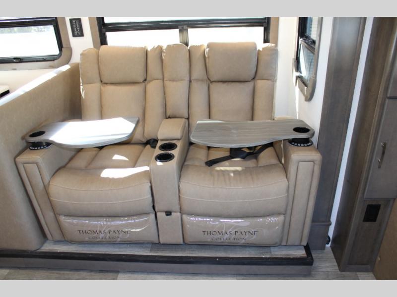 Trips across the state or country are made luxurious in this double slide out coach. The captain's seats can become a part of the living area once you are parked, and your guests can relax on the sofa sleeper or play a game at the booth dinette. There is also a 39" LED Smart TV across from the sofa for easy viewing. You will enjoy cooking in the kitchen on the sealed gas range or in the convection microwave, plus there is a 16 cu. ft. residential refrigerator with an ice maker for perishables. This Europa also features a rear master suite with a king bed slide out, a 32" LED Smart TV, and a large cedar-lined wardrobe. There are even LED reading lights and USB ports for added convenience. And you may want to add the cab-over bunk option to sleep more guests!