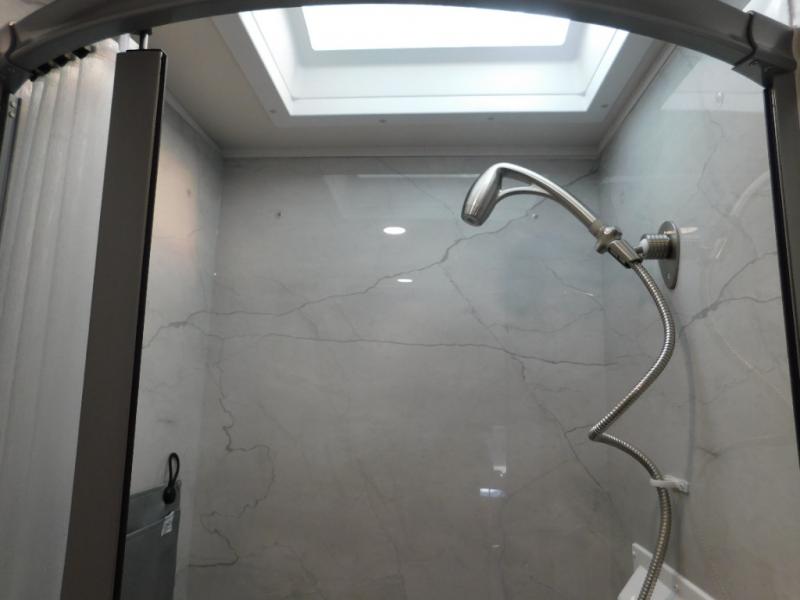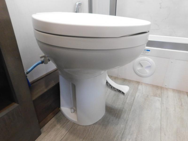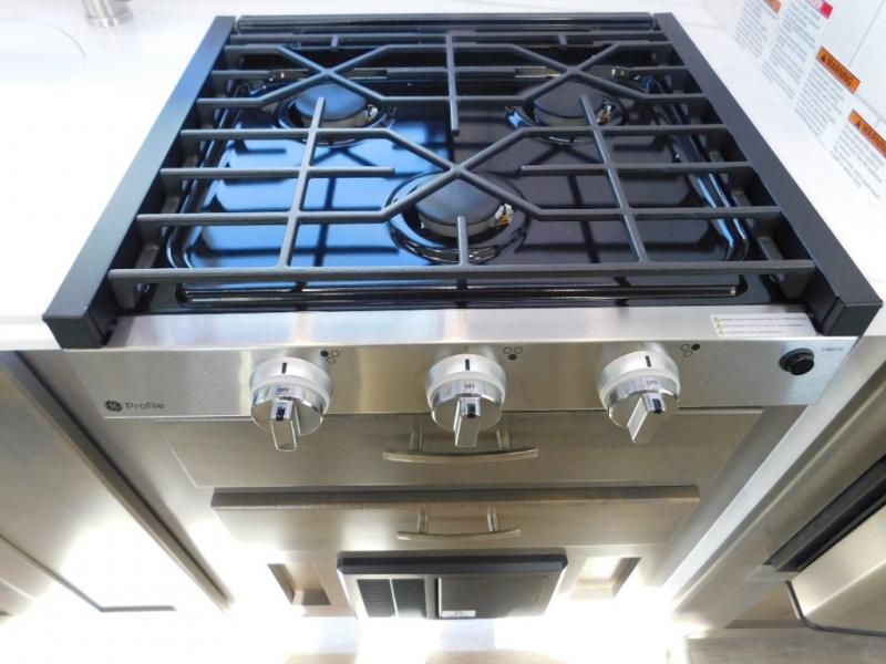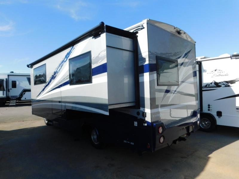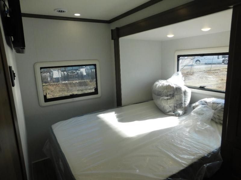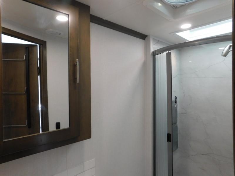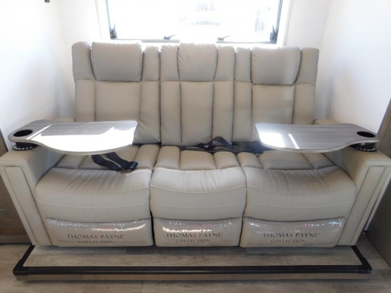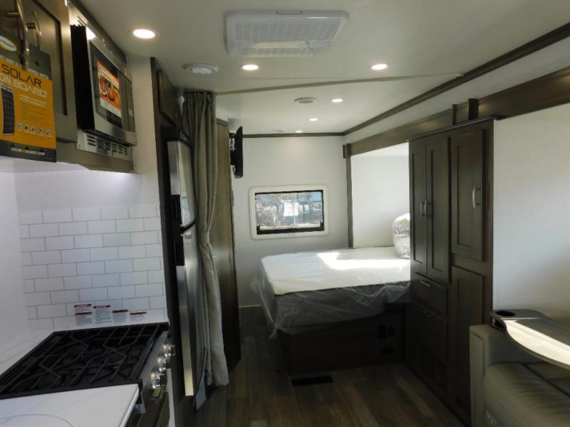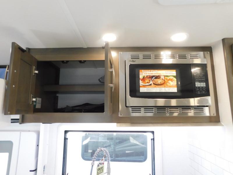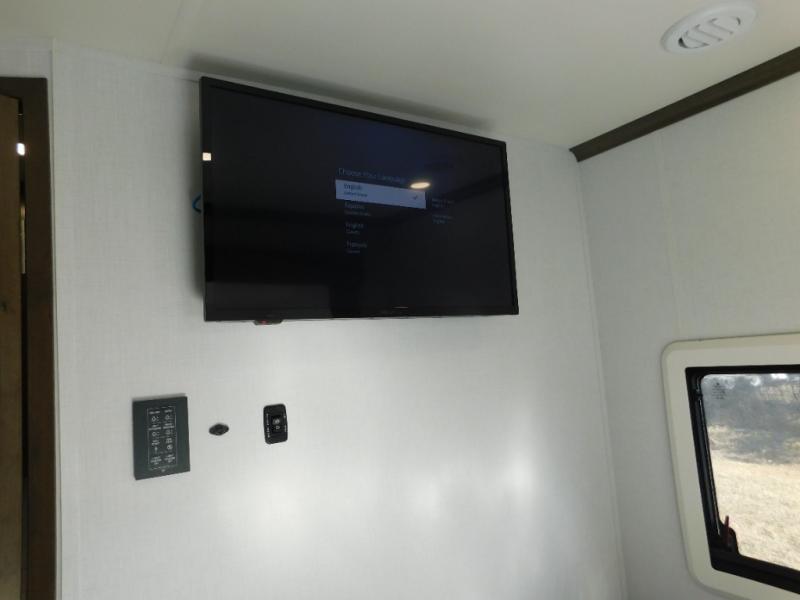 Take this motorhome on your greatest adventures yet! Start each morning feeling well rested after sleeping on the corner queen bed then head to the rear corner bathroom to freshen up in the shower with an Oxygenics body spa RV shower head and a skylight above for added headroom and natural lighting. Now that you're ready for the day, you can grab some eggs from the 8 cu. ft. two-door compressor-driven refrigerator and fry them up on the three burner cooktop, then enjoy them at the booth dinette. The kitchen also has a countertop extension for more meal prepping space and a convection microwave. This unit also includes a living room 32" LED Smart TV and a 32" LED smart TV across from the bed. You could even switch things up by replacing the booth dinette with an optional 3-seat power recliner, and adding a cab over bunk option!