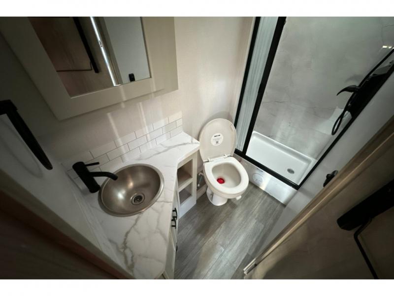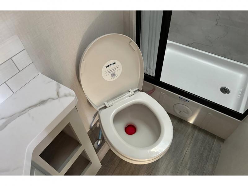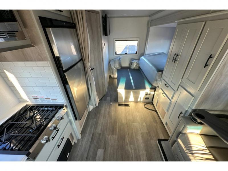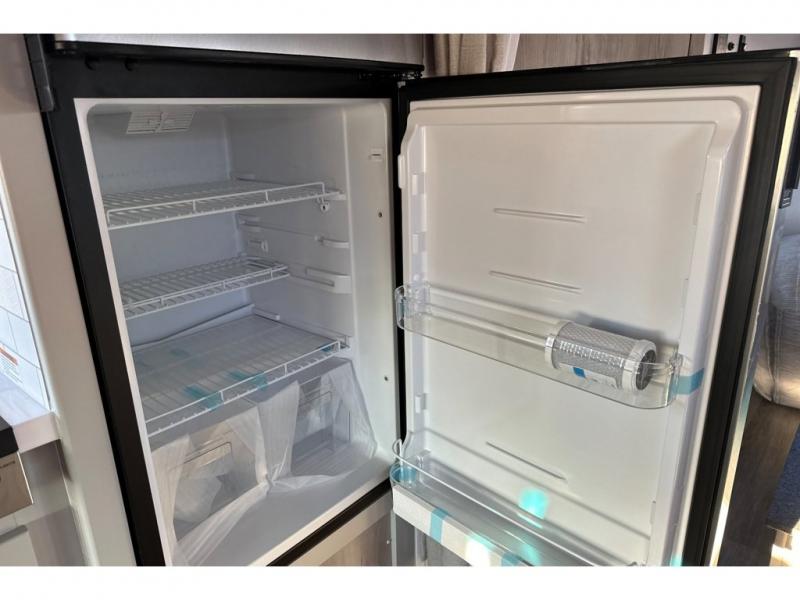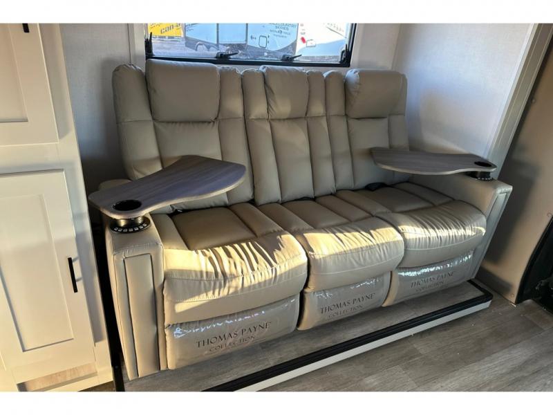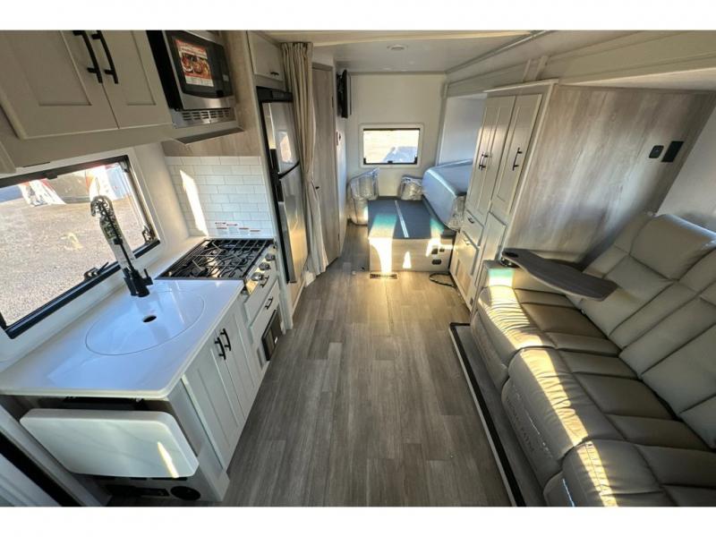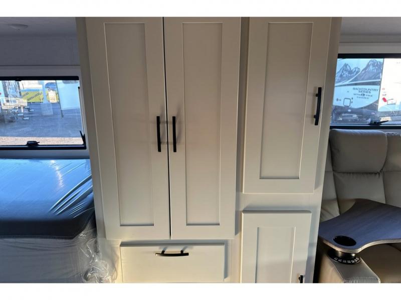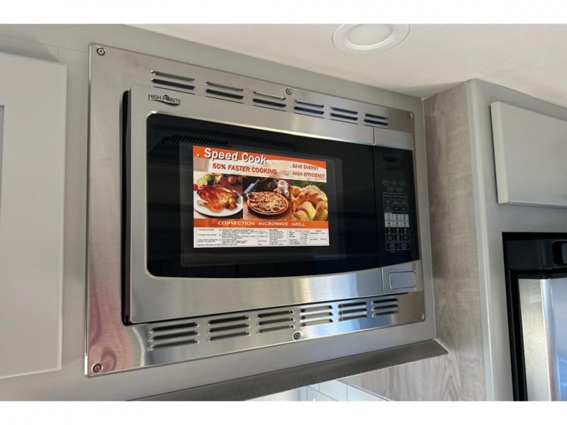 Take this motorhome on your greatest adventures yet! Start each morning feeling well rested after sleeping on the corner queen bed then head to the rear corner bathroom to freshen up in the shower with an Oxygenics body spa RV shower head and a skylight above for added headroom and natural lighting. Now that you're ready for the day, you can grab some eggs from the 8 cu. ft. two-door compressor-driven refrigerator and fry them up on the three burner cooktop, then enjoy them at the booth dinette. The kitchen also has a countertop extension for more meal prepping space and a convection microwave. This unit also includes a living room 32" LED Smart TV and a 32" LED smart TV across from the bed. You could even switch things up by replacing the booth dinette with an optional 3-seat power recliner, and adding a cab over bunk option!