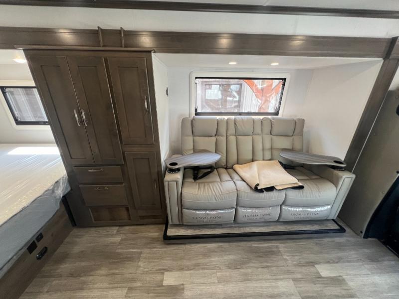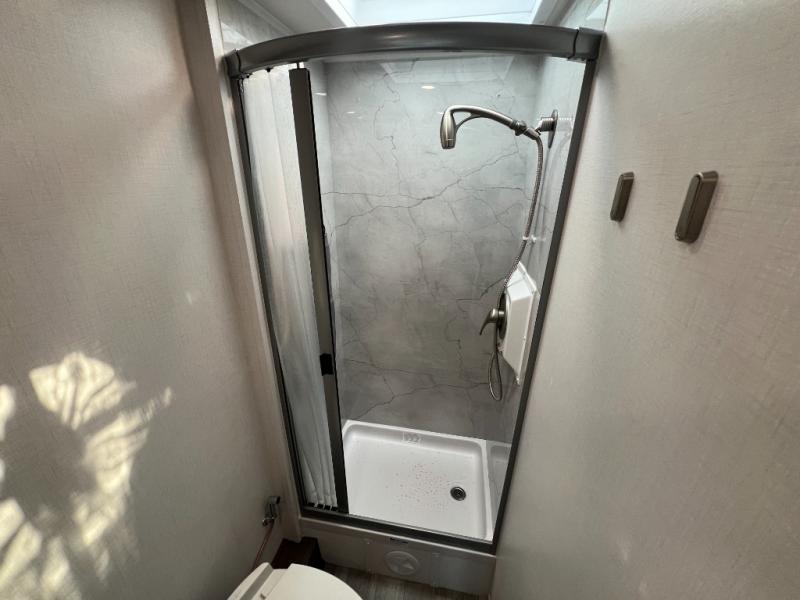 This Freedom Edition coach comes with an insulated cab curtain, an exclusive Freedom Edition Dark full-body paint scheme with two options, and two low-temp lithium house batteries. There is also an 8 cu. ft. 12V two-door compressor-driven refrigerator, a 50 gallon fresh water tank, a 3,000W pure sine wave inverter/charger, and more stand-out features! Start each morning feeling well rested after sleeping on the corner queen bed then head to the rear corner bathroom to freshen up in the shower with an Oxygenics body spa RV shower head and a skylight above for added headroom and natural lighting. Now that you're ready for the day, you can grab some eggs from the refrigerator and fry them up on the two burner induction range then enjoy them at the booth dinette. The kitchen also has a countertop extension for more meal prepping space and a convection microwave oven to pop a bag of popcorn. There is also a living room 32" LED TV and 32" LED smart TV across from the bed. You could even switch things up by replacing the booth dinette with an optional 3-seat power recliner, and adding a cab over bunk option!