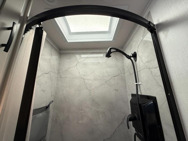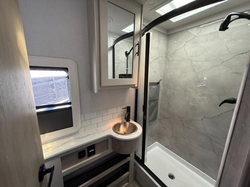 A full bathroom with a shower, skylight, and modern fixtures ensures comfort wherever your travels take you.