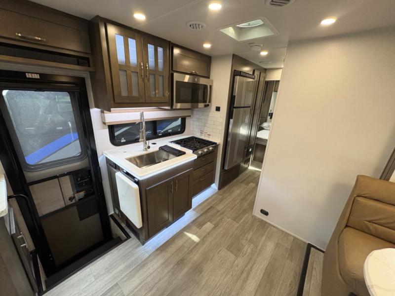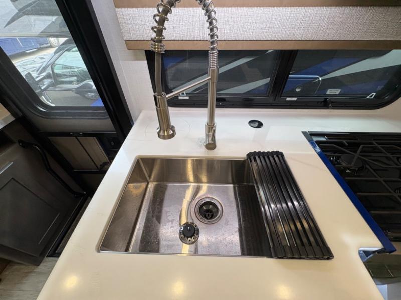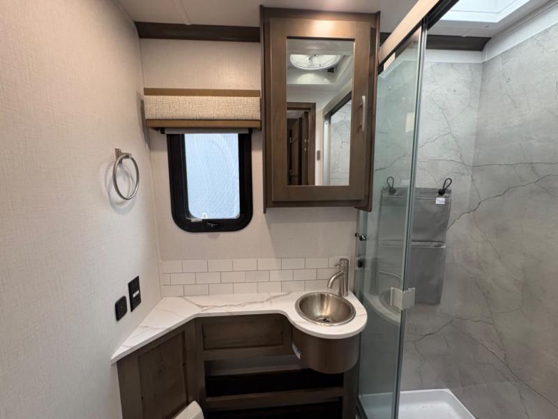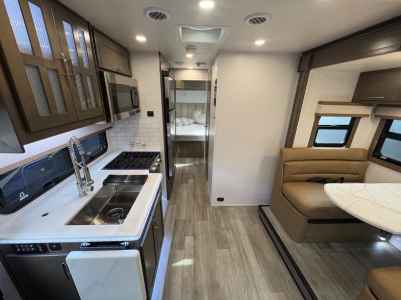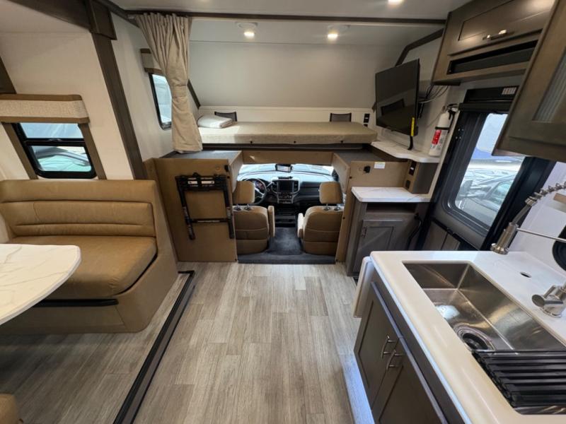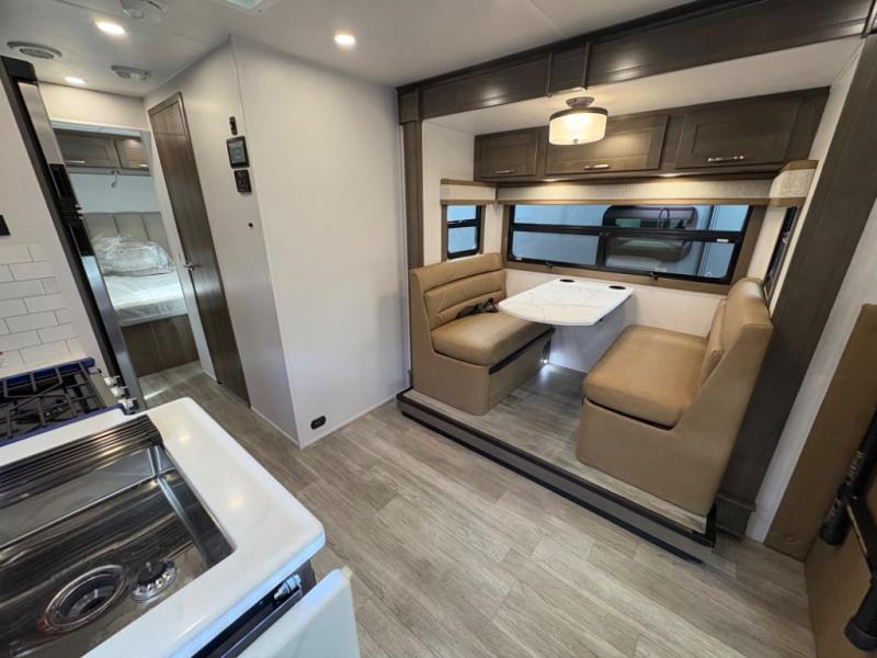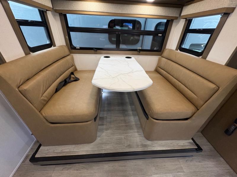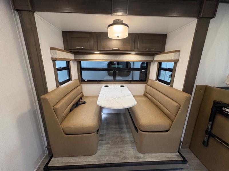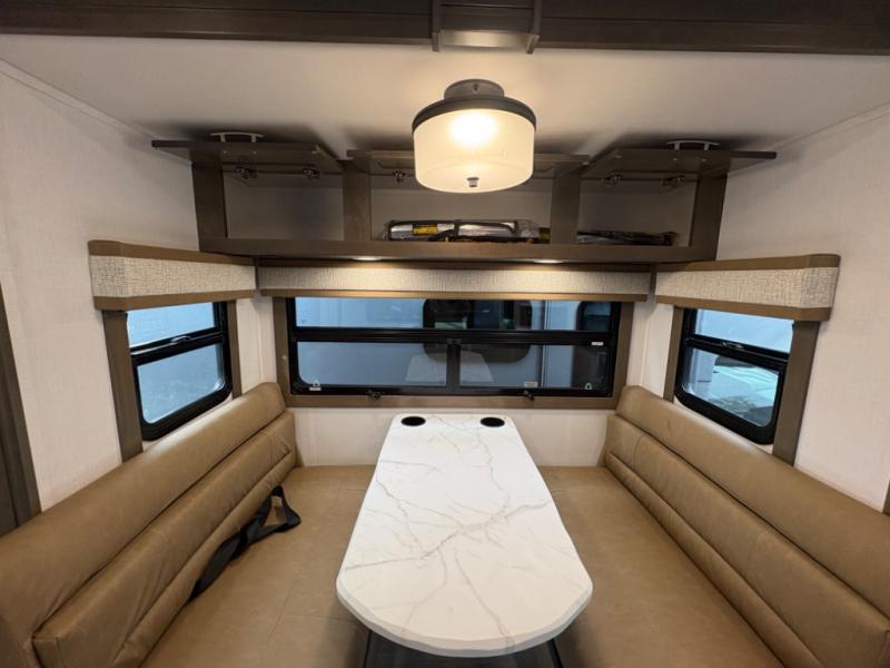 Inside, you’ll find upscale appointments that rival high-end condos—solid surface countertops, premium residential cabinetry, LED lighting, and a spacious full bath. The living area boasts a Dream Dinette, theater seating (optional), and an overhead bunk for added sleeping space.