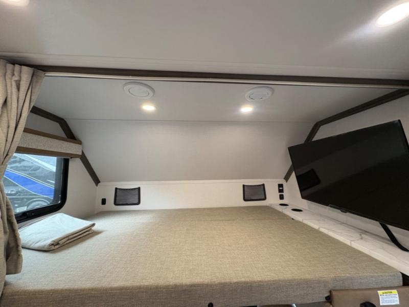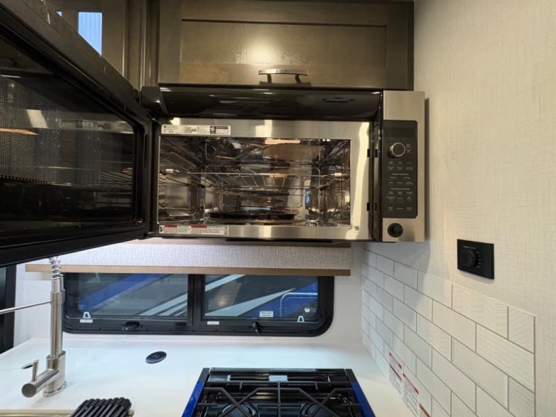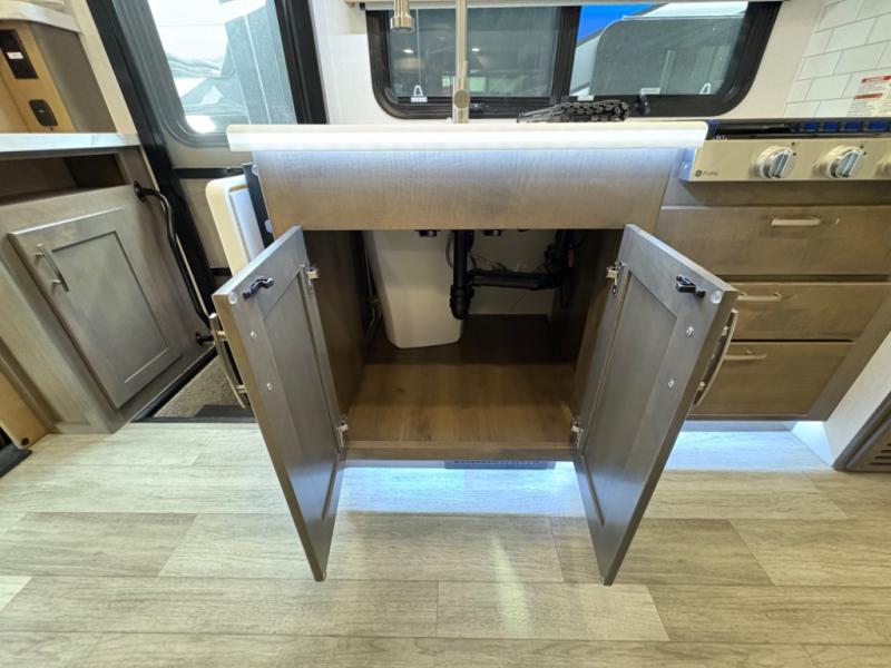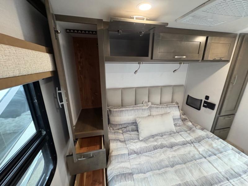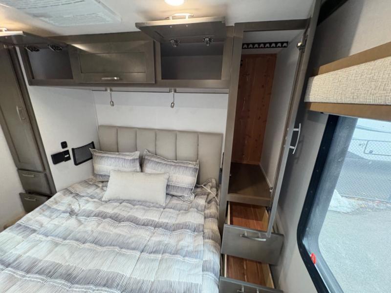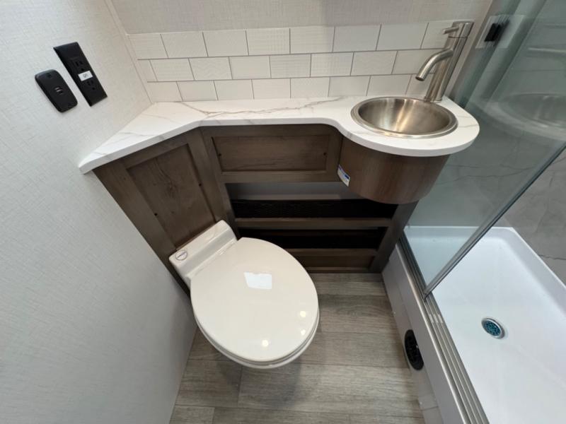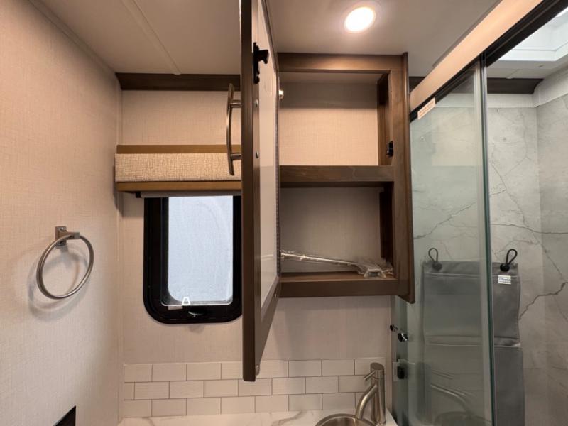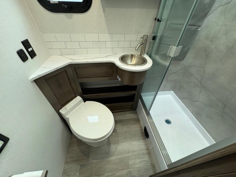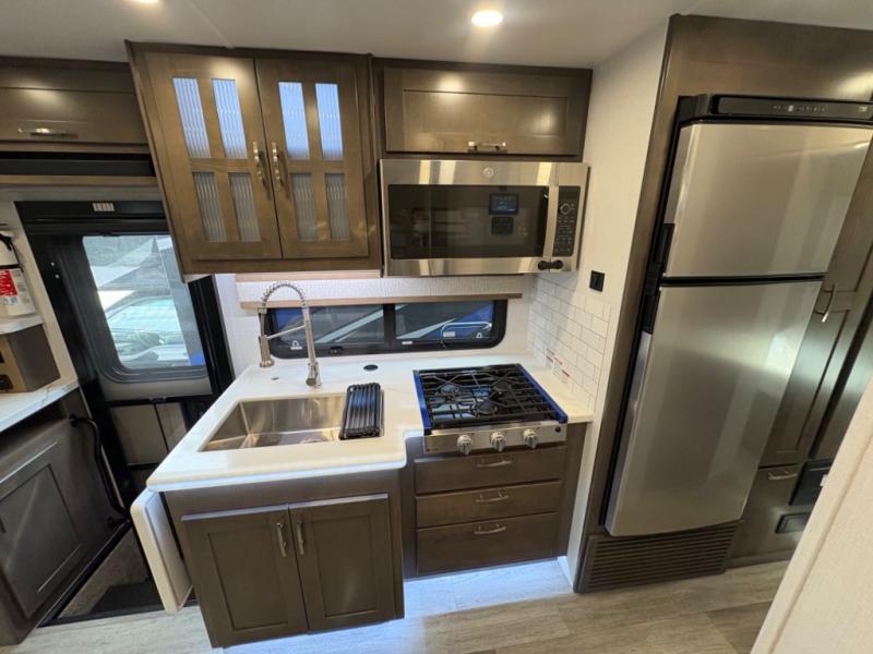 Inside, you’ll find upscale appointments that rival high-end condos—solid surface countertops, premium residential cabinetry, LED lighting, and a spacious full bath. The living area boasts a Dream Dinette, theater seating (optional), and an overhead bunk for added sleeping space.